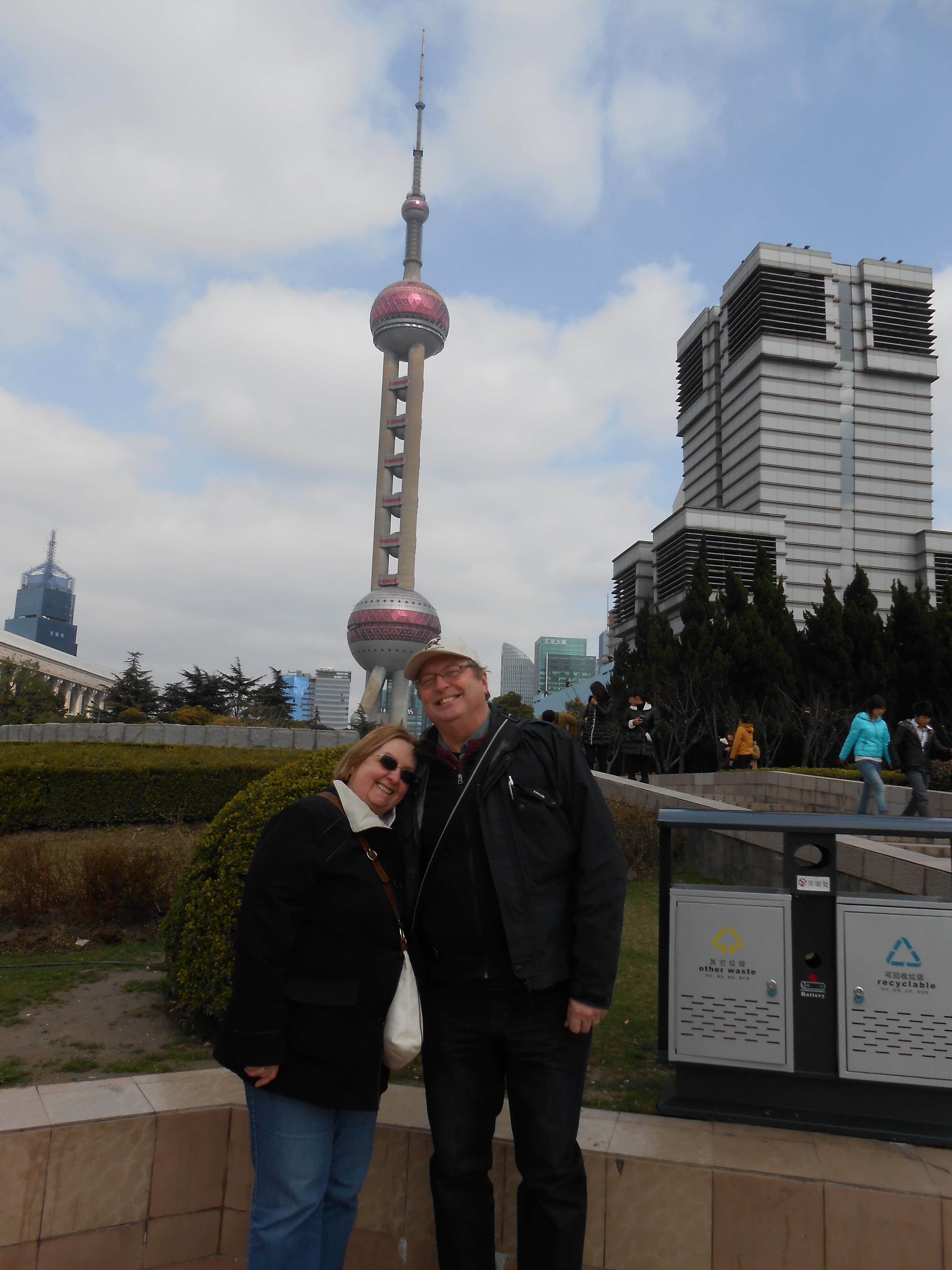 Today we took the fast train on a day trip to Shanghai – a 70 minute trip travelling at speeds up to 300 kilometers per hour. We were accompanied by Stellar and Maggie, and met by Ron’s friend Joan upon arrival in Shanghai. Shanghai is the largest city in China with a population of over 23 million people – almost like the whole of Canada stuffed into one city! The city is bisected by the Huangpu River. The Bund, the historic centre of the city is on the western bank of the river, with the newer financial and commercial centre of the city on the eastern bank. This provides an eclectic mixture of modern and older architecture and an impressive skyline.
