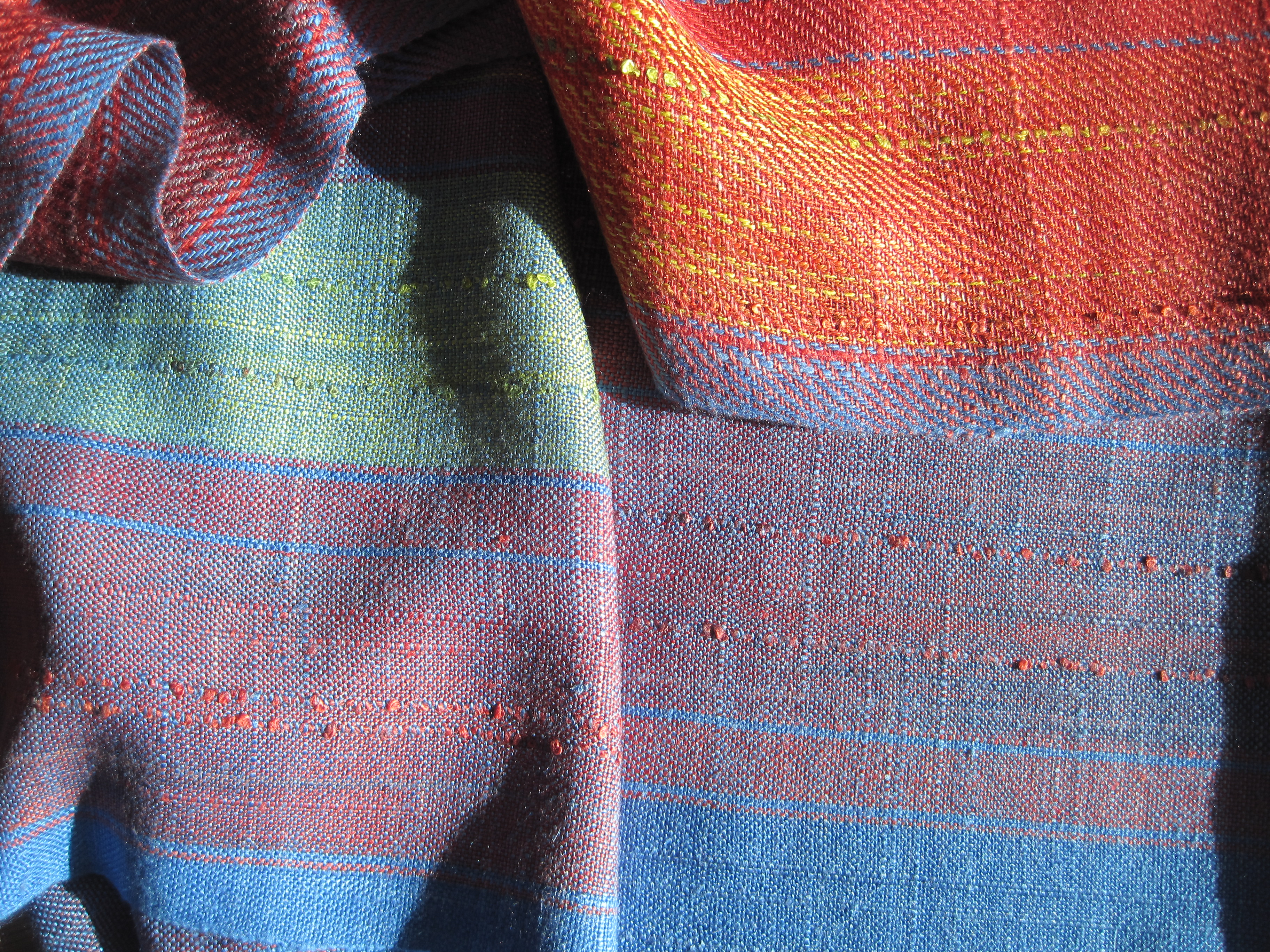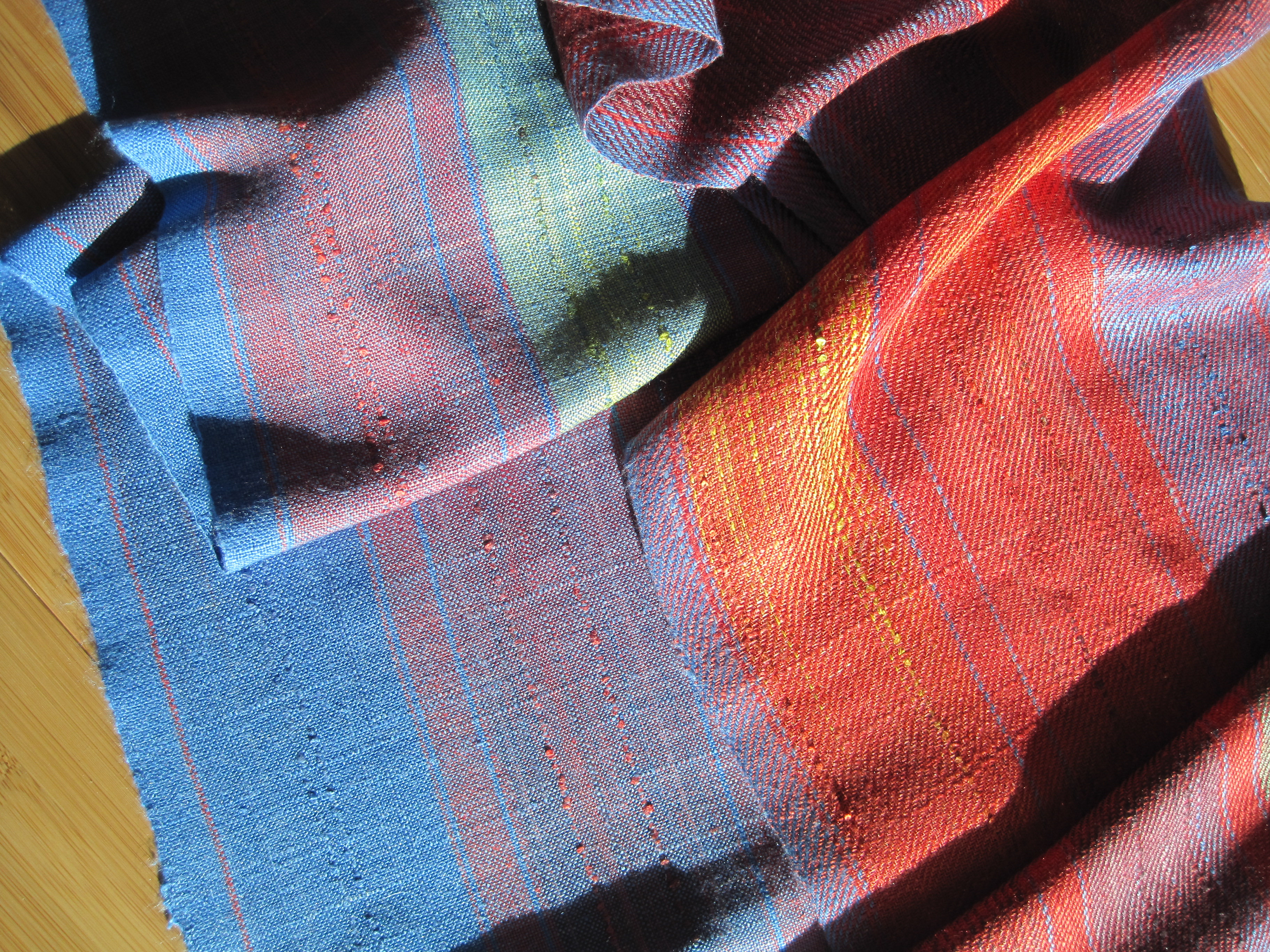 The silk warp that I struggled so hard to get on the loom, to the point where I almost abandoned it, has paid off handsomely with two vibrant and fantastically drapable scarves.  I wove one scarf in plain weave with a blue weft, and one scarf in twill with a red weft.  The dip-dyed warp provided runs of yellow, green, blue and red.  I’m so happy with the results.