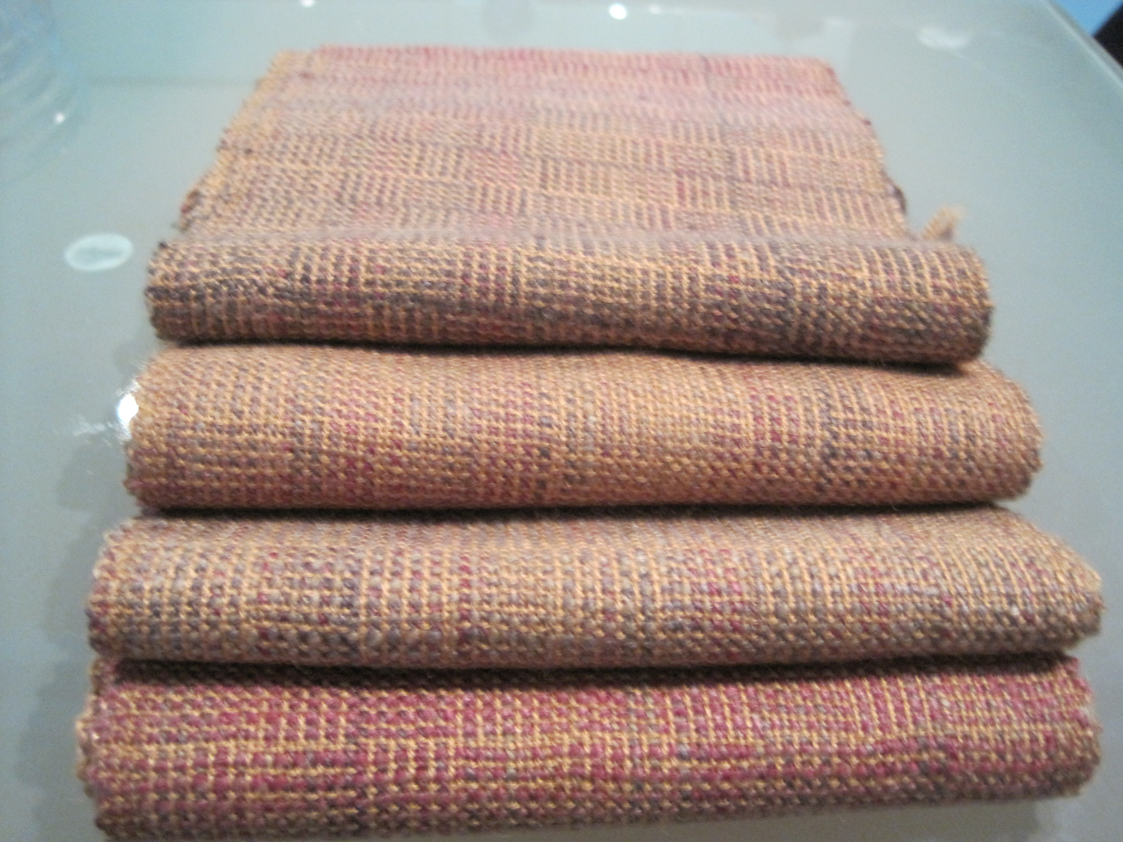 Here are my latest weaving efforts. I started with 100 gms of a wonderful soft braid of fibre from Sweet Georgia. The blend was 50% merino, 25% bamboo viscose, and 25% tussah silk in a colour called tavern. The colours were a blend of dark plum, golden yellow, sage green, purple charcoal and spun into reasonable long lengths of mixed colours. I spun two bobbins of singles and then plyed them together letting the colours fall where they may in random loveliness. This yummy yarn was soft to the touch and glowed with the silk and bamboo content.