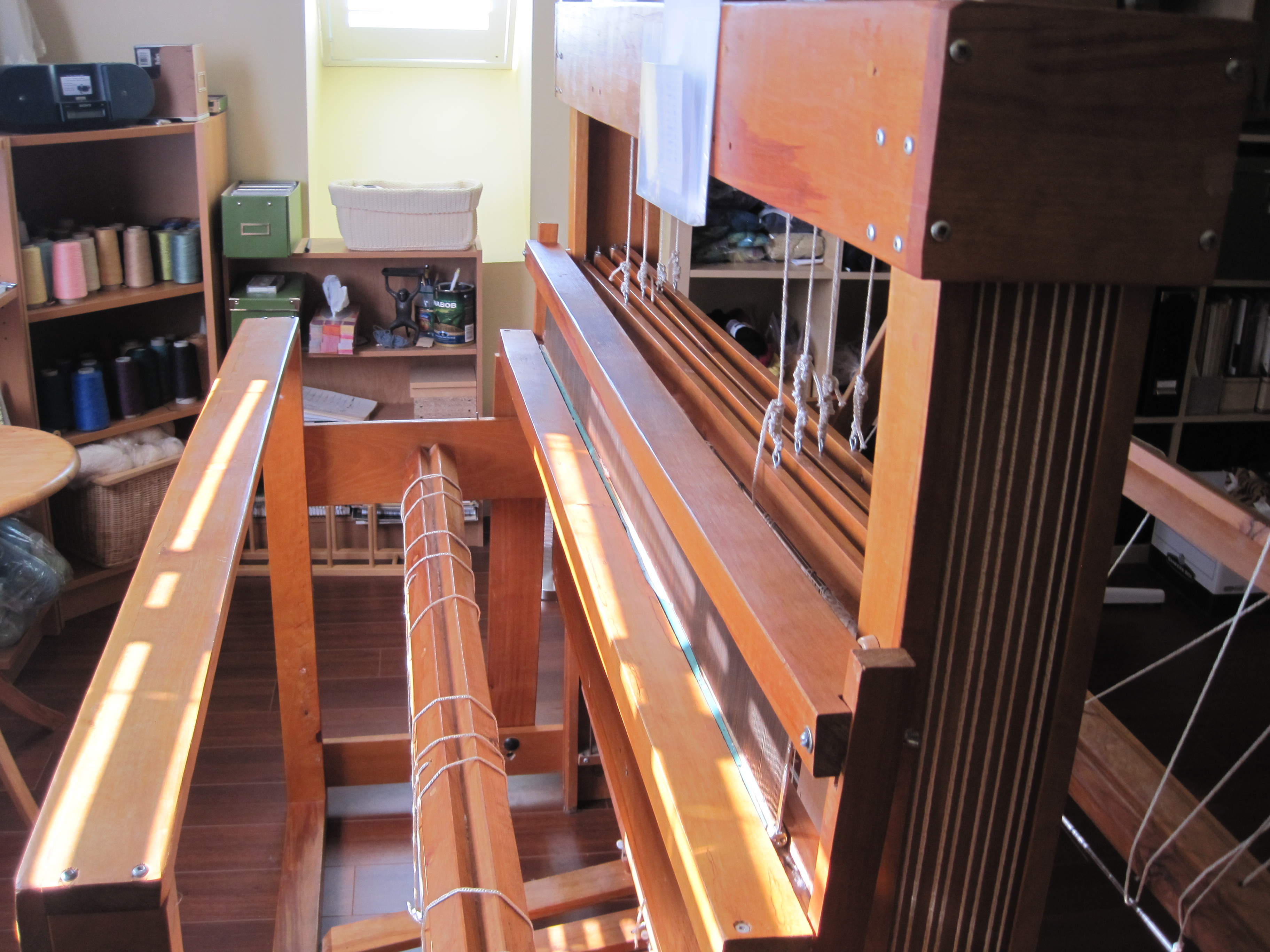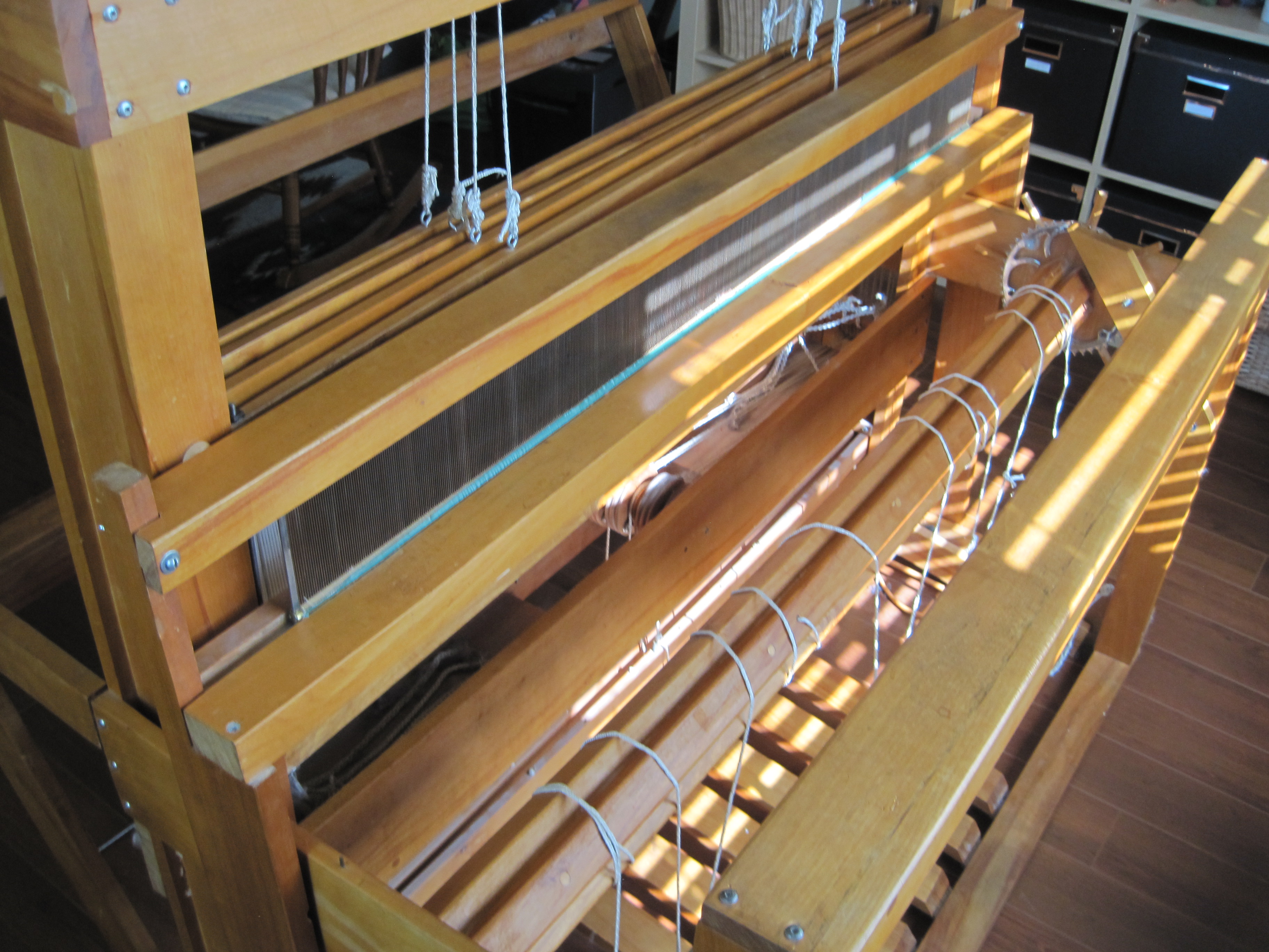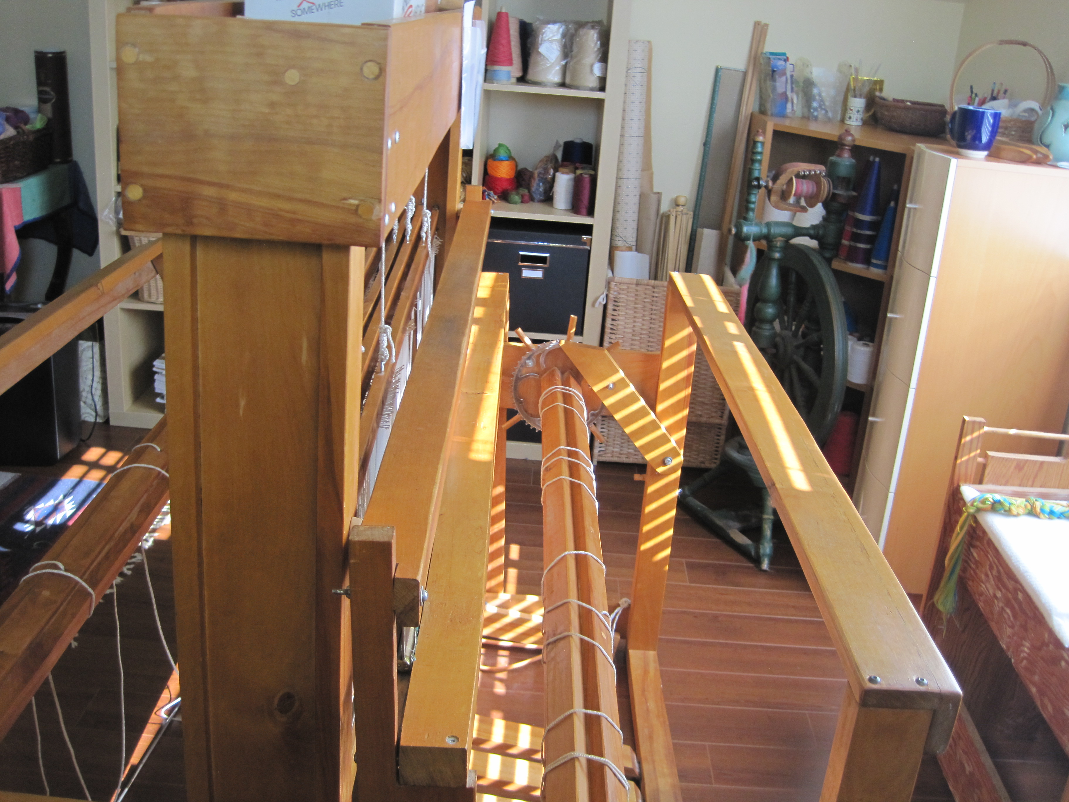 The Queen has reigned supreme over my various weaving studios through the past thirty years. She was built for me by my father-in-law, Don Mitchell, in 1982 using the book Loom Construction by Jeri Hjert and Paul Von Rosentiel. She has served me steadily since then. She is a simple 4-shaft loom, efficient and steady.