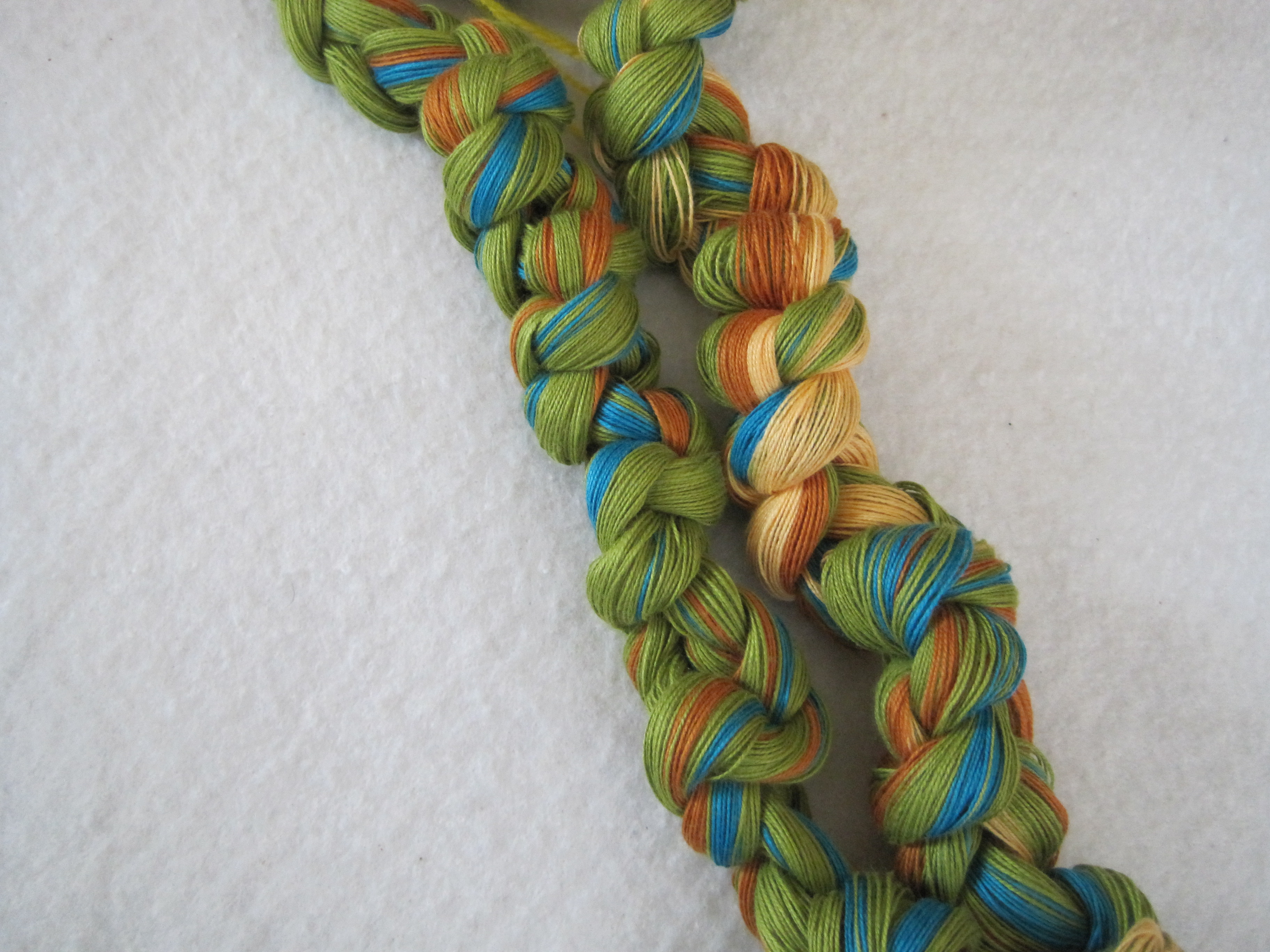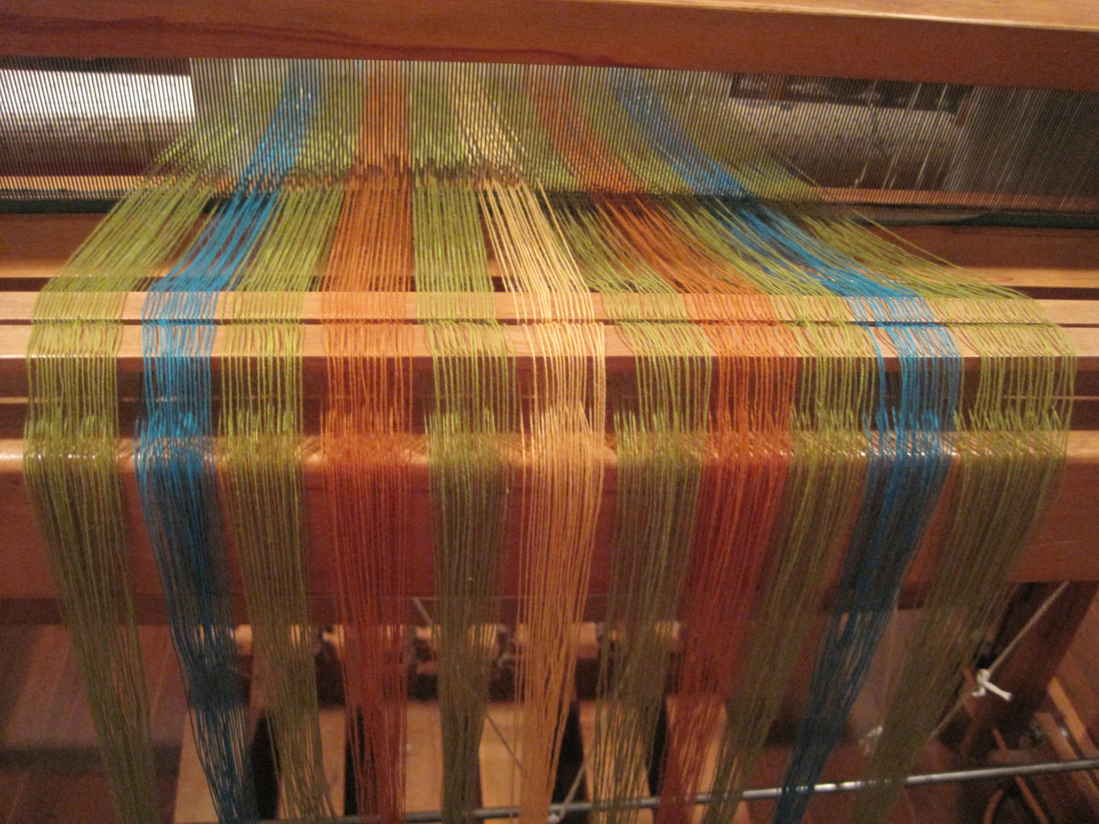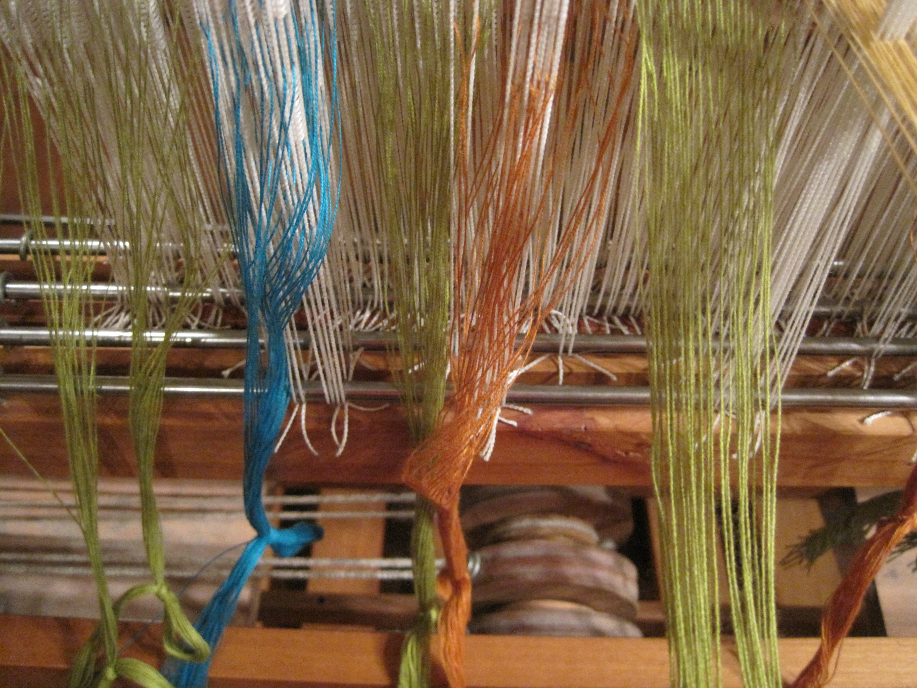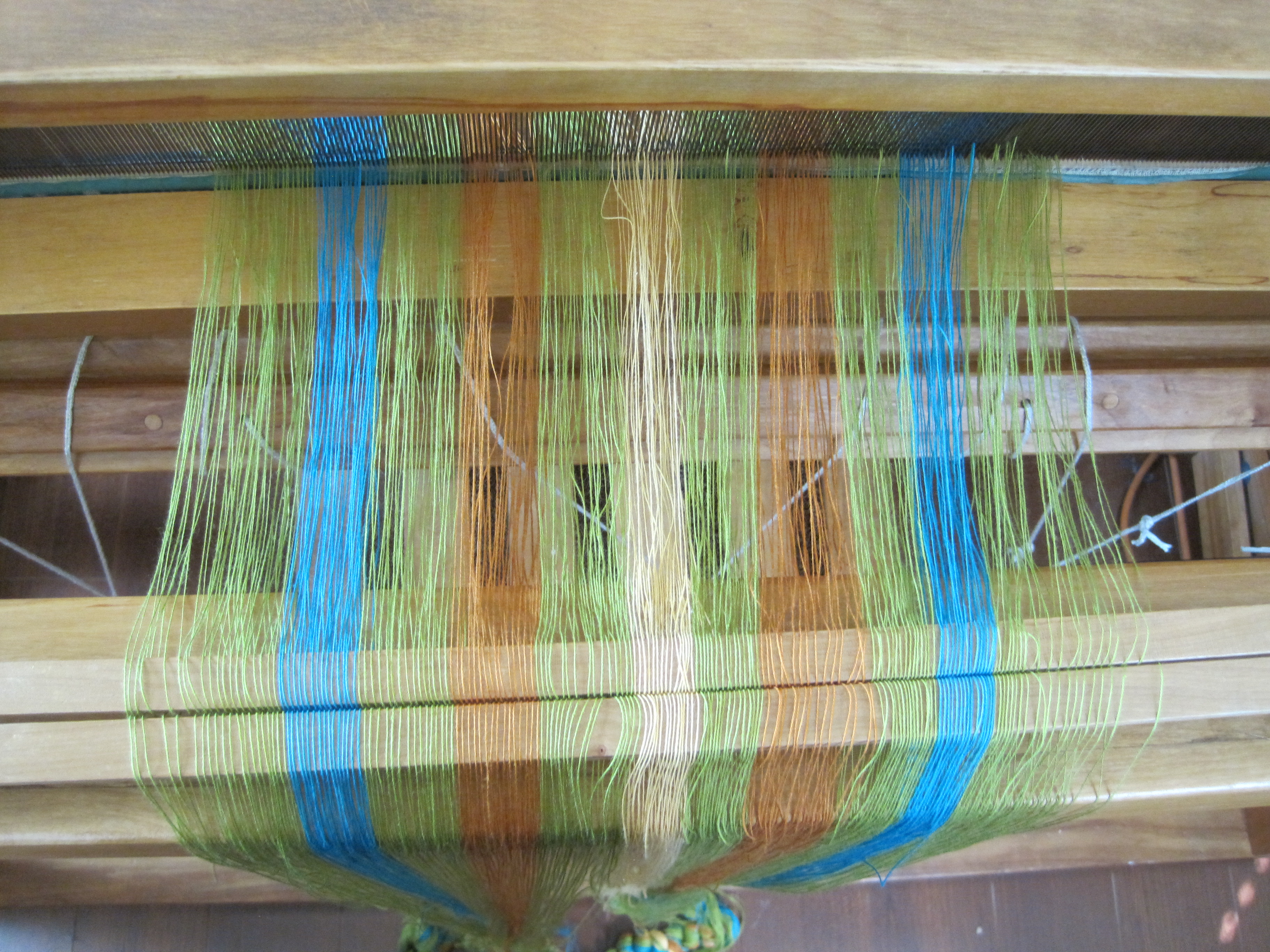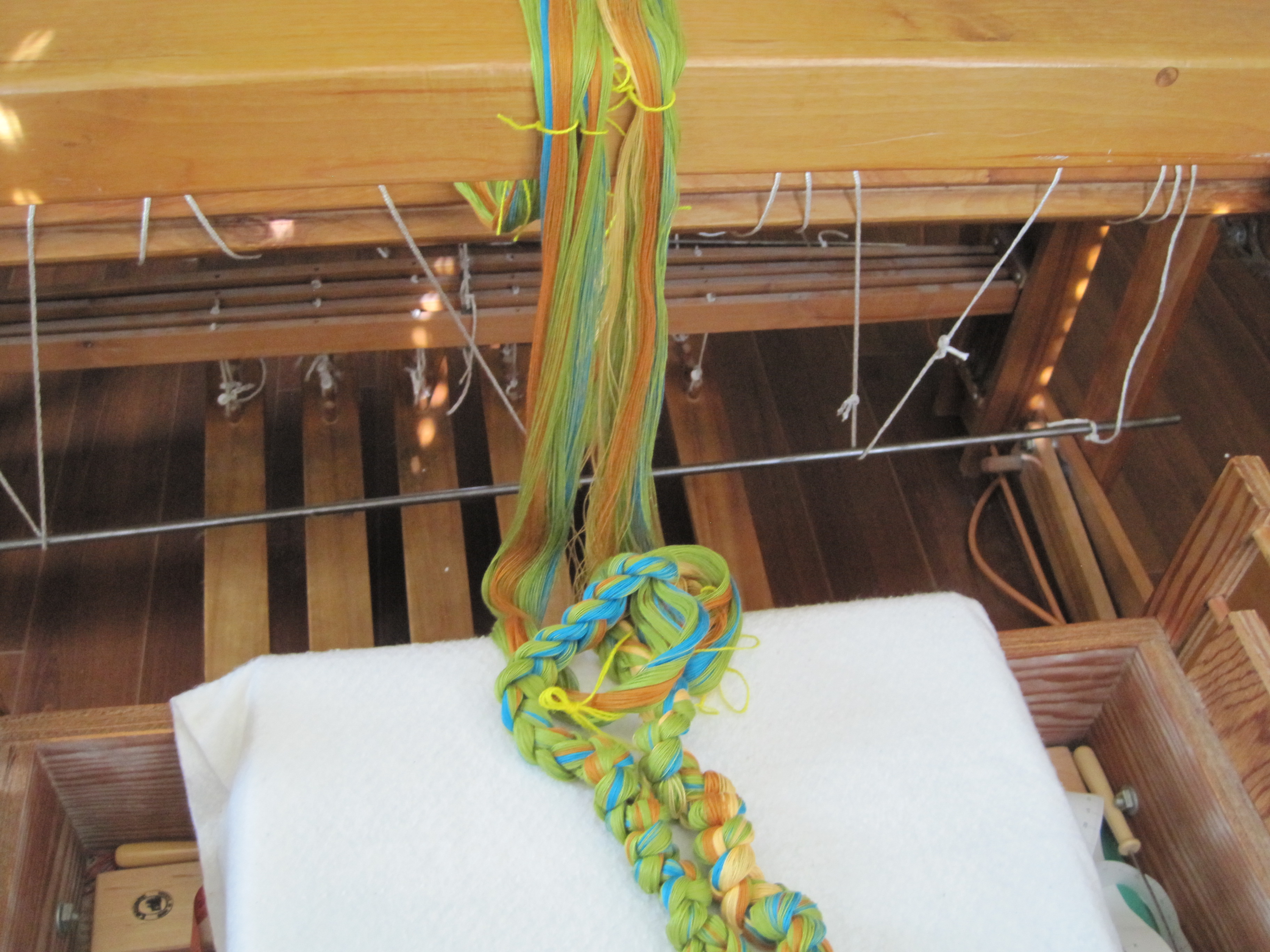 The cross is tied to keep the threads in order, and the warp is chained to prevent tangling.  The warp is brought to the loom.