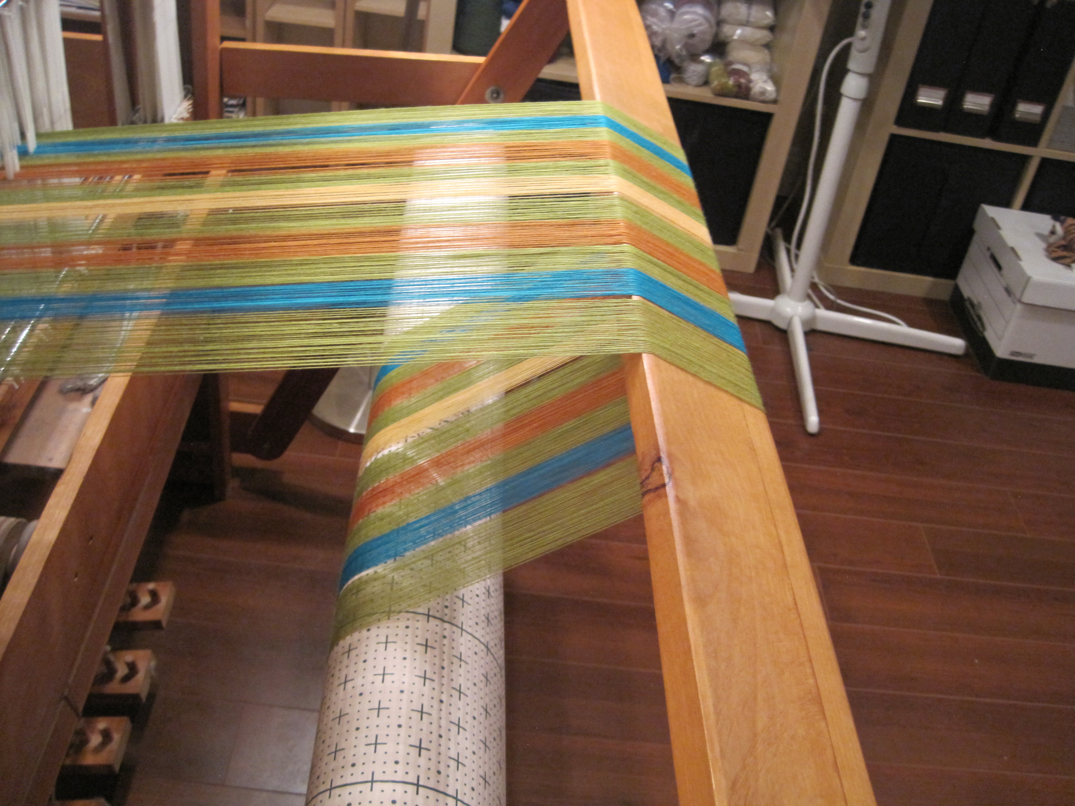 When all the warp is wound on, I tie the end of the warp to the front beam rod.