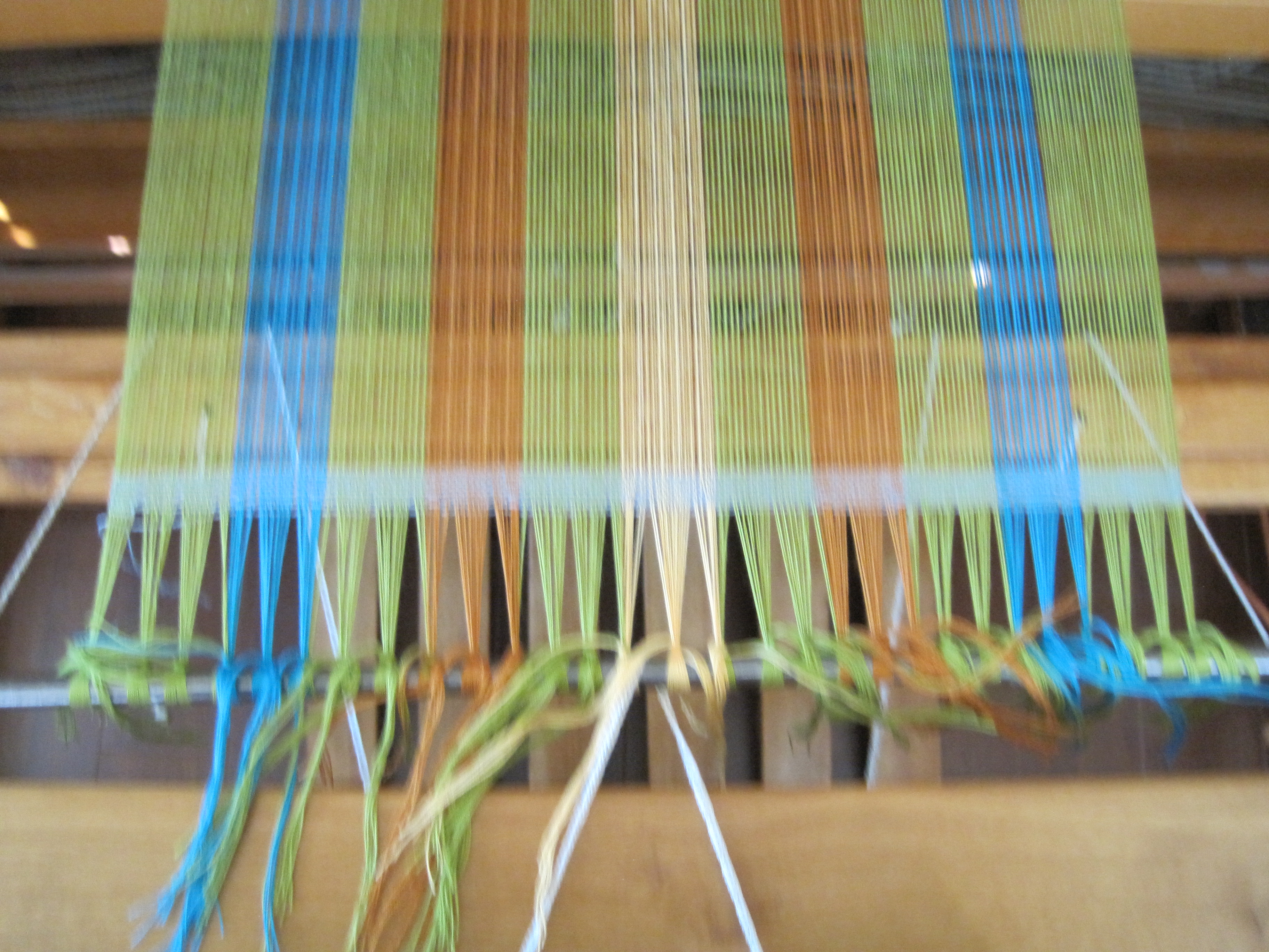I ensure the threads run straight through the lease sticks to the reed at the front of the loom.