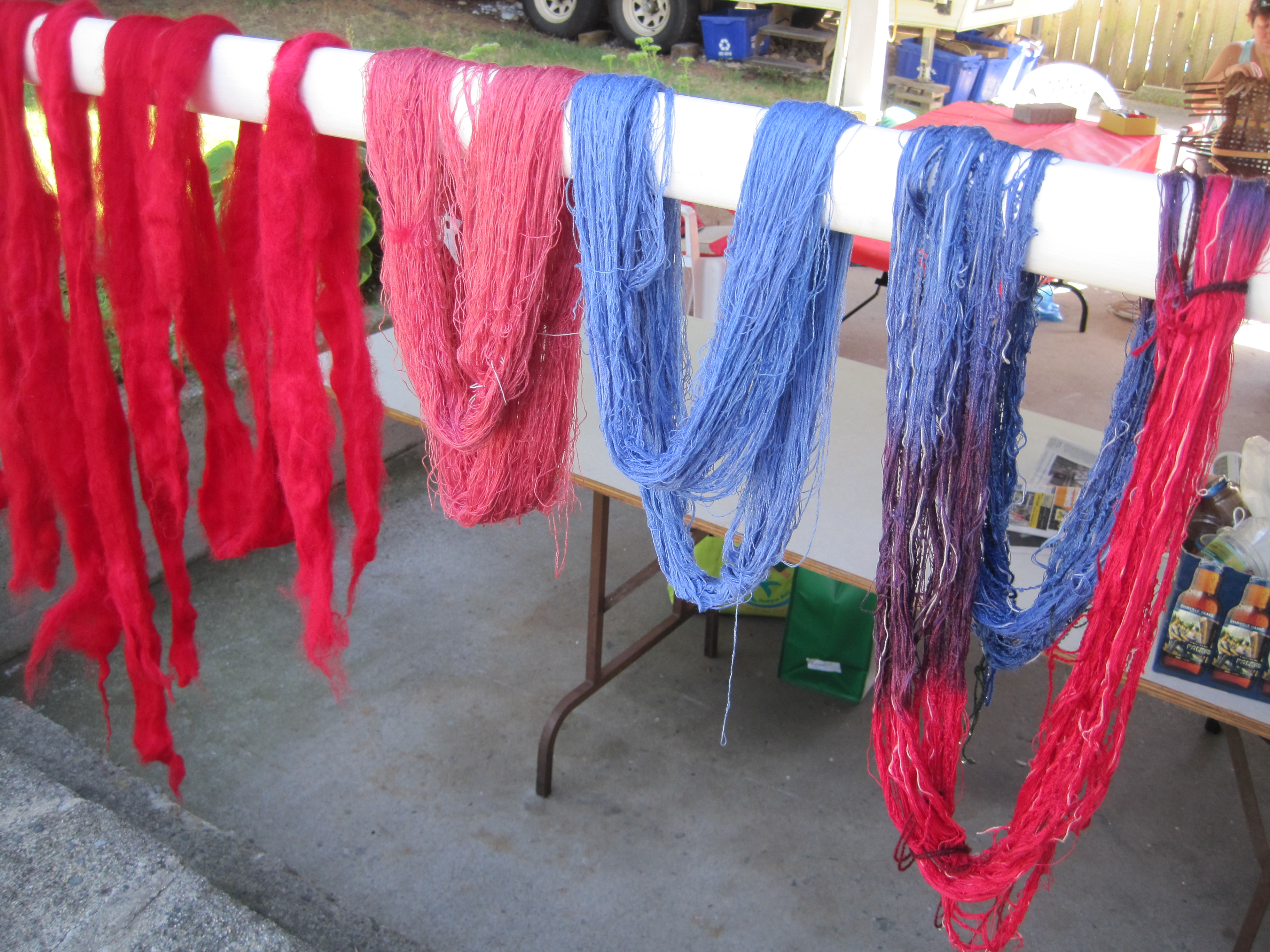 Marilyn had started a dye pot in a lovely raspberry red – she dyed wool roving fibre, and I dipped one end of my pre-measured silk warp in the pot. After we took these pieces out – the dye had not yet exhausted, so I added a skein of tussah silk that will be a coordinating weft for the scarves I intend to make.