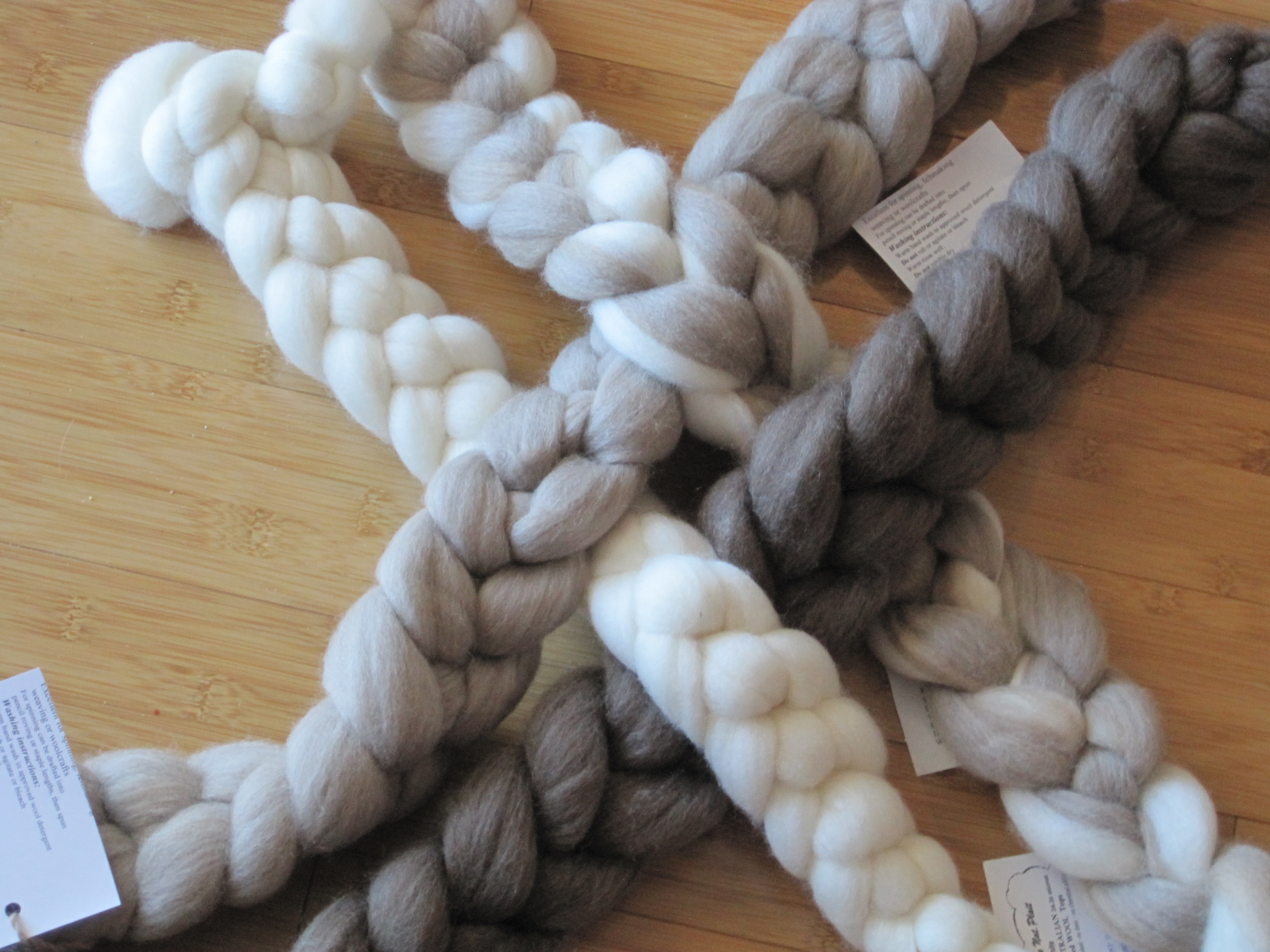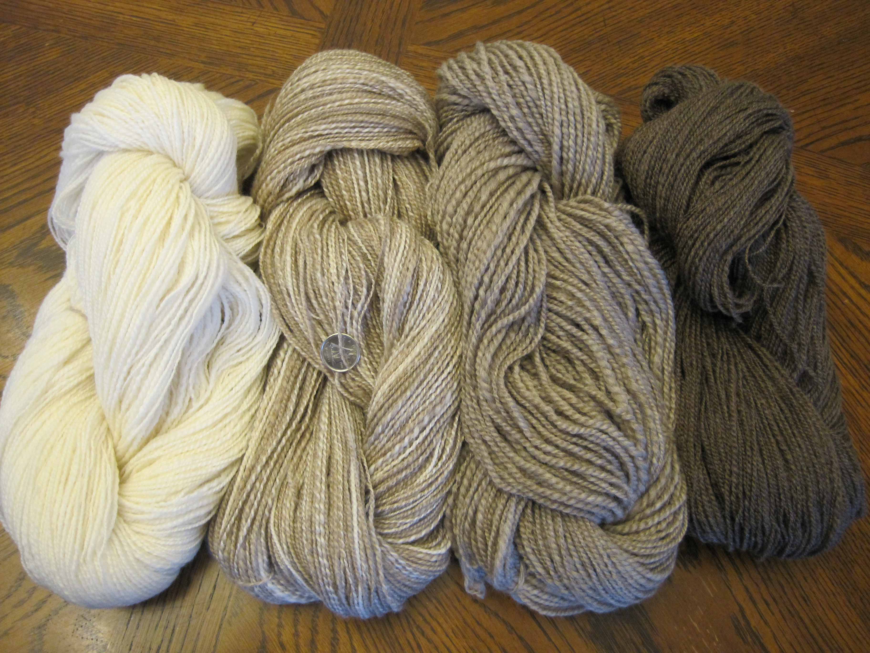 I’m not sure what I am going to make with it yet, but loved the experience of spinning these natural coloured Moorit wools from Western Australia. It spun up so easily, and I believe the wool is a Corridale/Merino cross. Yardages vary, getting thinner and smoother as I went along: Silver-196 yds; Light – 353 yds; White – 367 yds and Charcoal – 470 yds.