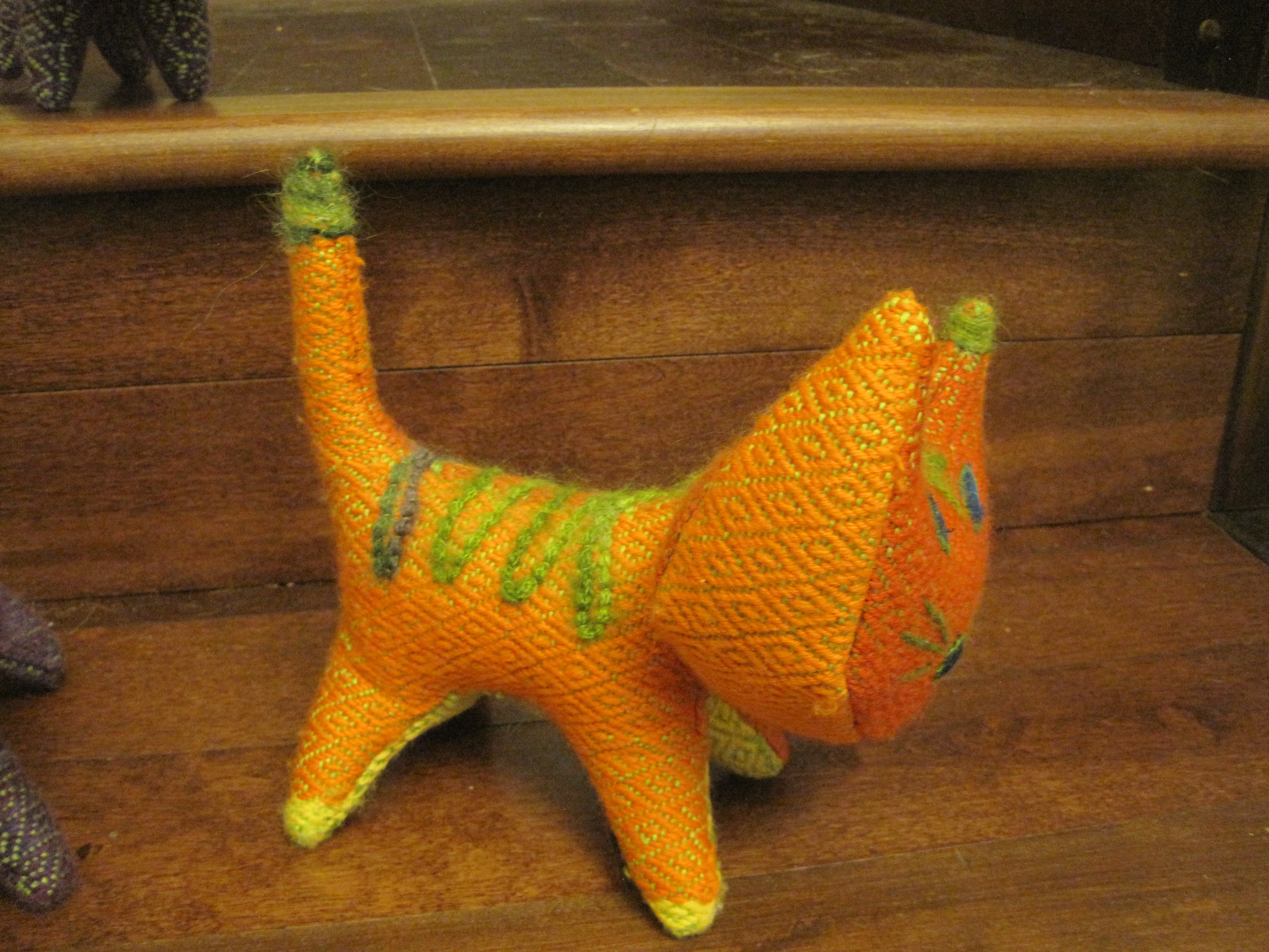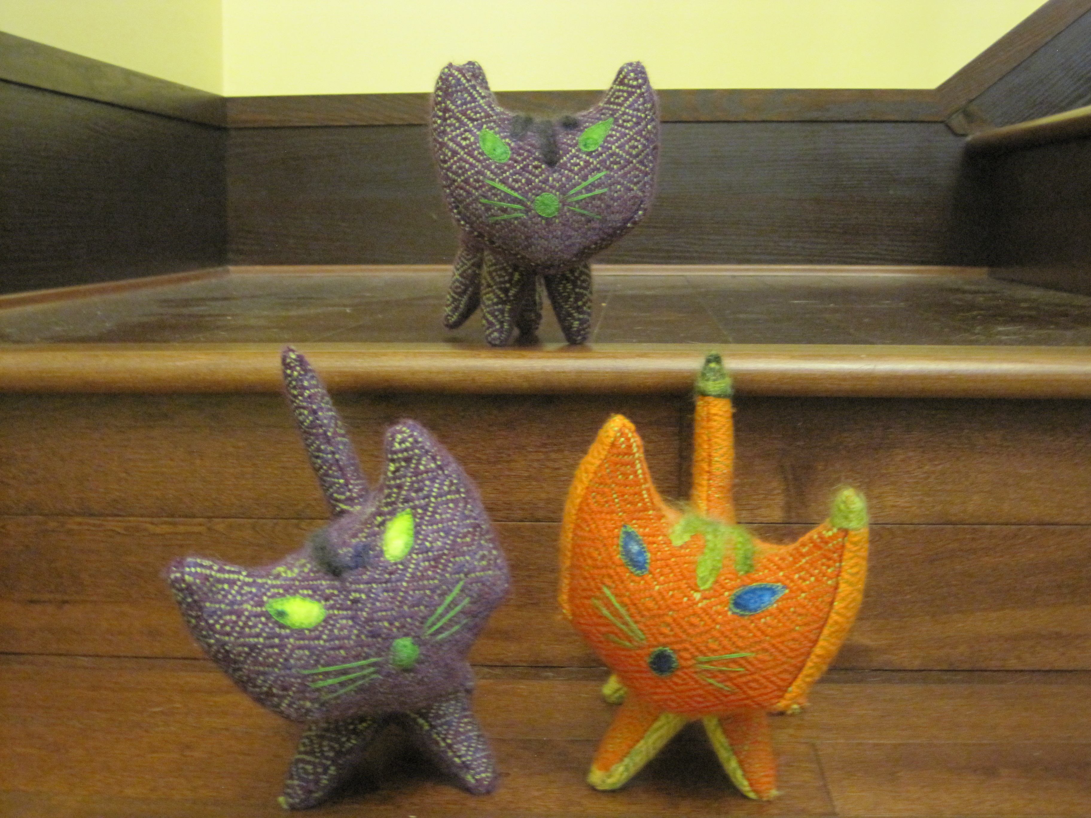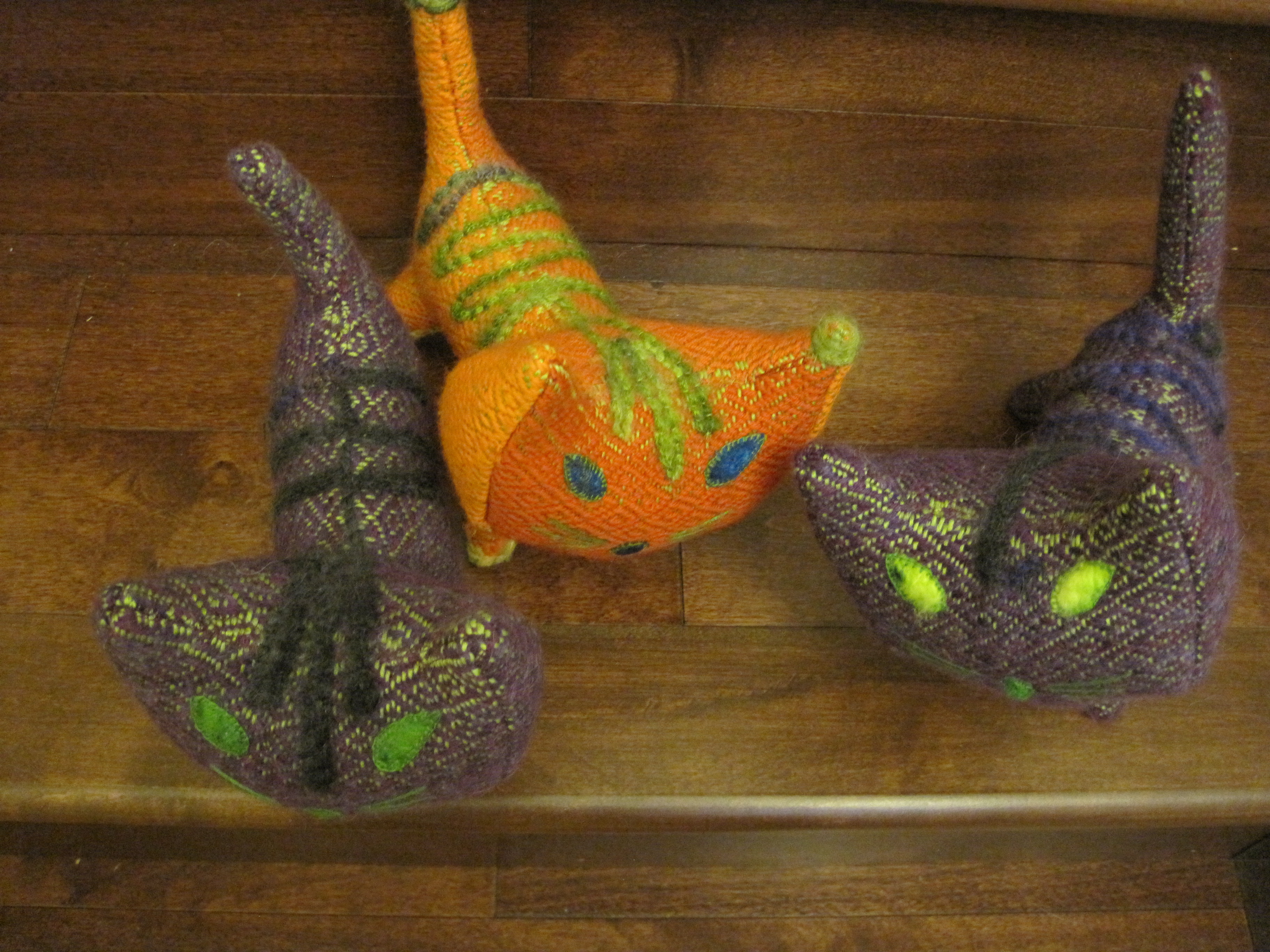Also fun, my house is being visited by a plethora of colourful handwoven cats, in response to the Coquitlam Guild challenge.  In the challenge we were given a small amount of luxury yarn, (kid silk haze in purple, brown and green multi-coloured yarn) and a silk cocoon, and needed to incorporate these into a weaving (or spinning) project inspired by the painting “A Plethora of Cats” by Dr. Seuss (Theodor Geisel). And so these cats were born.  The bodies are made of a handwoven cats eyes pattern, the luxury yarn forms pattern stripes on the cats backs. The silk cocoon was dyed and cut up for the cat’s eyes and noses.  Just too much fun!