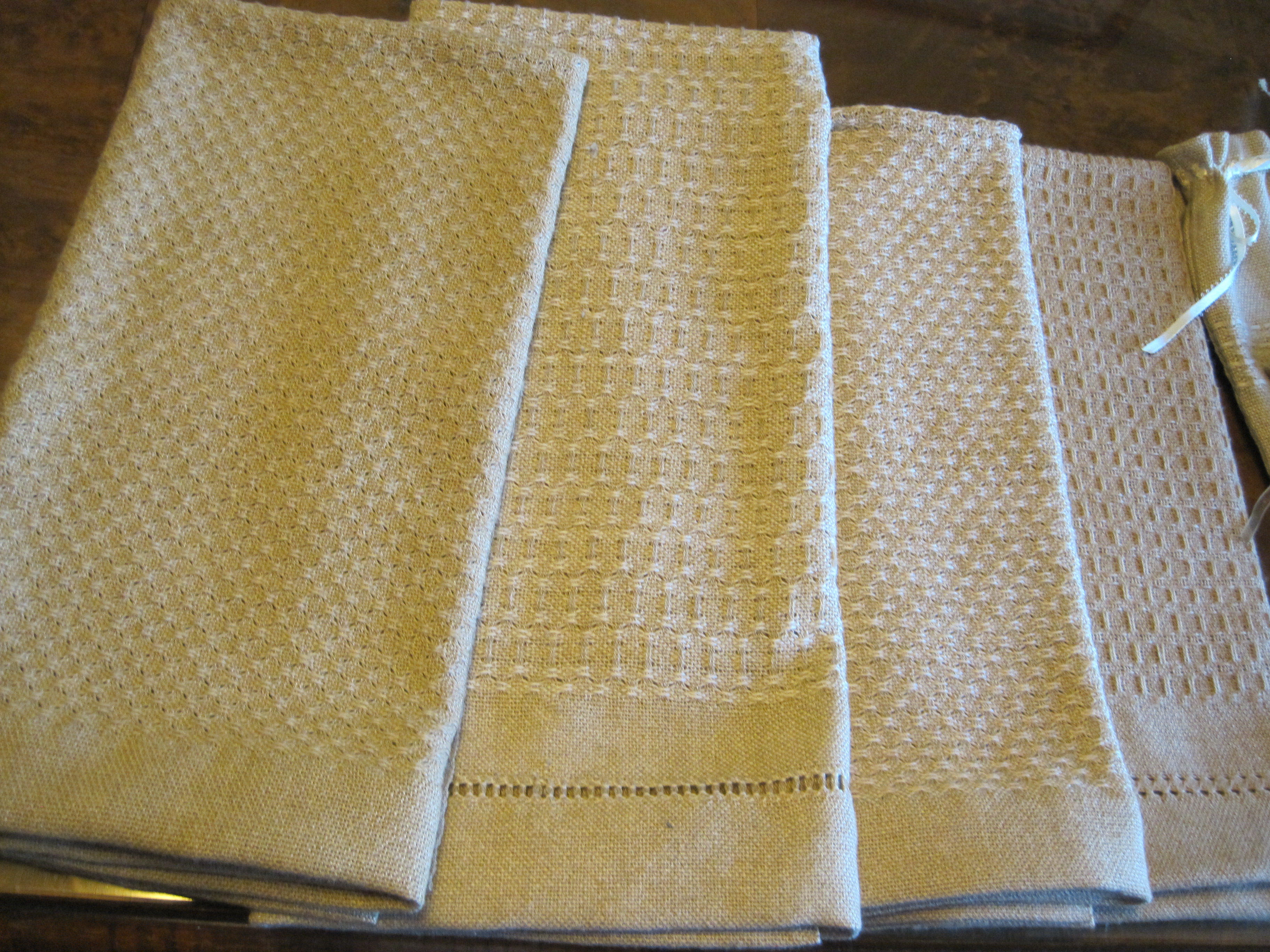 These are woven of naturally coloured cotton from FoxFibre in four different colours.  The warp is dark green, and the wefts are dark brown, light brown, light green and dark green.  I love how the colours deepen with washing, and the drape on these towels is amazing.  These are sett at 20 ends per inch and woven at 20 picks per inch.  The cotton is a 2/12 weight.