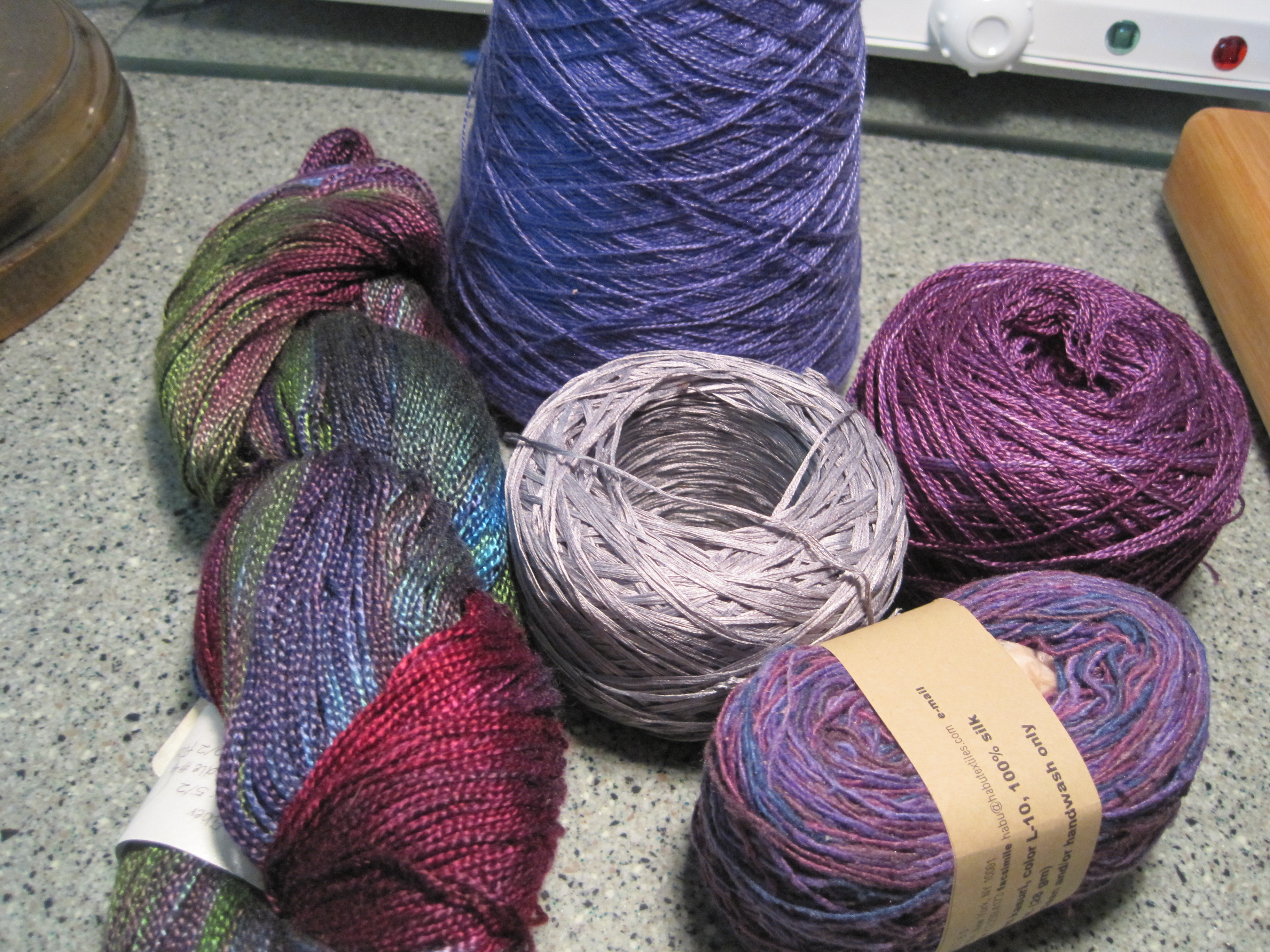 I started with the hand-painted tencel on the left. It has a green-purple theme. I added two other purple tencel yarns, a silk-tweed in purples that has a soft, nubby texture, and a silk straw that has a paper-like rustle.