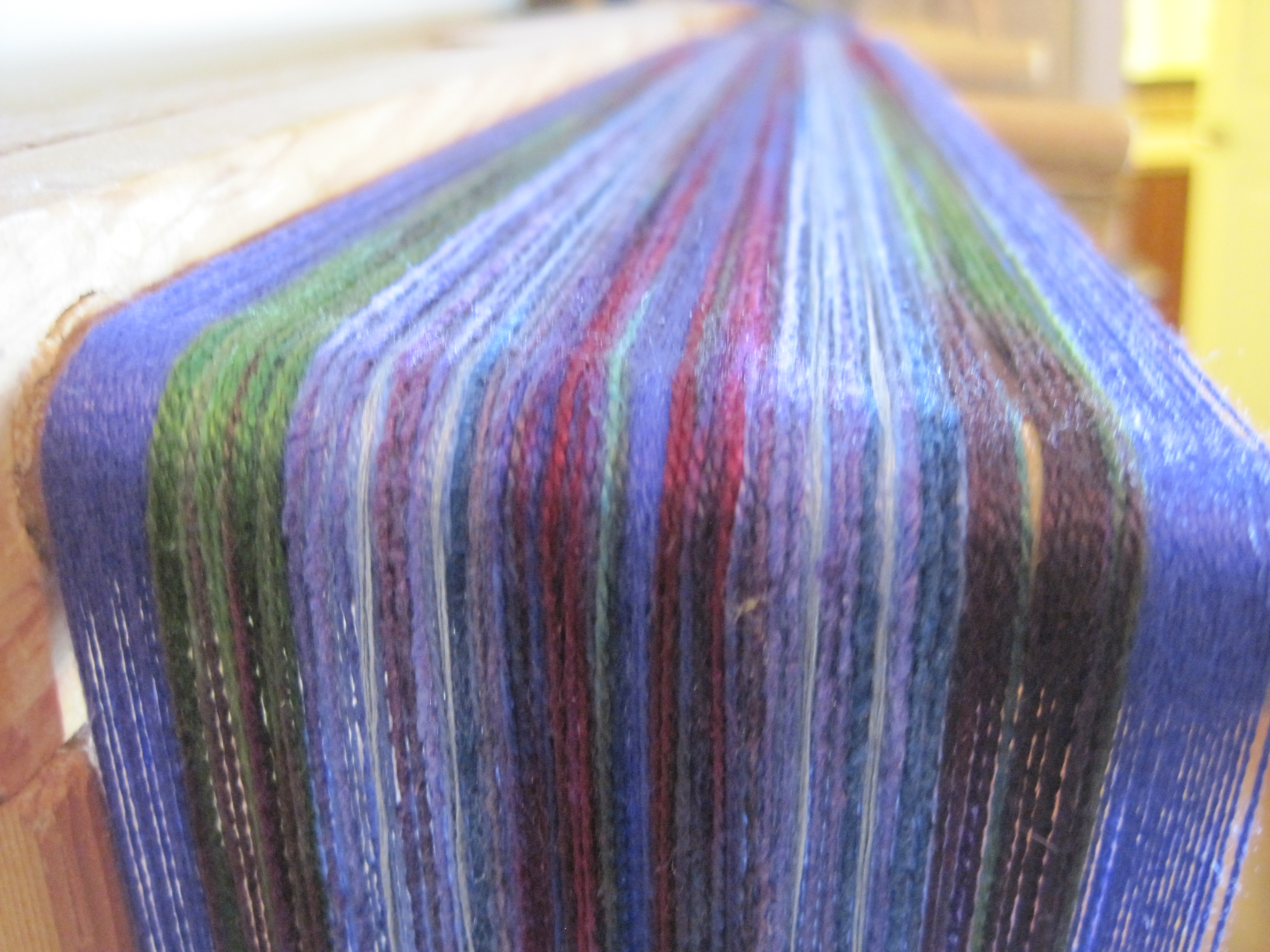 Warping took a little longer than usual because I manipulated the hand-painted yarn to line up the colour blocks.