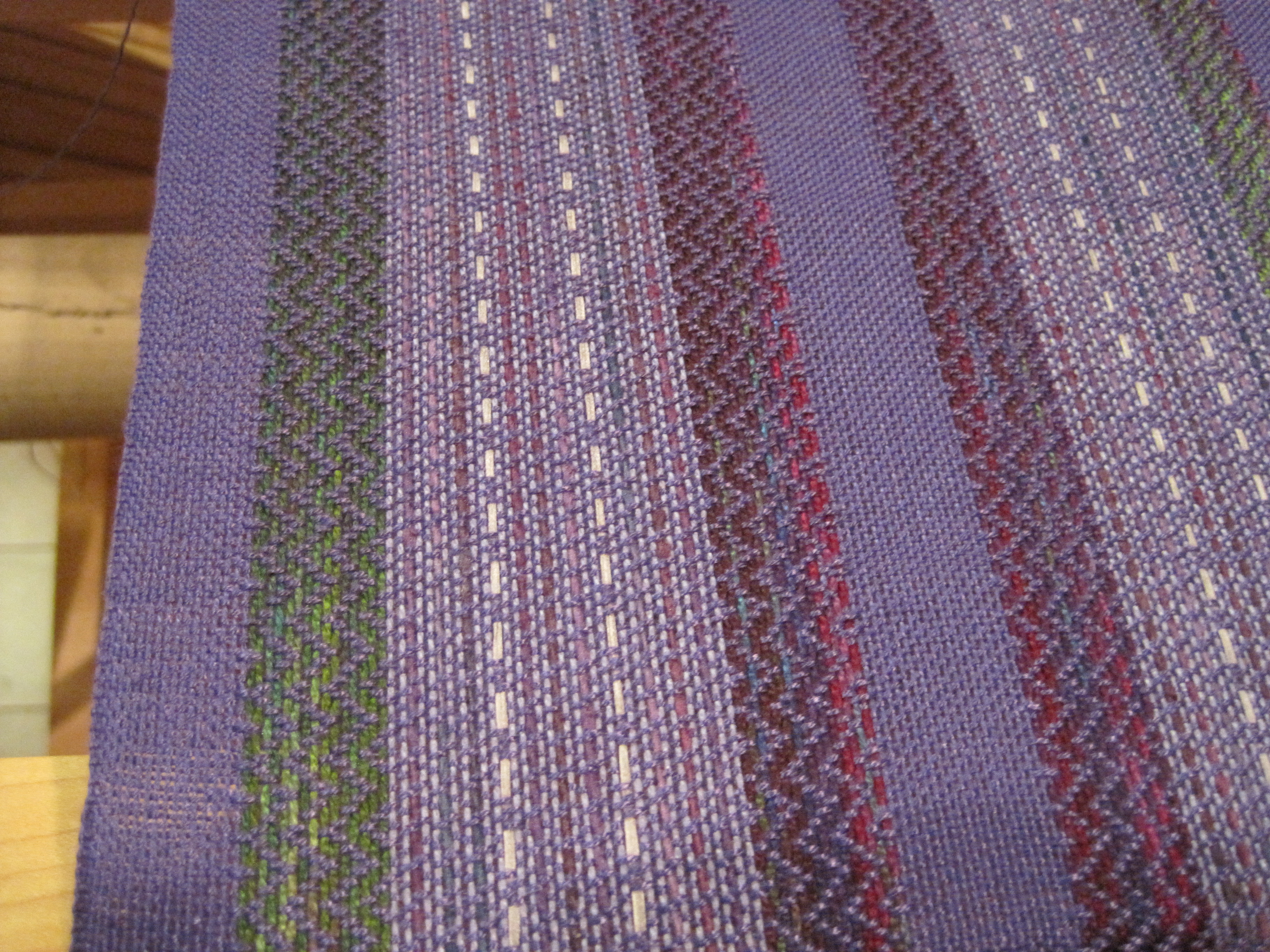 After weaving several projects that involved complicated processes and multiple shuttles, it was a delight to weave something completely uncomplicated. These two scarves practically flowed from the loom. The draft is adapted from Daryl Lancaster’s scarves in the article “Using Color Forecast Palettes for Warp Stripes” in Handwoven March/April 2011(page 32), and combines twill, plain weave and supplementary warps in the same scarf. Thanks, Daryl for the inspiration.