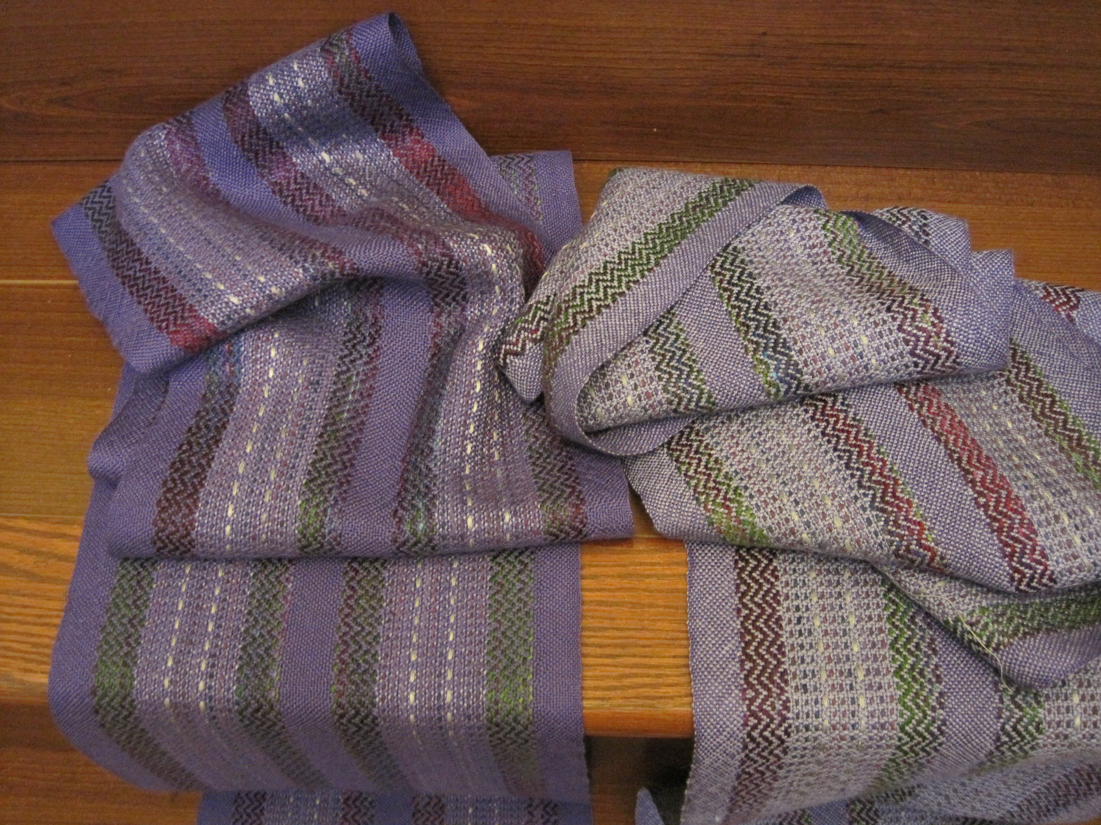 Off the loom, no repairs needed, The ends were twisted and then the scarves had a quick trip through the washer and dryer. Then, just a light pressing was needed, and Voila.