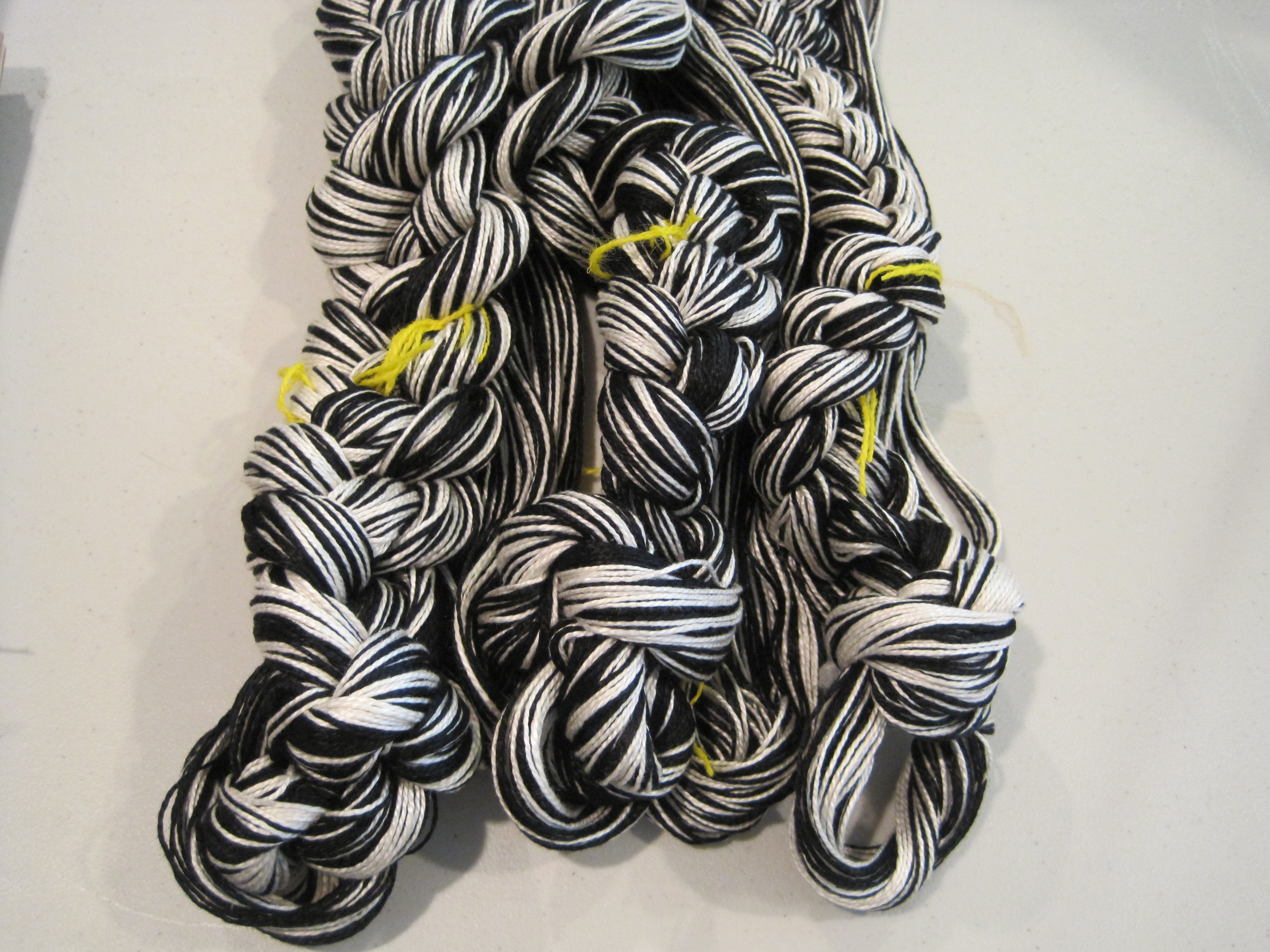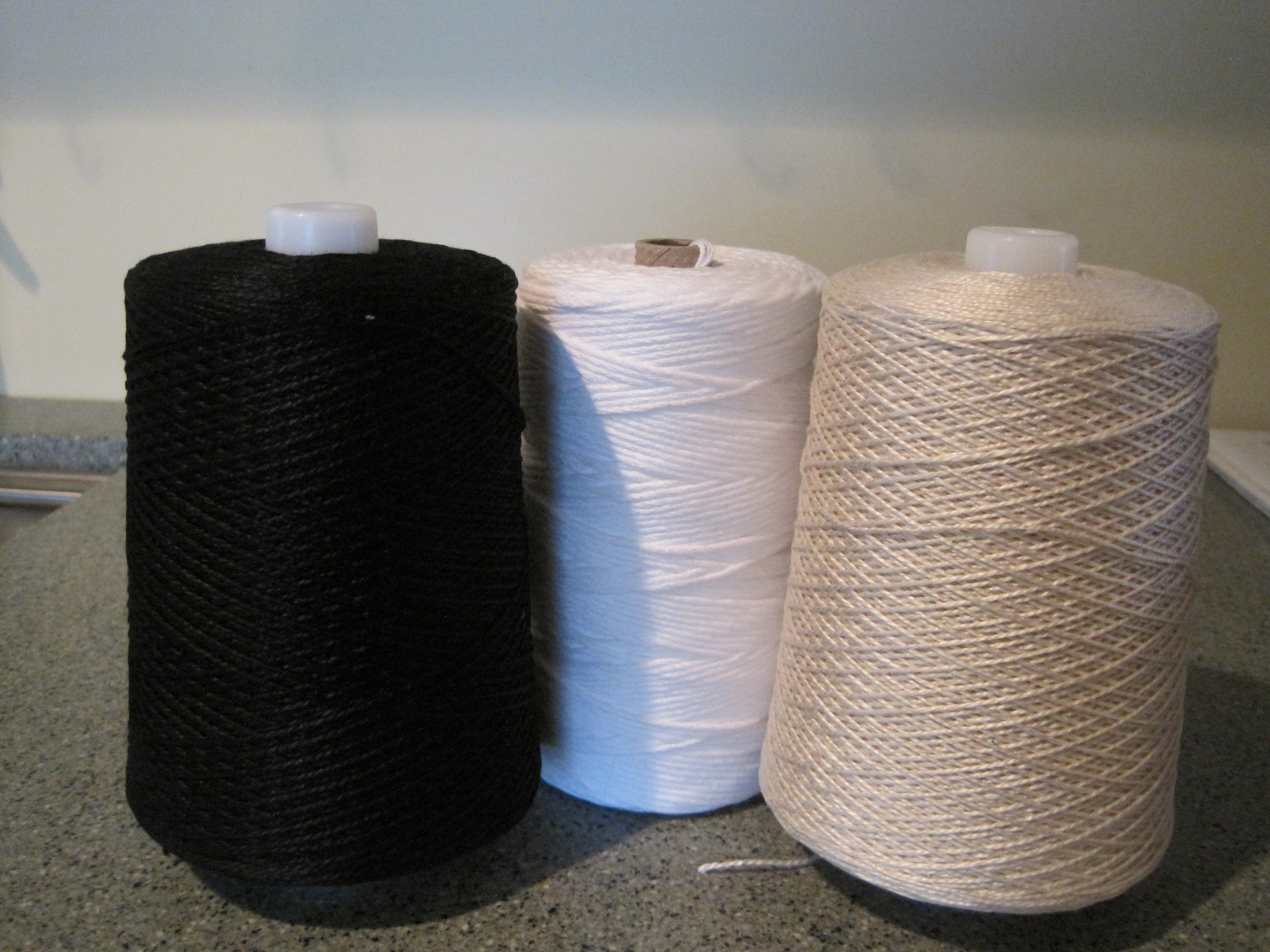 In preparation for the workshop I chose my colours, black and natural, of 3/2 mercerized cotton for the warp and thin weft, and white mop cotton for the thick weft.
