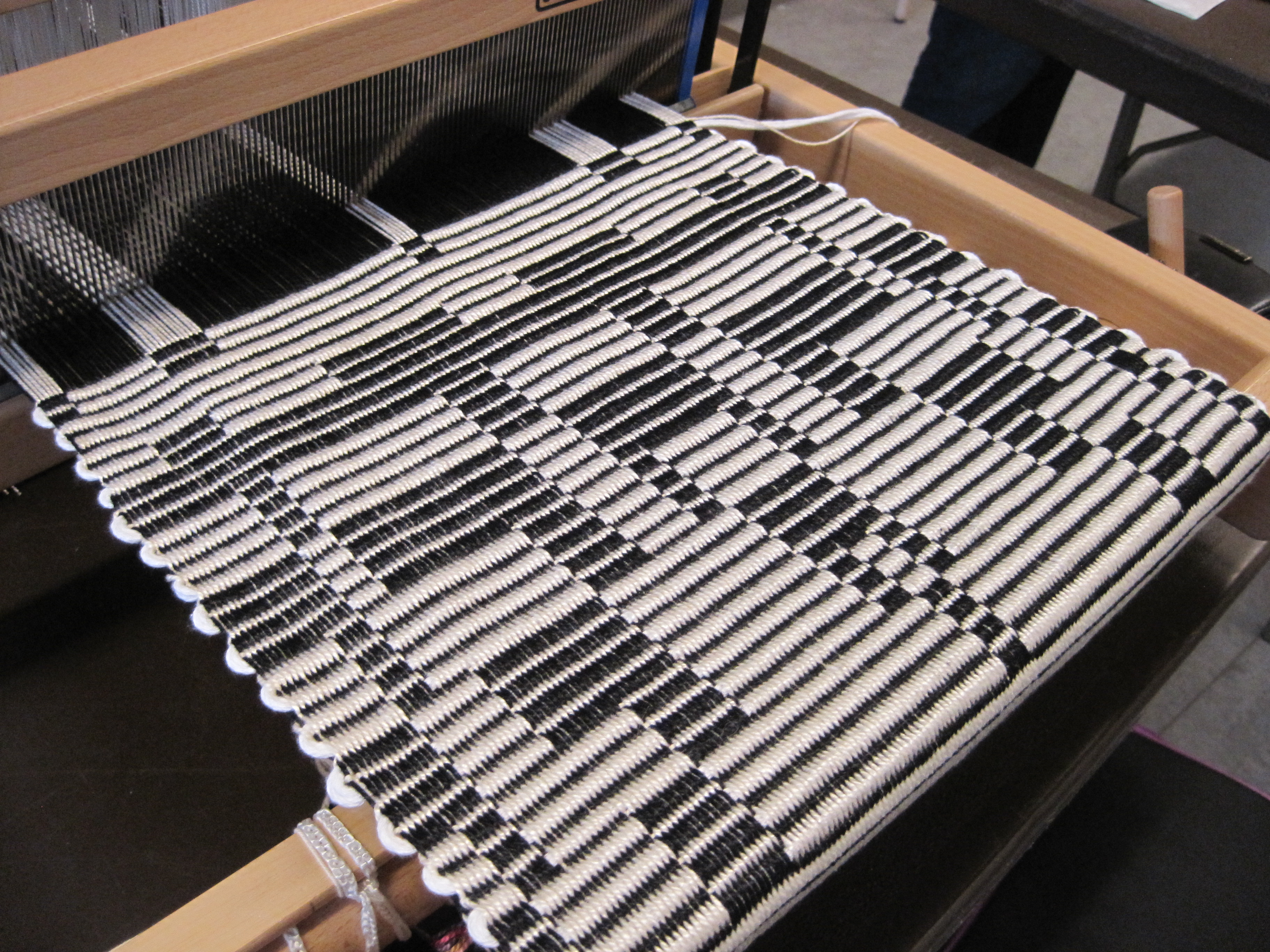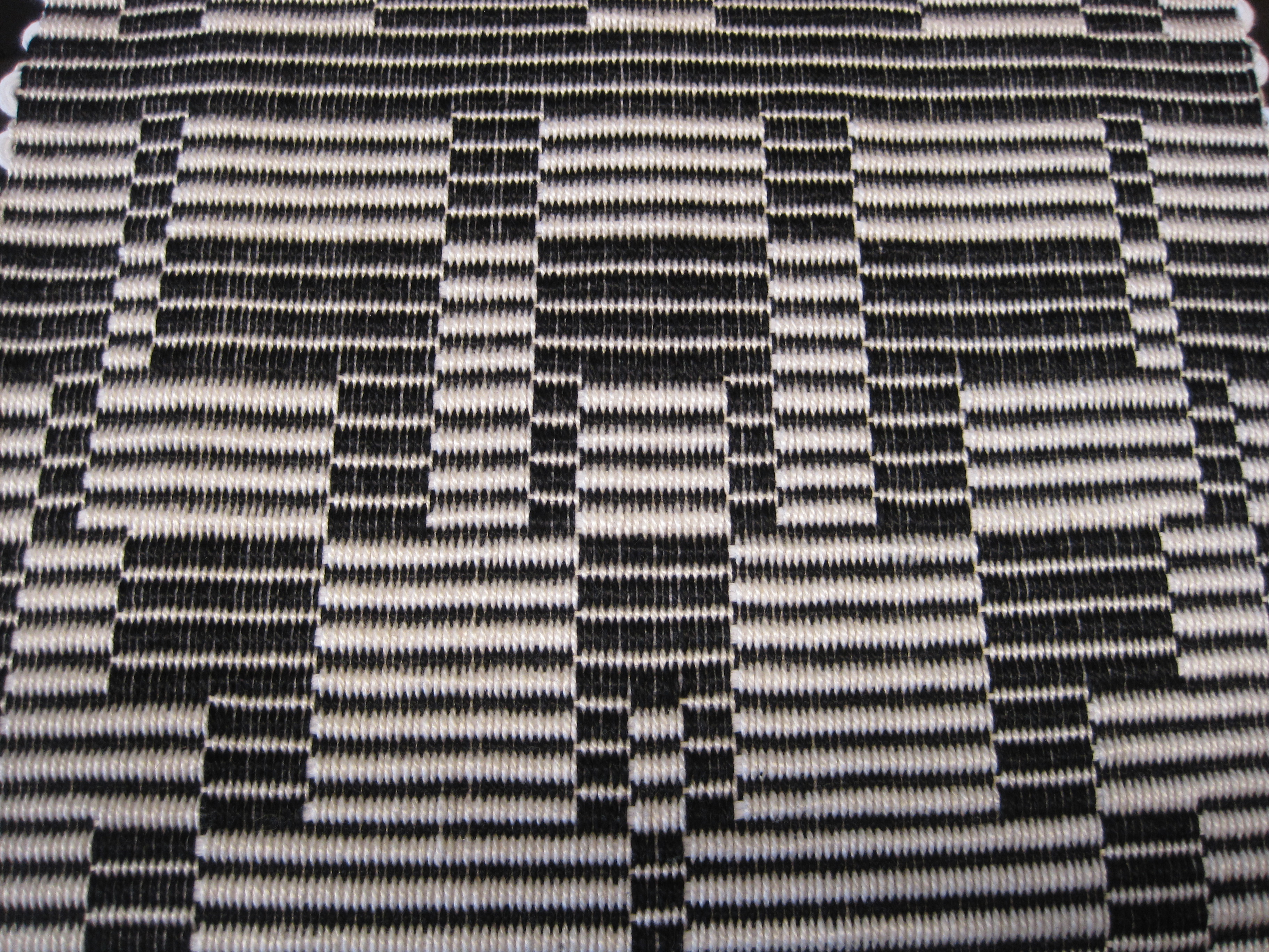 Then I measured my warp, 348 ends, and sleyed and threaded my loom in blocks with pairs of black and natural in plain weave pairs: Block 1 -white on 1, black on 5, Block 2 – white on 2, black on 6, and so on. The warp was sett at 30 ends per inch.