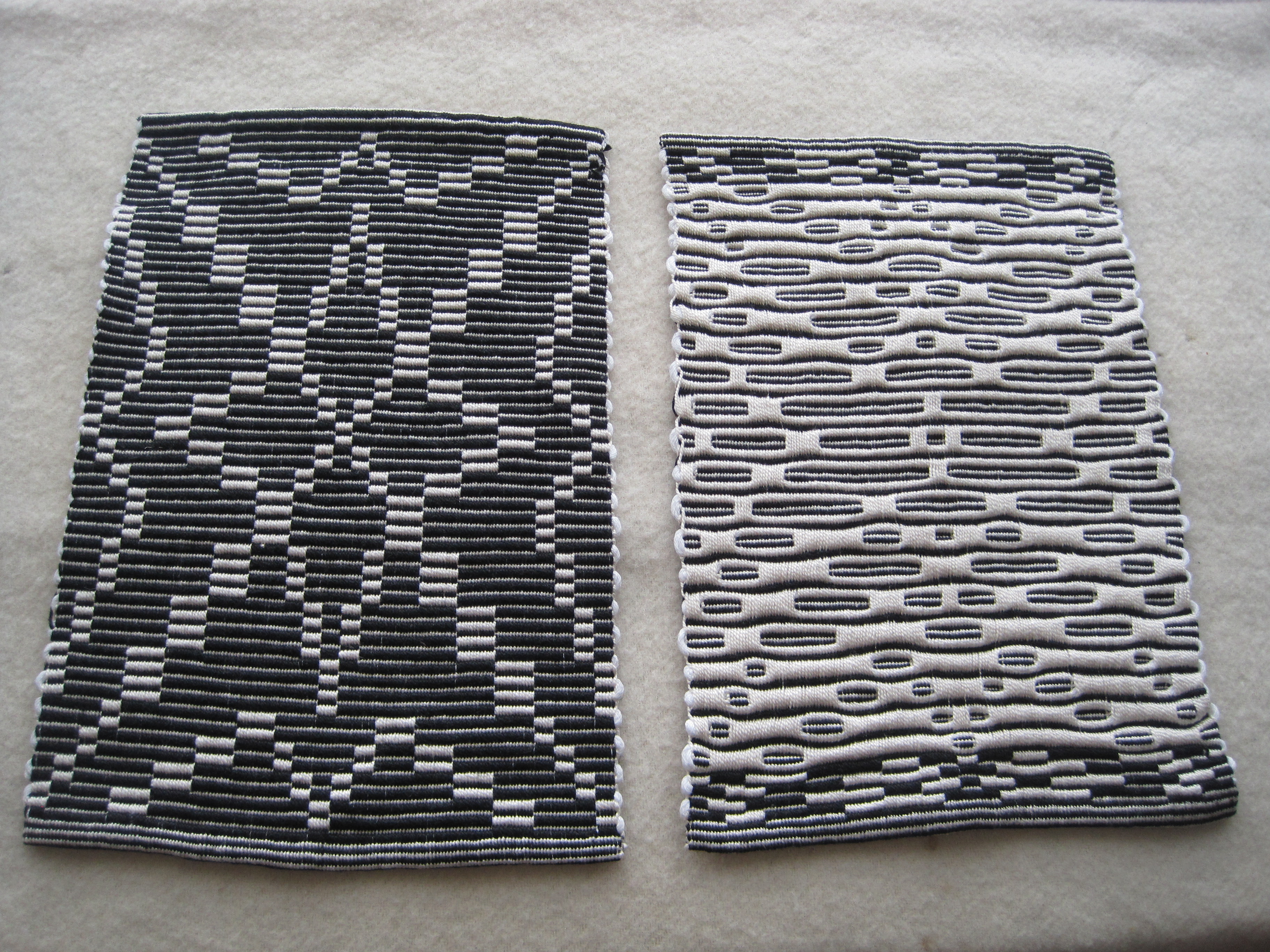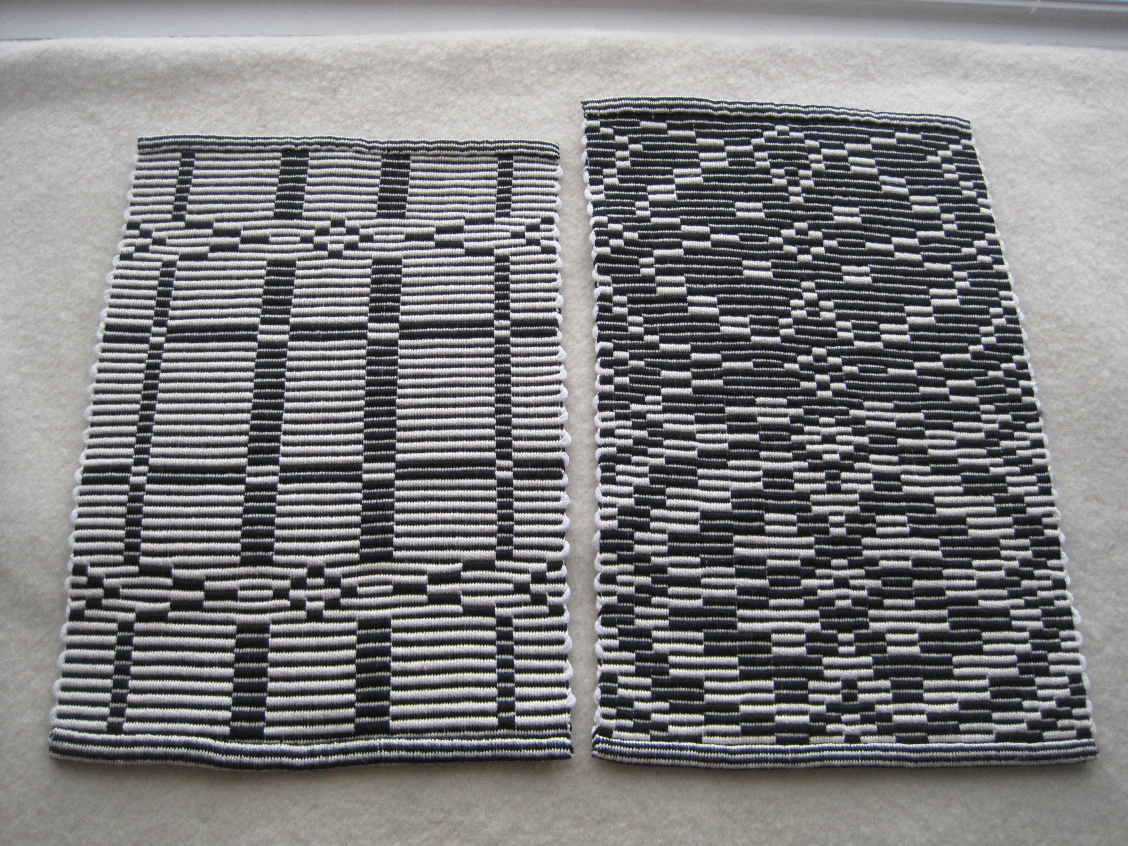 After the workshop I returned home and finished weaving, then washed dried and hemmed the mats.  The results are four reversible place mats, and one shorter mat for the centre of the table.  All now ready to be put into service.  Makes me want to have a black and white dinner party!