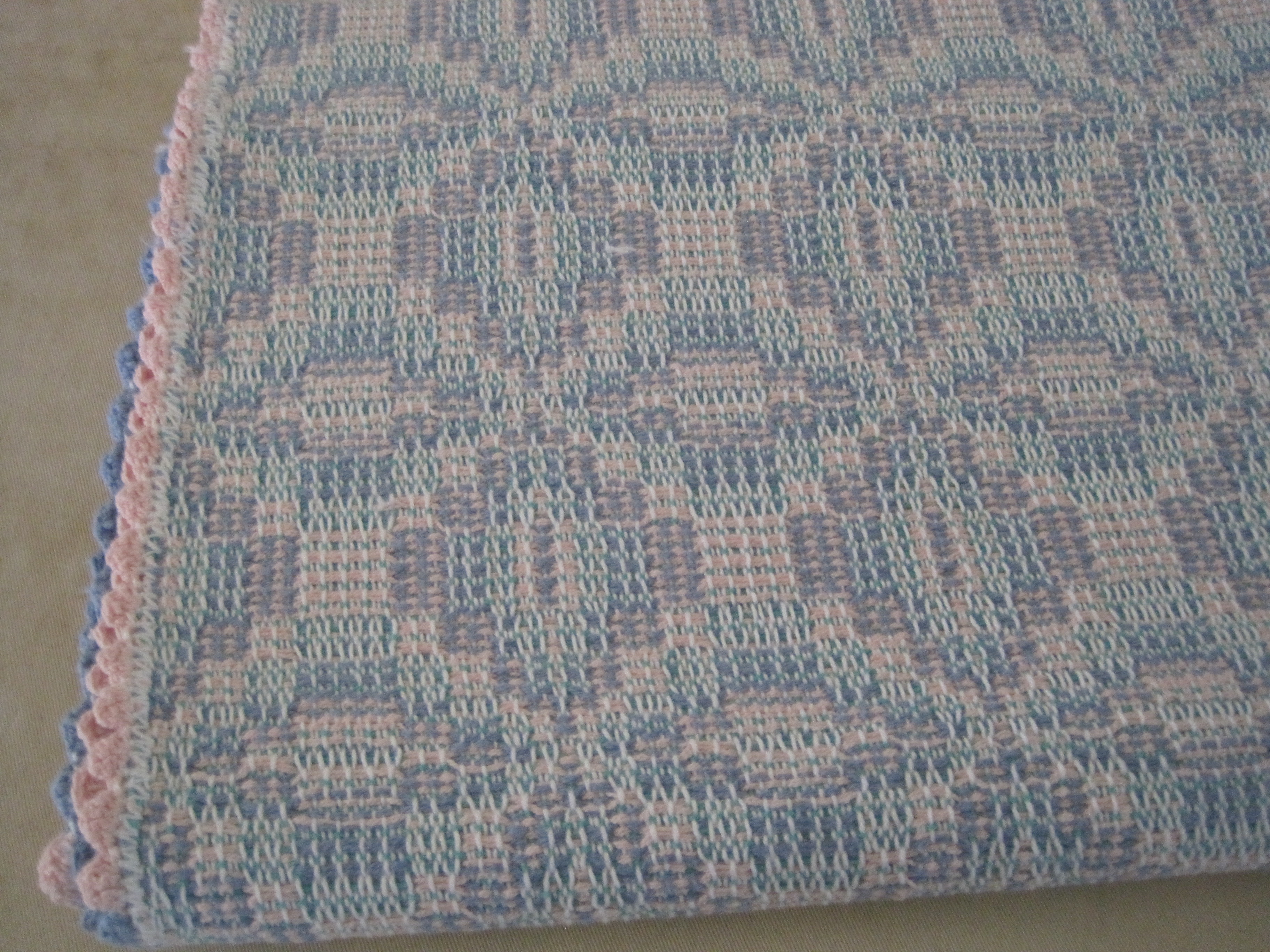 The second blanket is woven in polychrome crackle in pink and blue 2/8 cotton, which highlights the pattern. Both blankets are finished with a crocheted edging. Amazing what can be done on a four shaft loom.