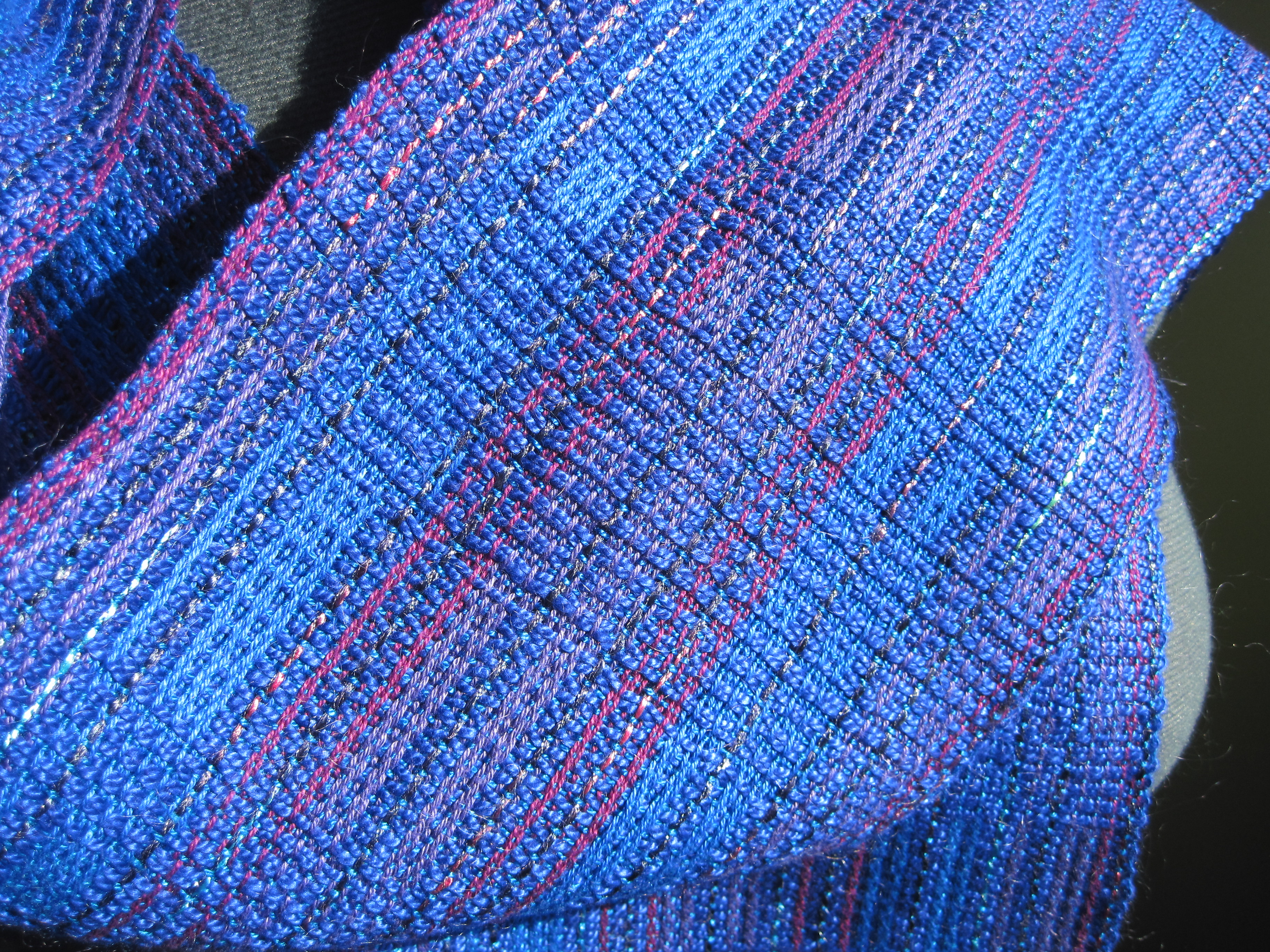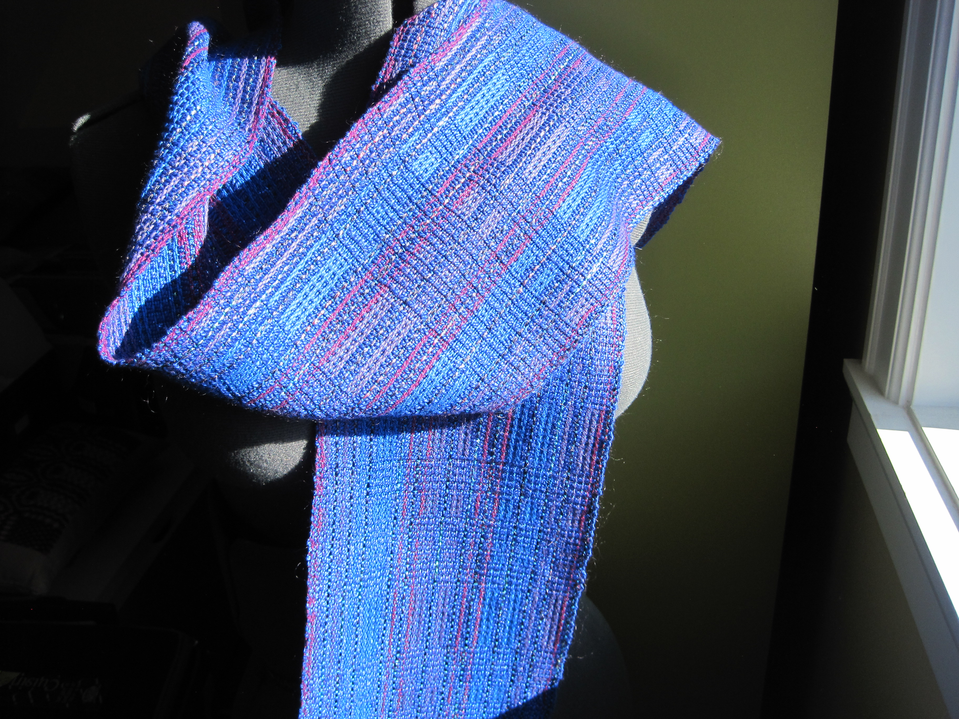 Here is the third effort in my continuing study of Summer and Winter Weave. This is 4 shaft Summer and Winter on a multi-coloured warp. I wove a scarf with a 2/8 cotton warp, and added a little bling to the tie-down warp in every Block A. The tabby weft is 2/8 tencel to encourage drape, and the Pattern weft is 5/2 UKI mercerized cotton. Because all the colours are close in value, the result is a scarf that appears to have more texture than pattern.