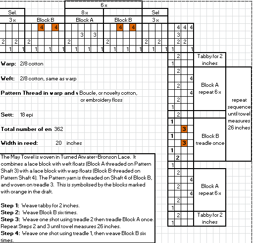 The May towel is woven in turned Atwater-Bronson Lace, in lace blocks. For my purposes, I changed the draft for the May towel to use 2/8 cotton sett at 18 ends per inch. The revised draft is: