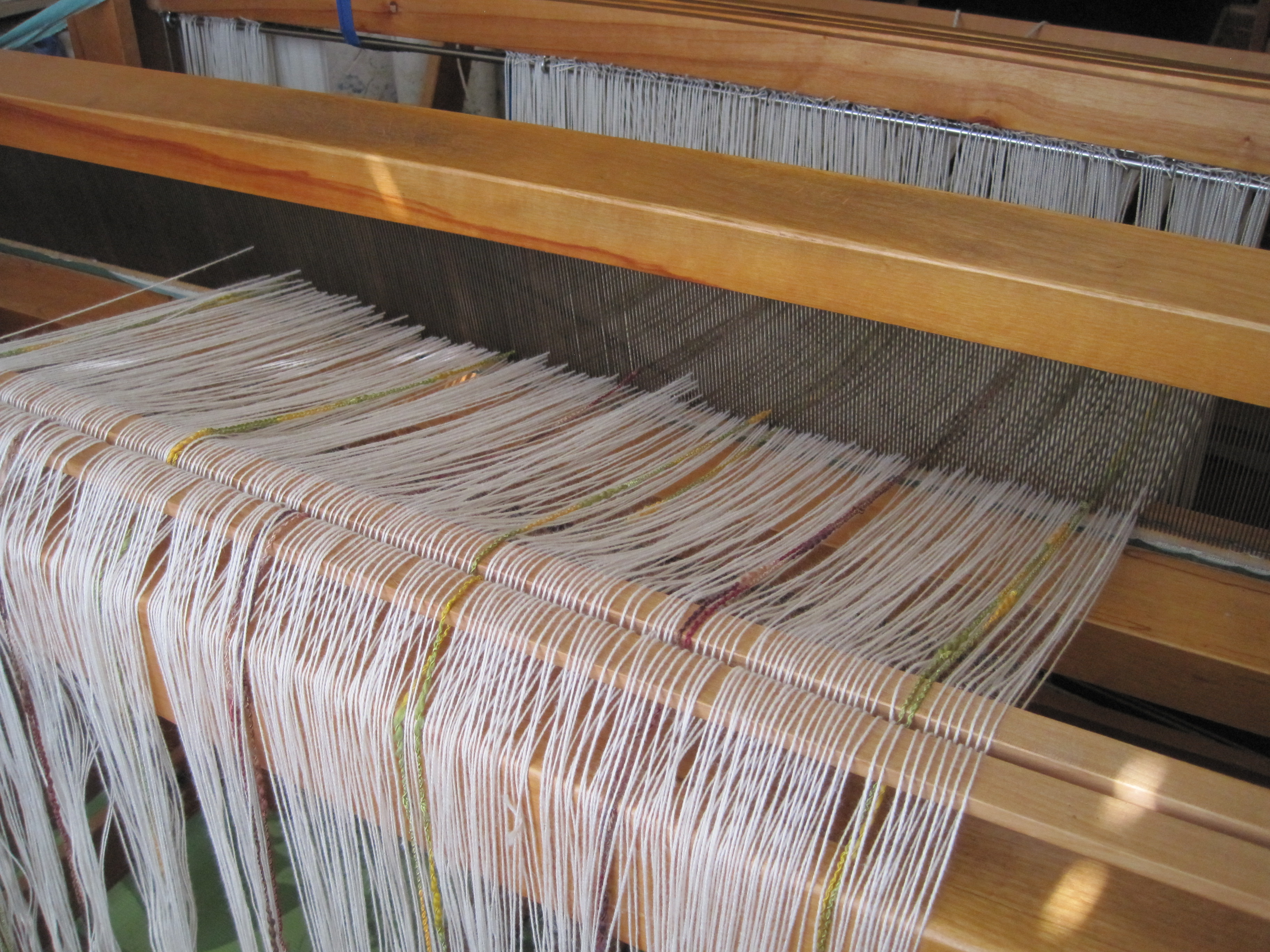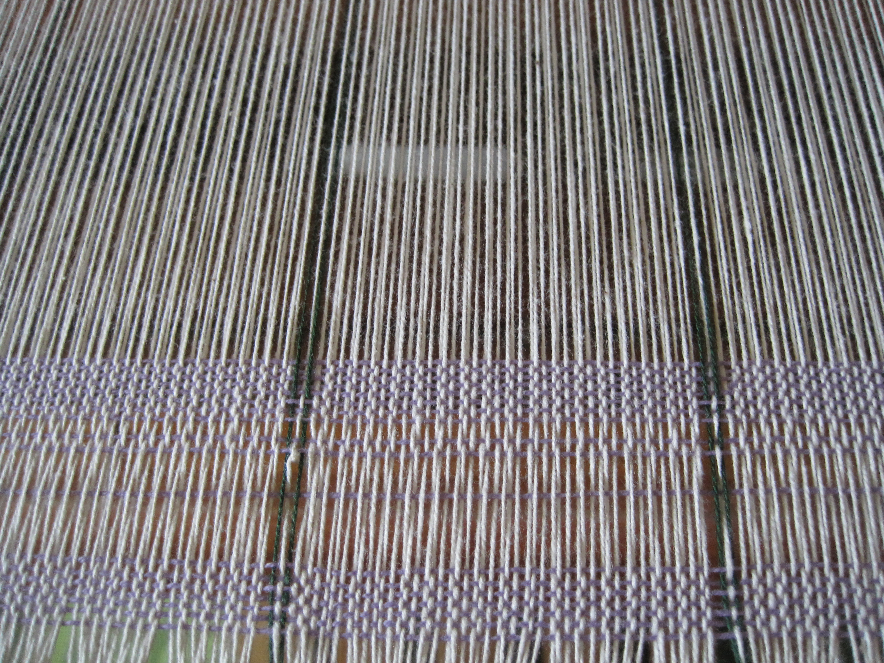 I finally have the “May Towel of the Month on the loom after a couple of false starts.  I made the choice to use 2/8 cotton in natural colour for the body of the towel, and a very pretty cable yarn in cotton and rayon for the accent.  The cable yarn has a thick and thin aspect, with the main part of the yarn about the size of 2\8 cotton, and some nubby parts a bit larger.  So, I went ahead and measured out the warp and proceeded to put it on the loom.  I had to pull the nubby bits by hand through the reed dents, and had no problems in the heddles, but obviously I was in denial about the fit and believed that once the yarn was taut the nubbies would just slide through the reed.IMG_3056