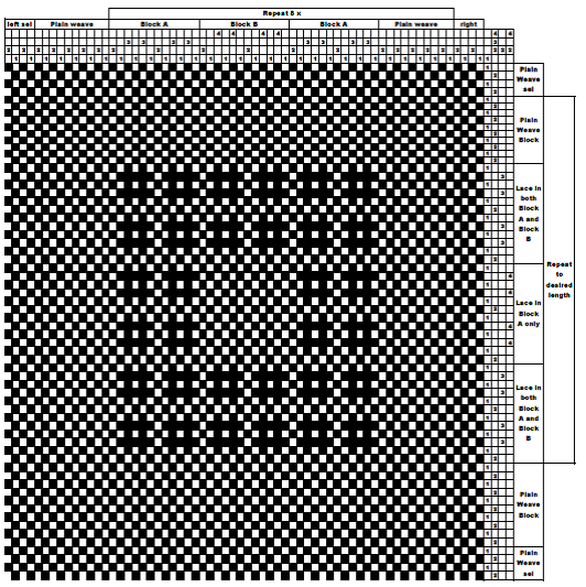 Start with two inches of plain weave, then follow the repeats of plain weave, Lace in Block A and B together, Lace in Block A only, Lace in Block A and B together. Weave to 30 inches and then finish with two inches of lace weave.