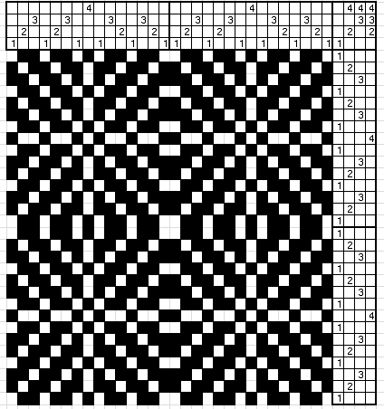 So first, I decided that I didn’t want to do rosepath again, and thought about a nice goose-eye twill. Then I saw this pretty little twill draft, and that’s what I am going to use. It has nice diamond twill shapes with some short floats in the centres. Pretty, and still done on four shafts, which is part of the criteria.