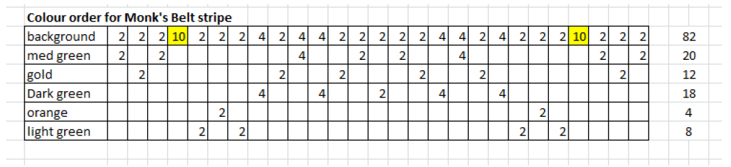 Border – 50 ends background; Stripe section – 82 ends background and 62 ends pattern; Centre – 140 ends background; Stripe section -82 ends background and 62 ends pattern ; Border – 50 ends background