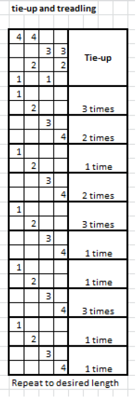 The towel will be plain weave in the background colour, rusty red, and there will be two vertical strip sections in Turned Monk’s Belt.  Sett at 20 epi for the plain weave sections, (borders, Centre and 10 thread sections in the stripe) and 40 epi in the pattern sections.  Thread the coloured pattern threads in the same dent as the corresponding background thread, but through separate heddles.  The background threads are on shafts 1 and 2 and the pattern threads are on shaft 3 for Block A and Shaft 4 for Block B.