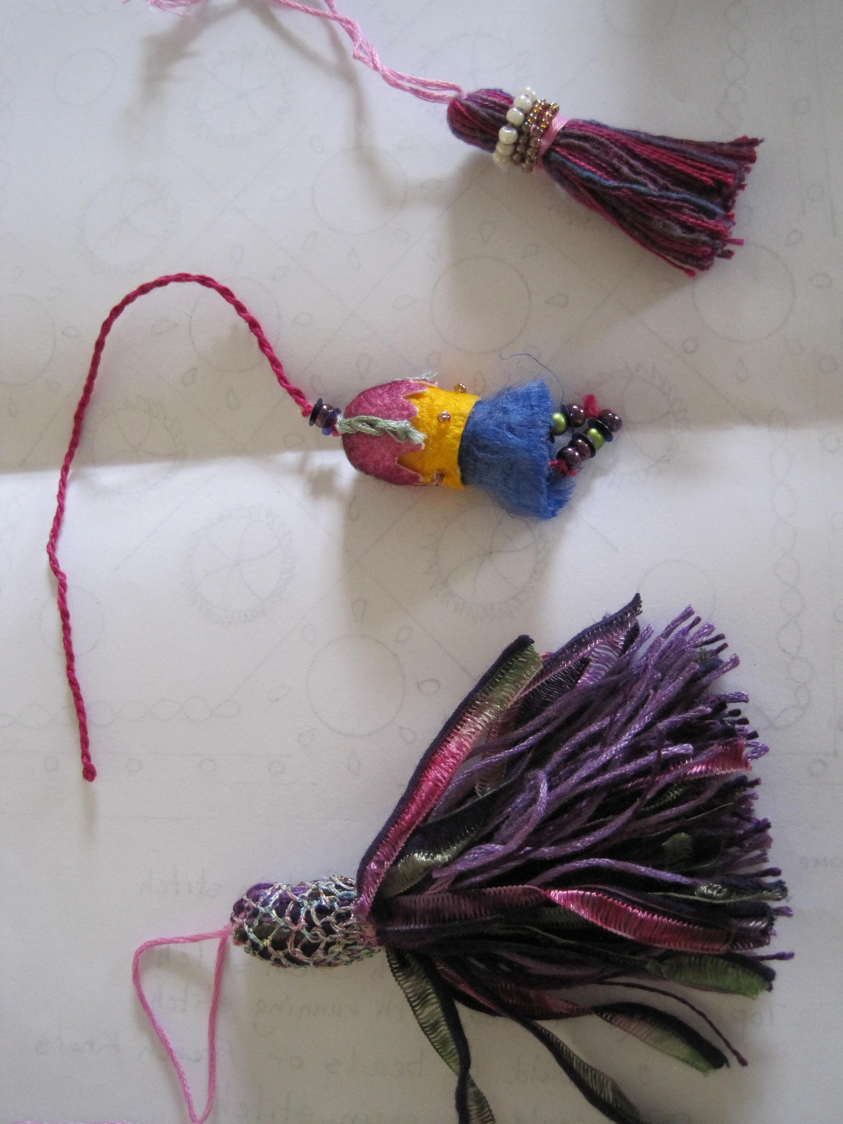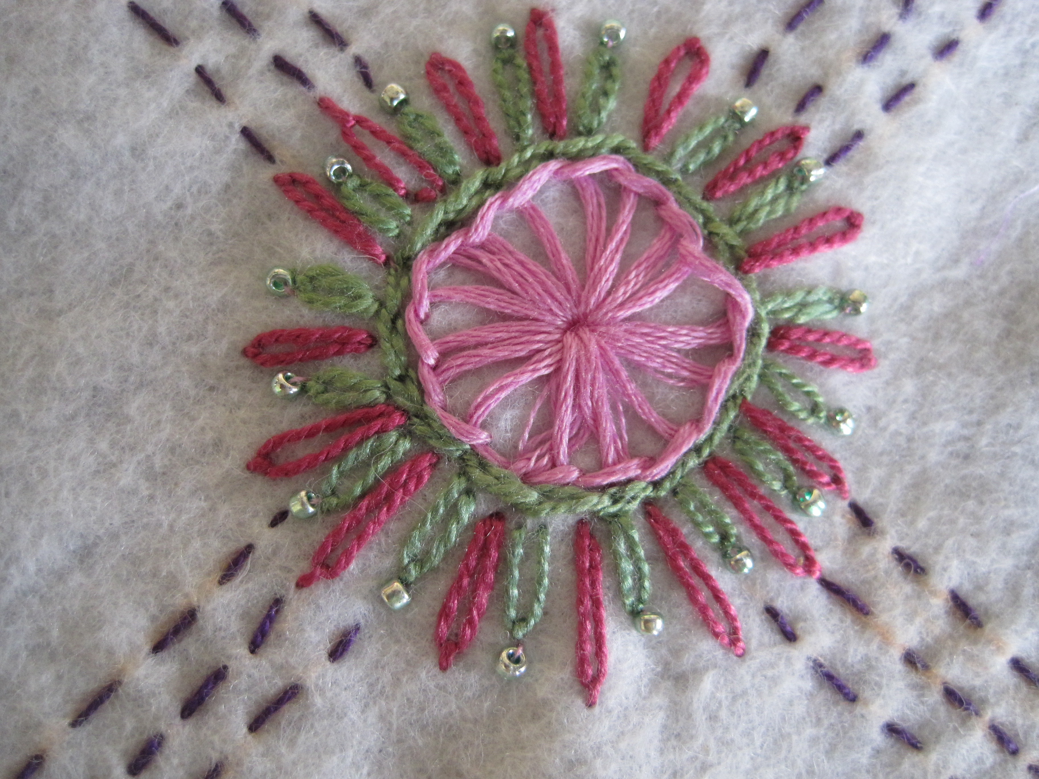 My workshop on Artful Embellishments involved adding embroidery, beading, buttons, mirrors and ribbons on a felt square that will be folded into a style of Indian Bride Dowery Bag, used by brides to carry their own personal treasures into the marriage. We also worked on making various types of tassels. After two days in class and a couple of hours working while volunteering this is how far I got: