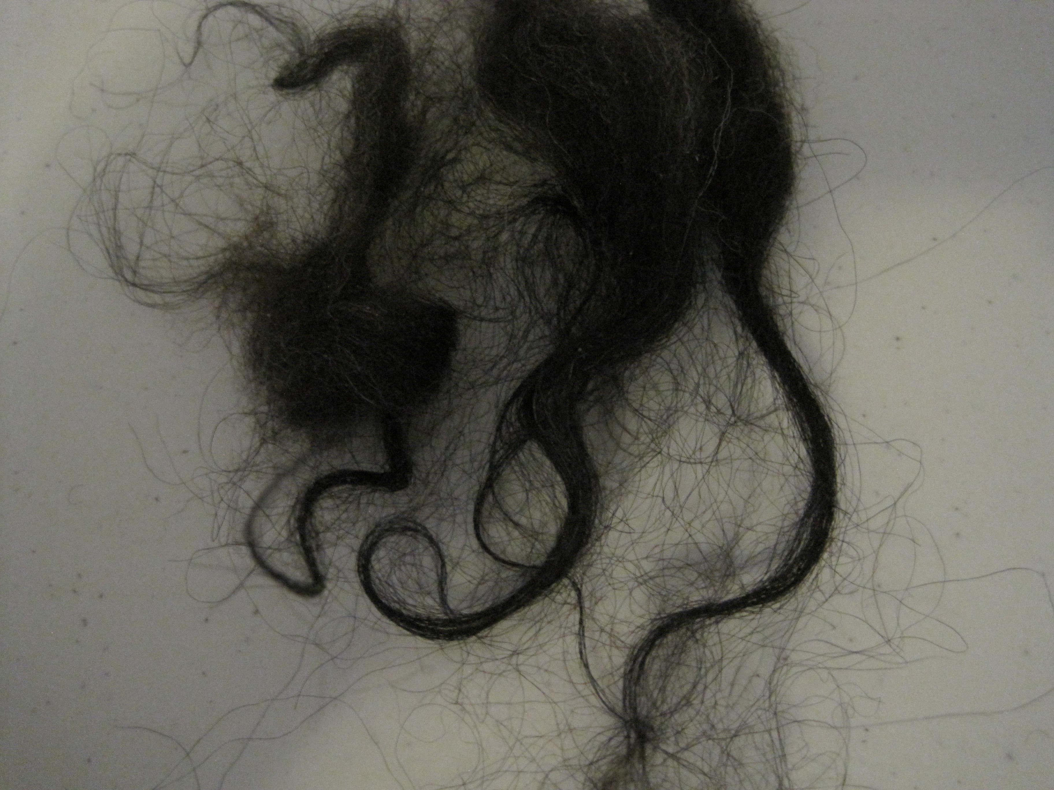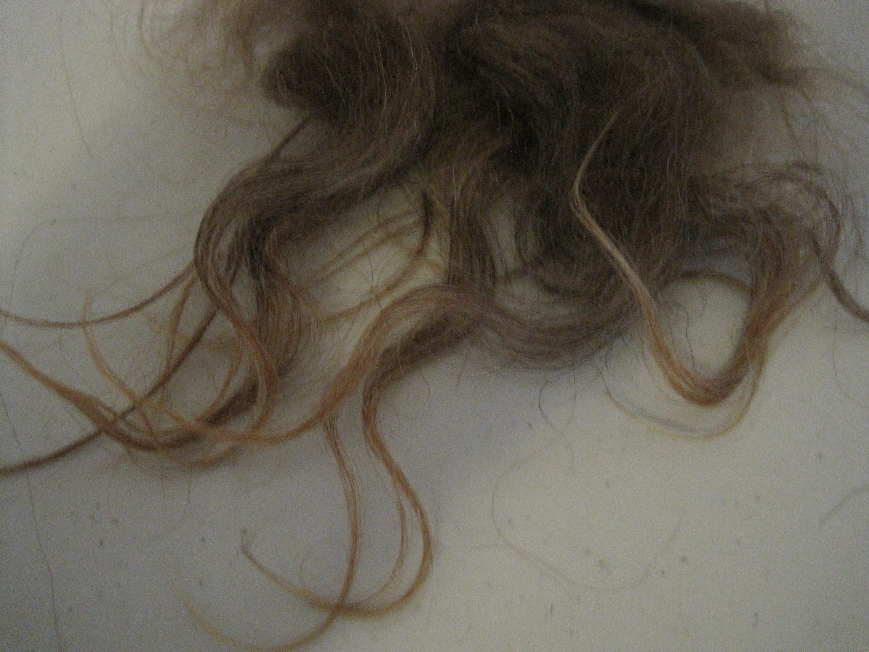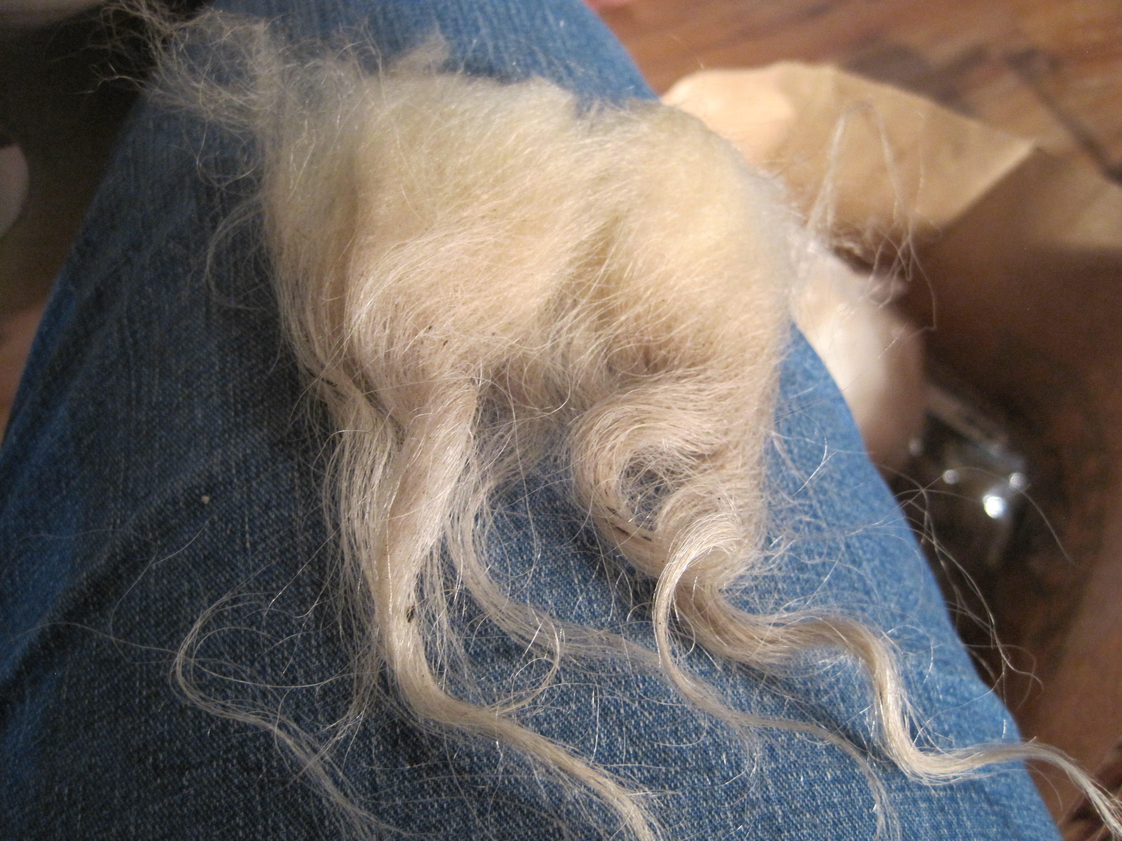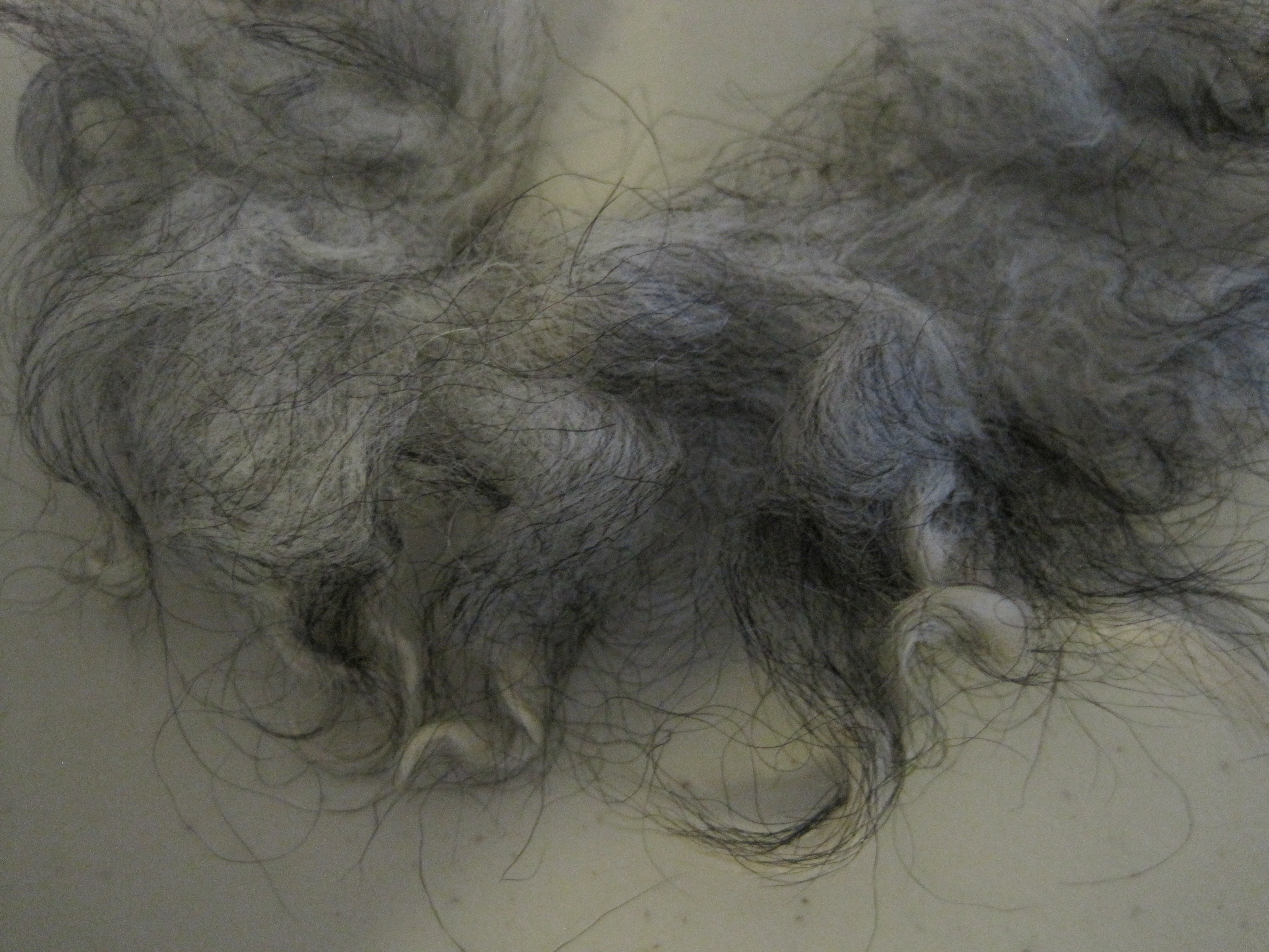 i) the tog hairs were pulled off and the thel spun with supported long draw, 2 ply. Resultant yarn could be used for a lace shawl or used in a sweater.