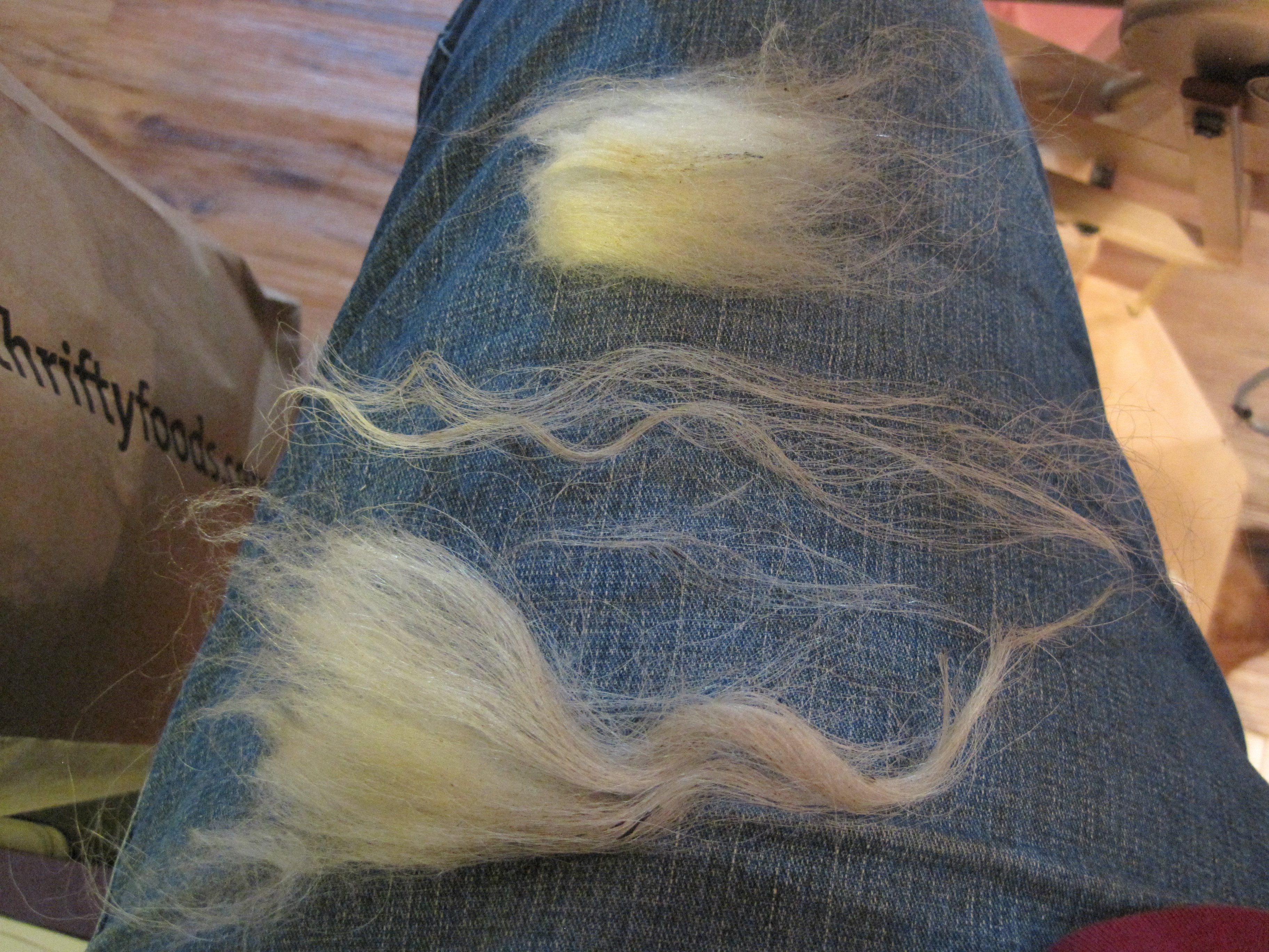 i) the tog was separated out using the edge of the wool card, resulting in a soft thel cloud. The thel was carded and spun worsted from the rolag. The resultant yarn could be used for a lace shawl.