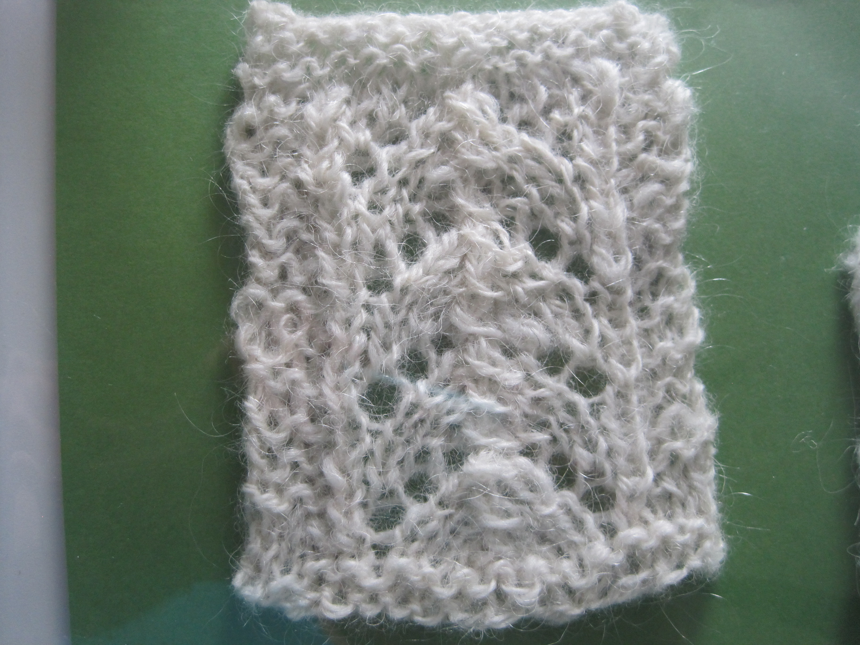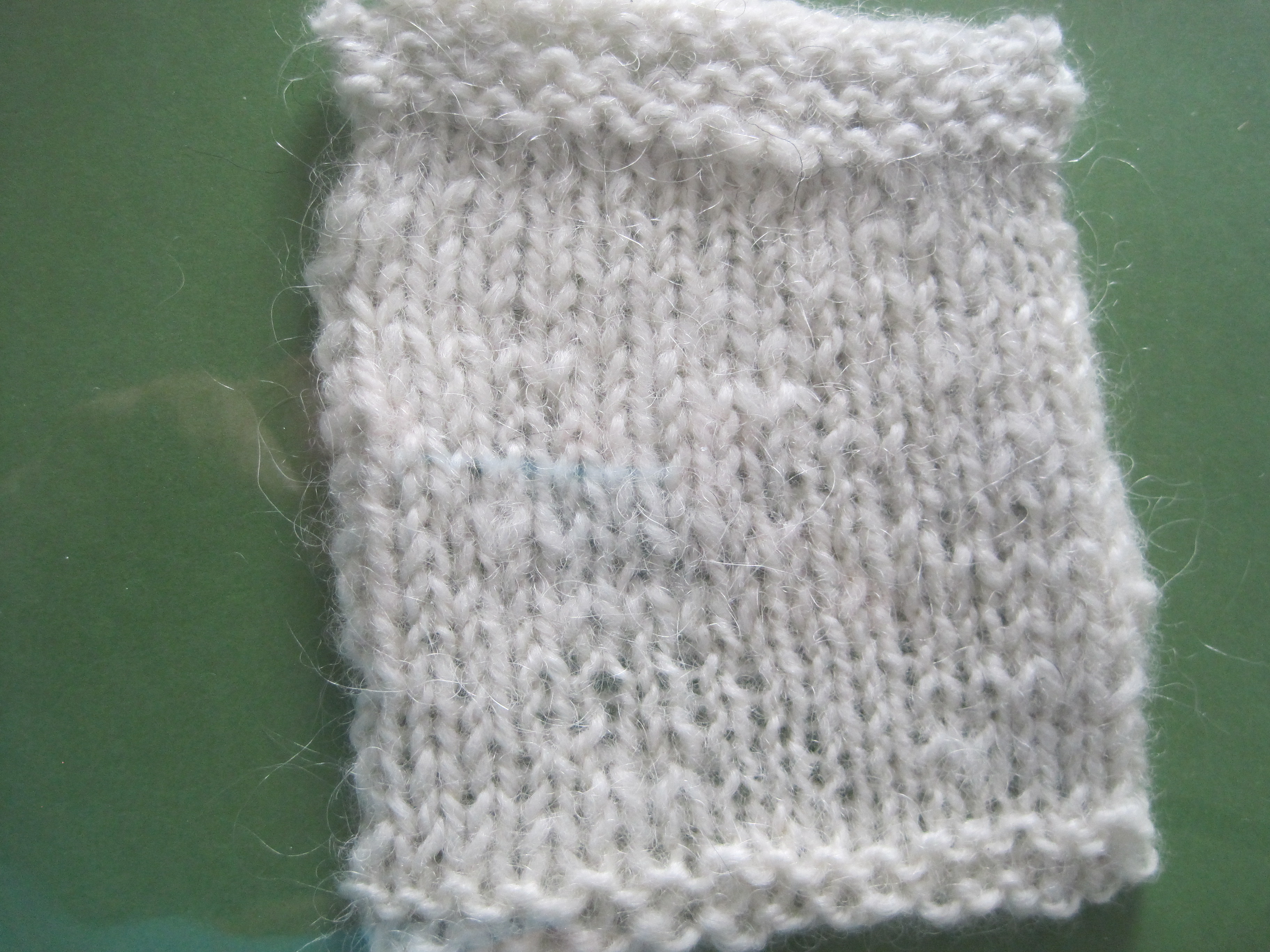 I spun and knit some small samples to see how the yarn would behave. The combined yarn with tog and thel just picked and spun has a nice crispness for knitted lace. The carded sample is dense and warm, good for an outdoor winter sweater or mittens. The yarn from Charles washed up to almost white with a few of the darker tog showing up occasionally.
