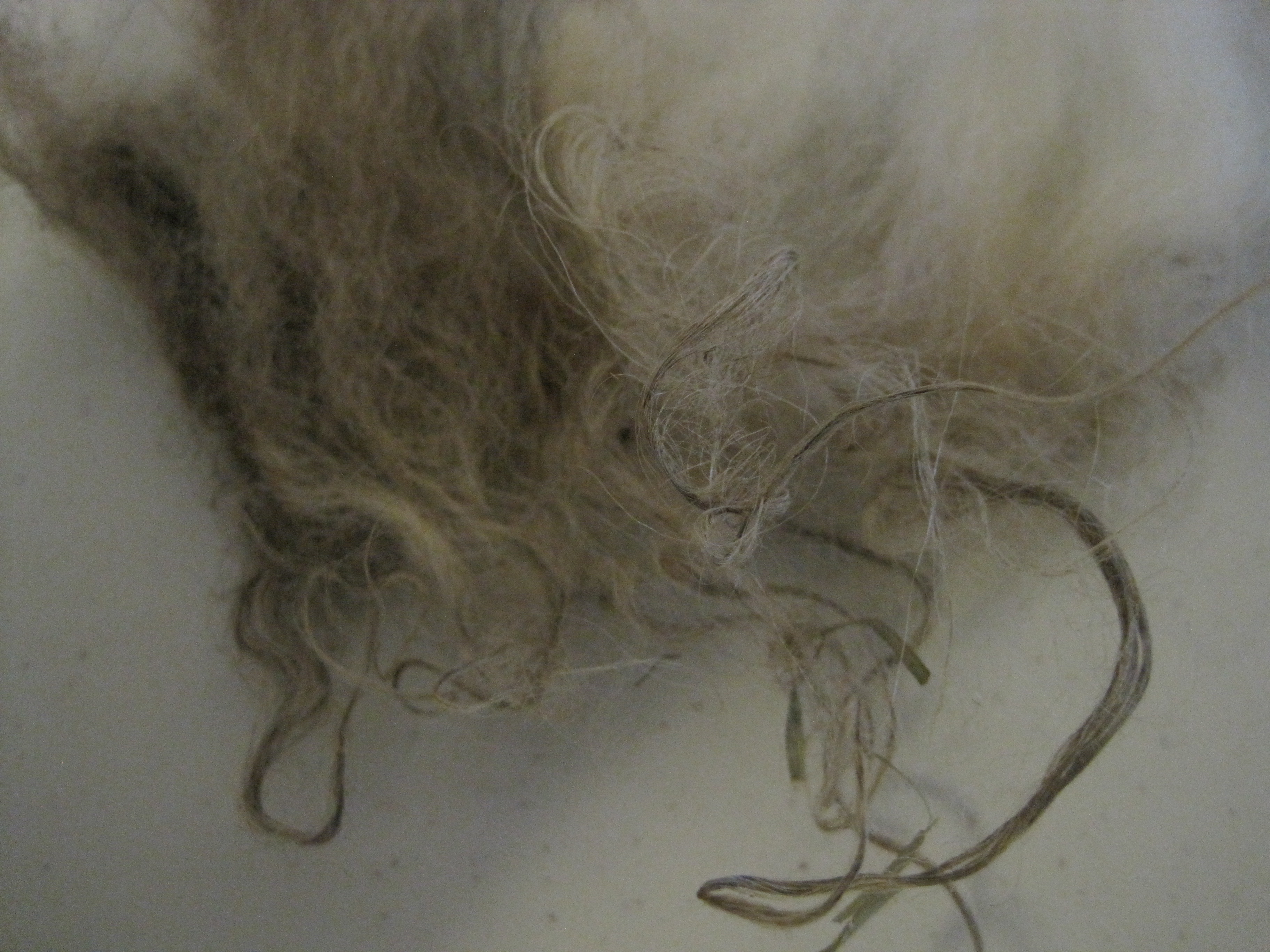 First up was Charles, a white 5 year old ram. The fleece had a white thel, and a mostly white tog, although some grey tog was also present. The left photo shows some locks picked from the fleece. The right photo shows (from the top) thel, tog and full lock.