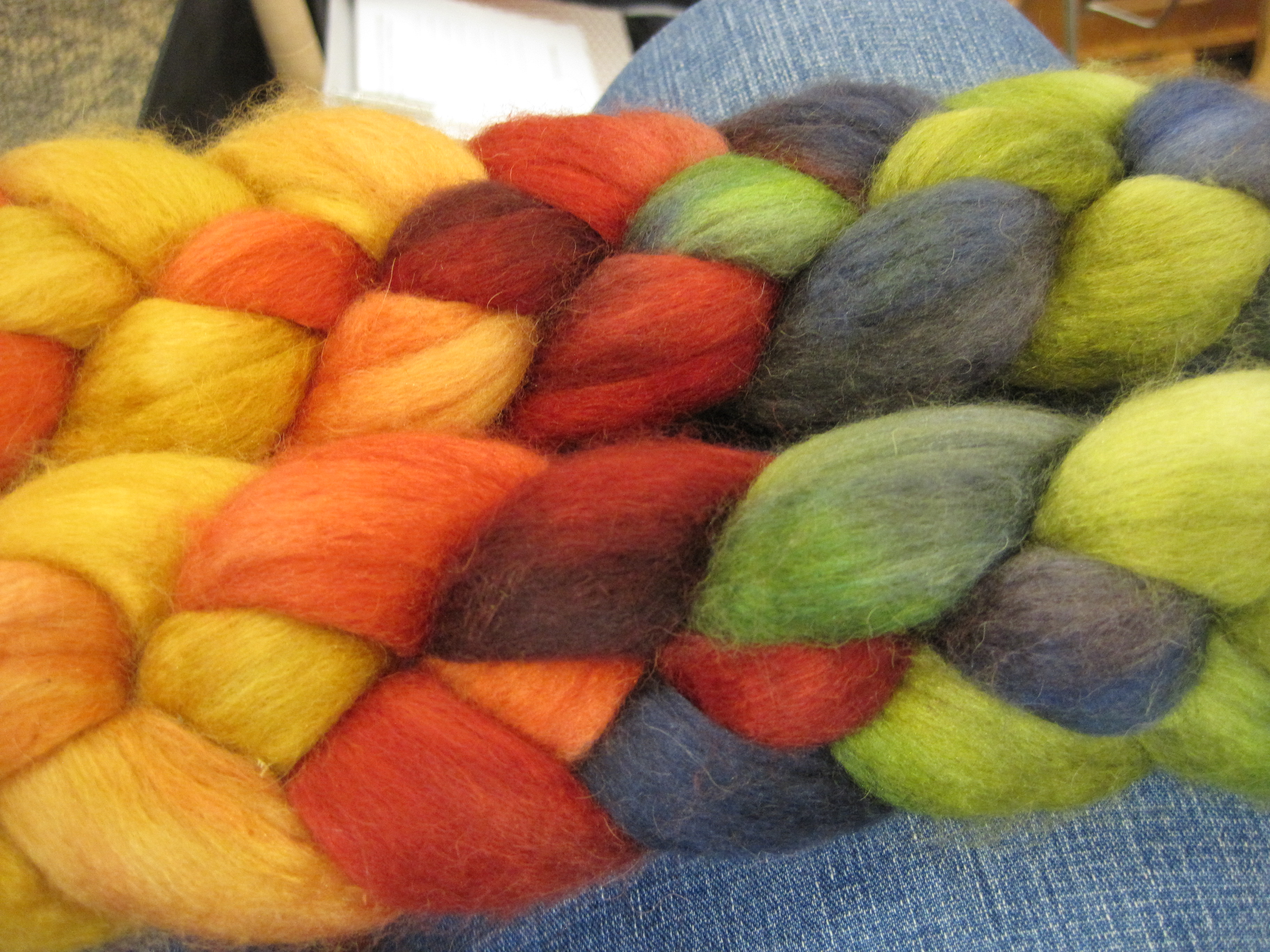 Isn’t it funny how one thing in your life echoes in another, without you realizing.  I was surprised to find that I am using similar colours in my spinning at the same time.  Here is they yarn wrap from my towels and my spinning/knitting project.