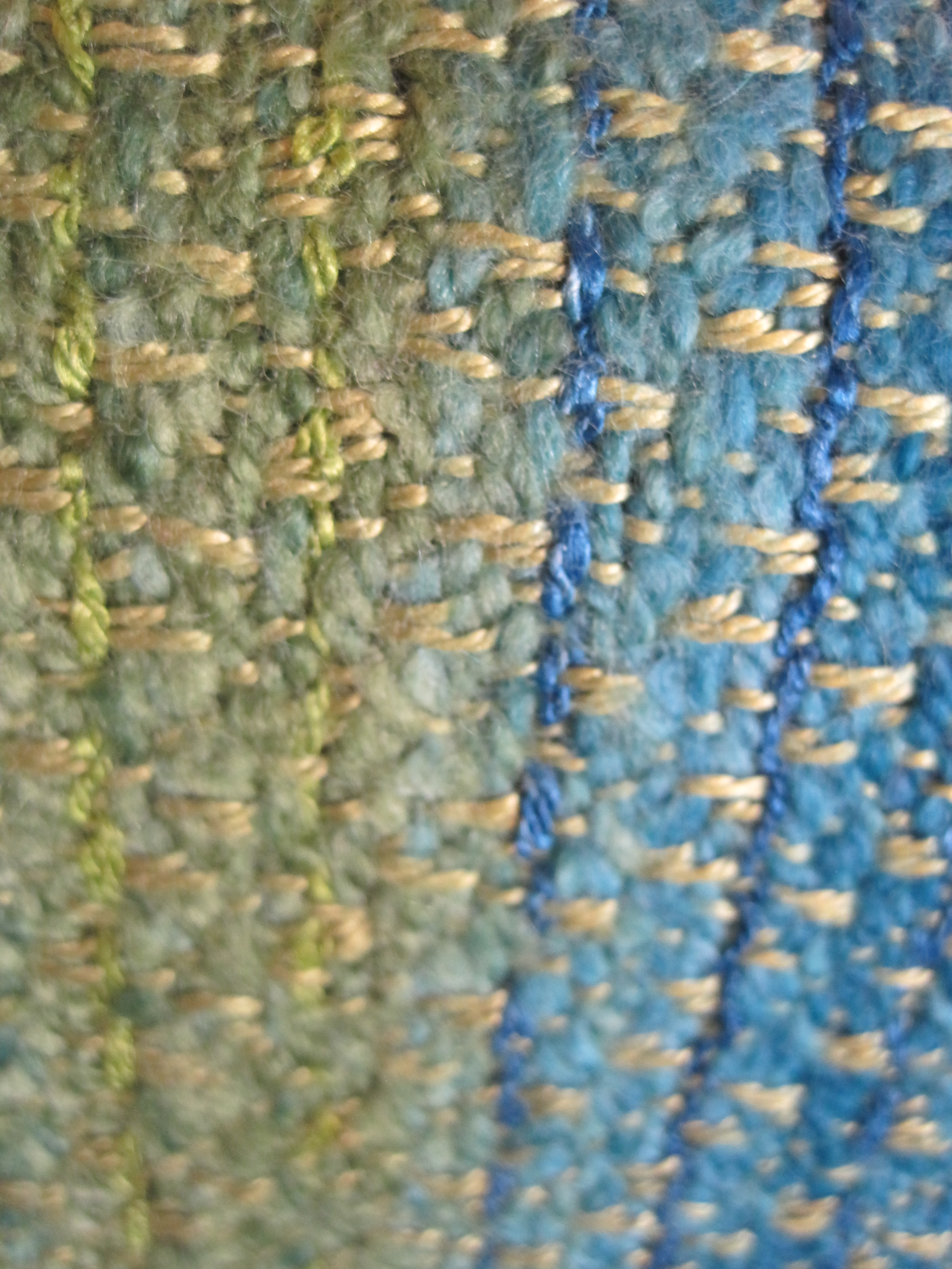 I have been weaving again after having naked looms through most of November and December. I wove a shawl from some of my handspun yarn. This was 100% merino from braids dyed by indie dyer Kinfolk Fibres. I spun two dyed fibre braids into a gradient yarn, moving from turquoise through green to purple and then back to green and turquoise. It finished at 712 yards. I used this as warp for a wide scarf/shawl, set at 16 epi, 18 inches wide in the reed. I used a small twill on 8 shafts, a balanced 3/1 twill against a 1/3 twill, using 2/20 silk from Jane Stafford Textiles in “lime lights” colour. The scarf has excellent drape and is light weight and soft.