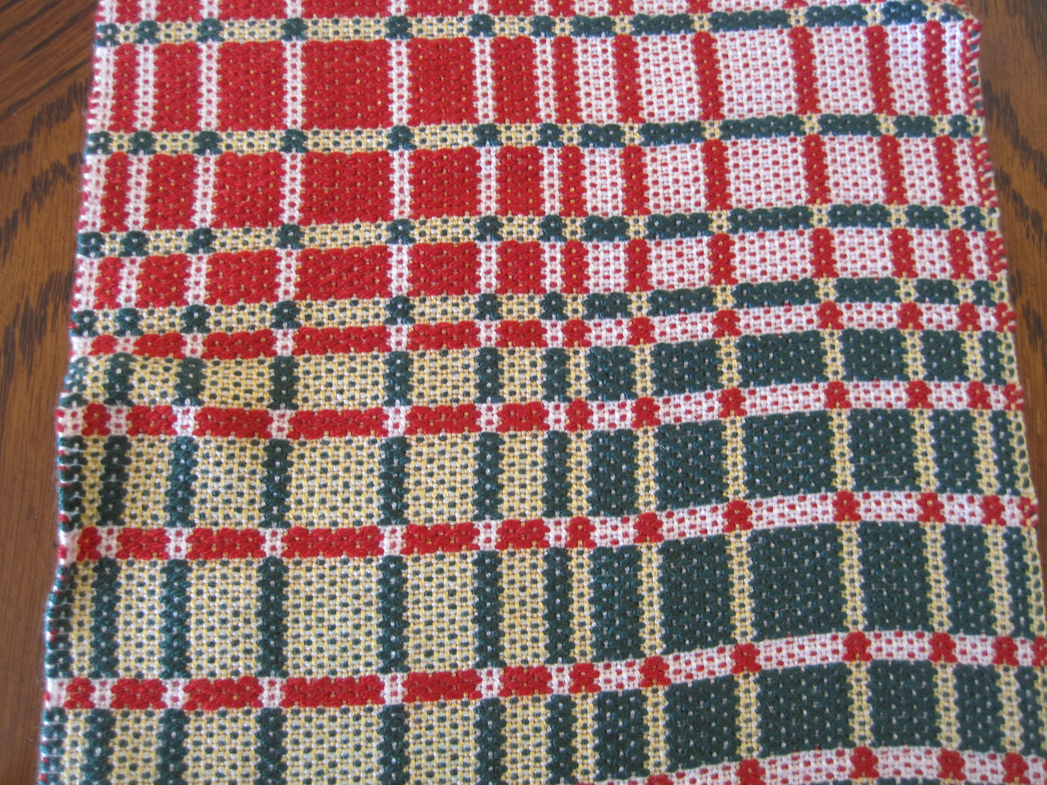 The towels are woven with 2/10 mercerized cotton in snow white for both warp and weft, Sett at 24 ends per inch and treadled as drawn in, also at 24 picks per inch.