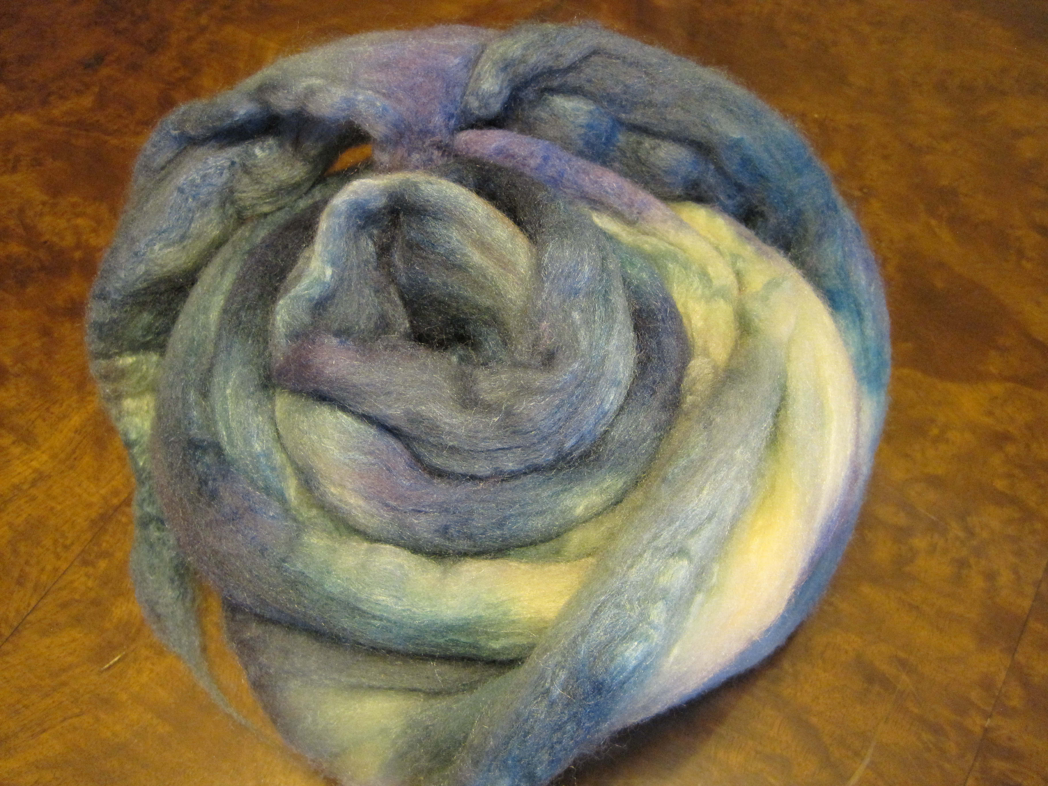 I have been spinning again. This beautiful pile of fluff was blended and dyed by Lynne at West Coast Colour. Lynne loves to work in fibre and names her fibre blends. This one, called “Satisfaction”, is a blend of 60% Polwarth wool, and 40% silk.