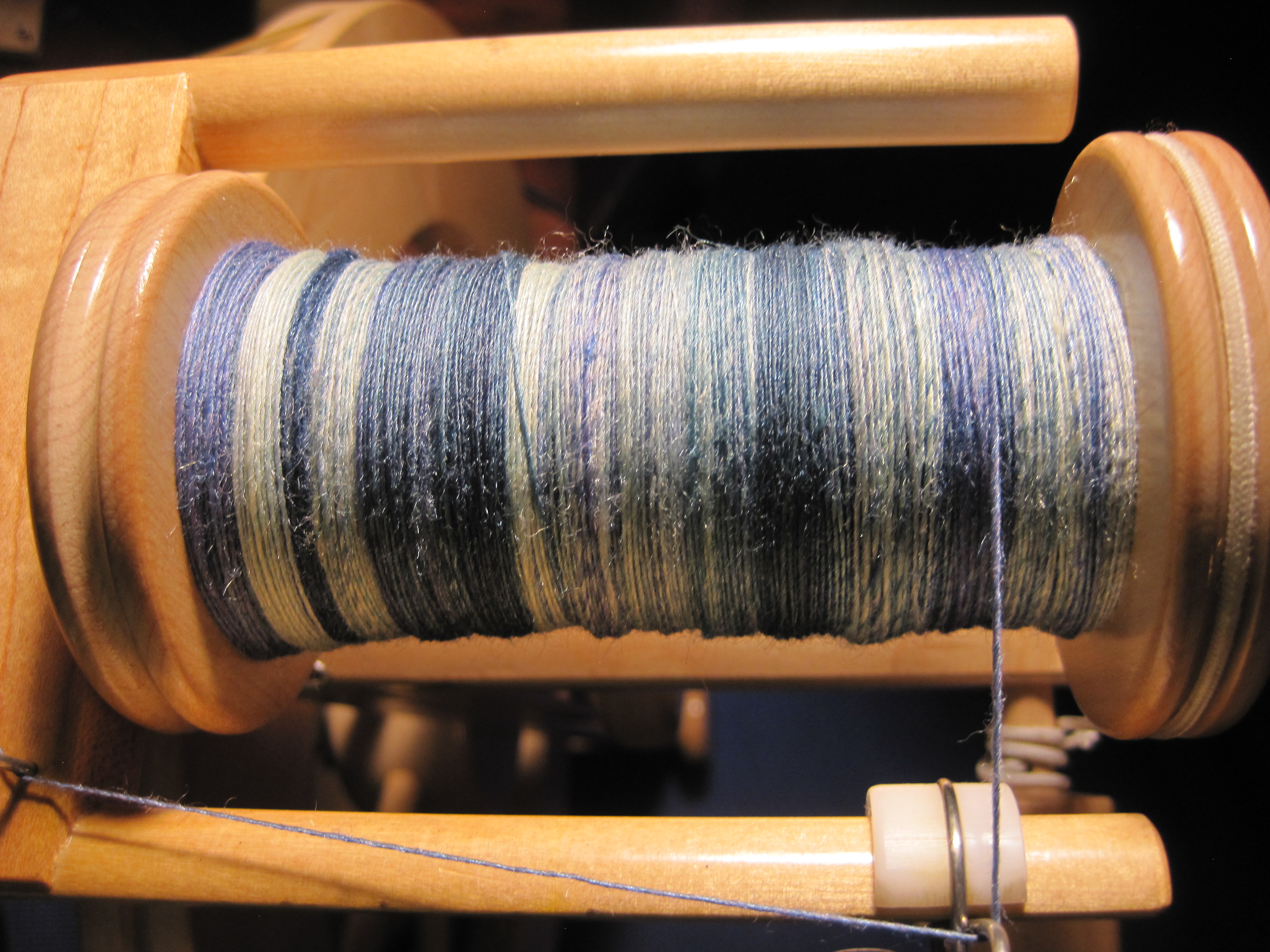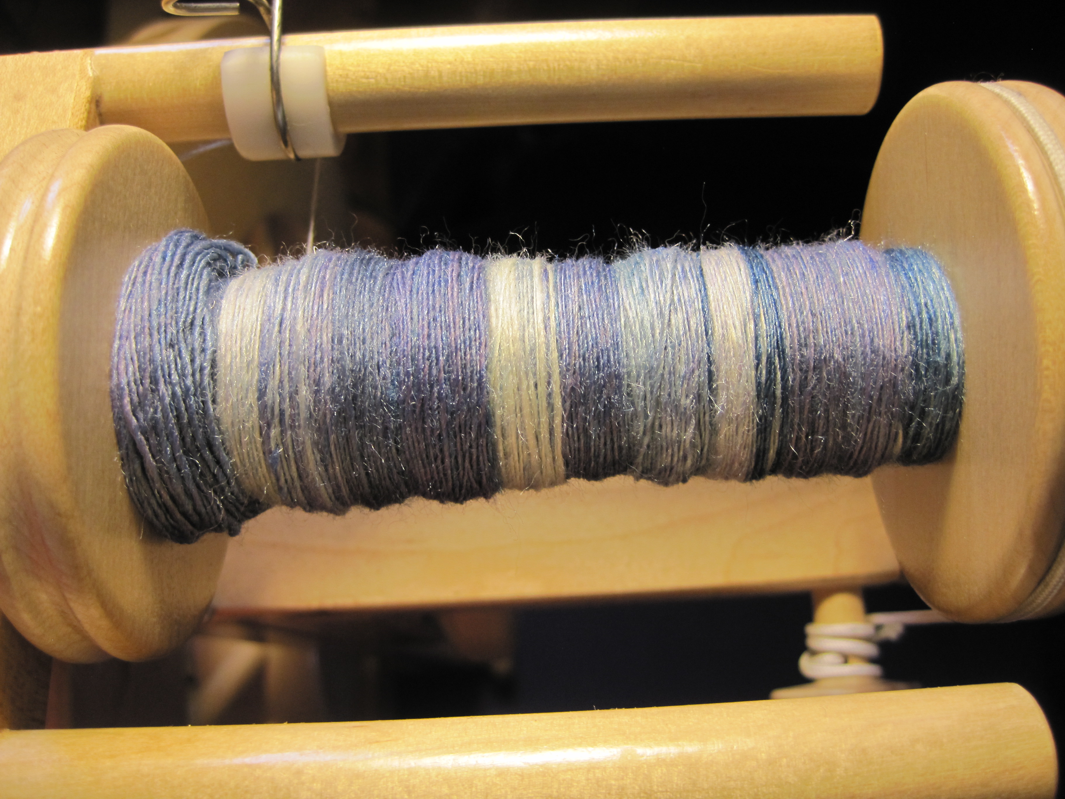 While Lynne names her fibre blends, I like to name the colour story. Not when the fibre first comes to me, not while it is on the stash shelf, but as I start to spin and draw out the fibre, the name and the story start to evolve. This fibre is dyed with blues and a hint of purple, and as I worked it started to remind me of a pile of blue jeans on the floor, some darkly new, and others old and soft and faded to nearly white. And so, my mind wanders to denim dreaming.
