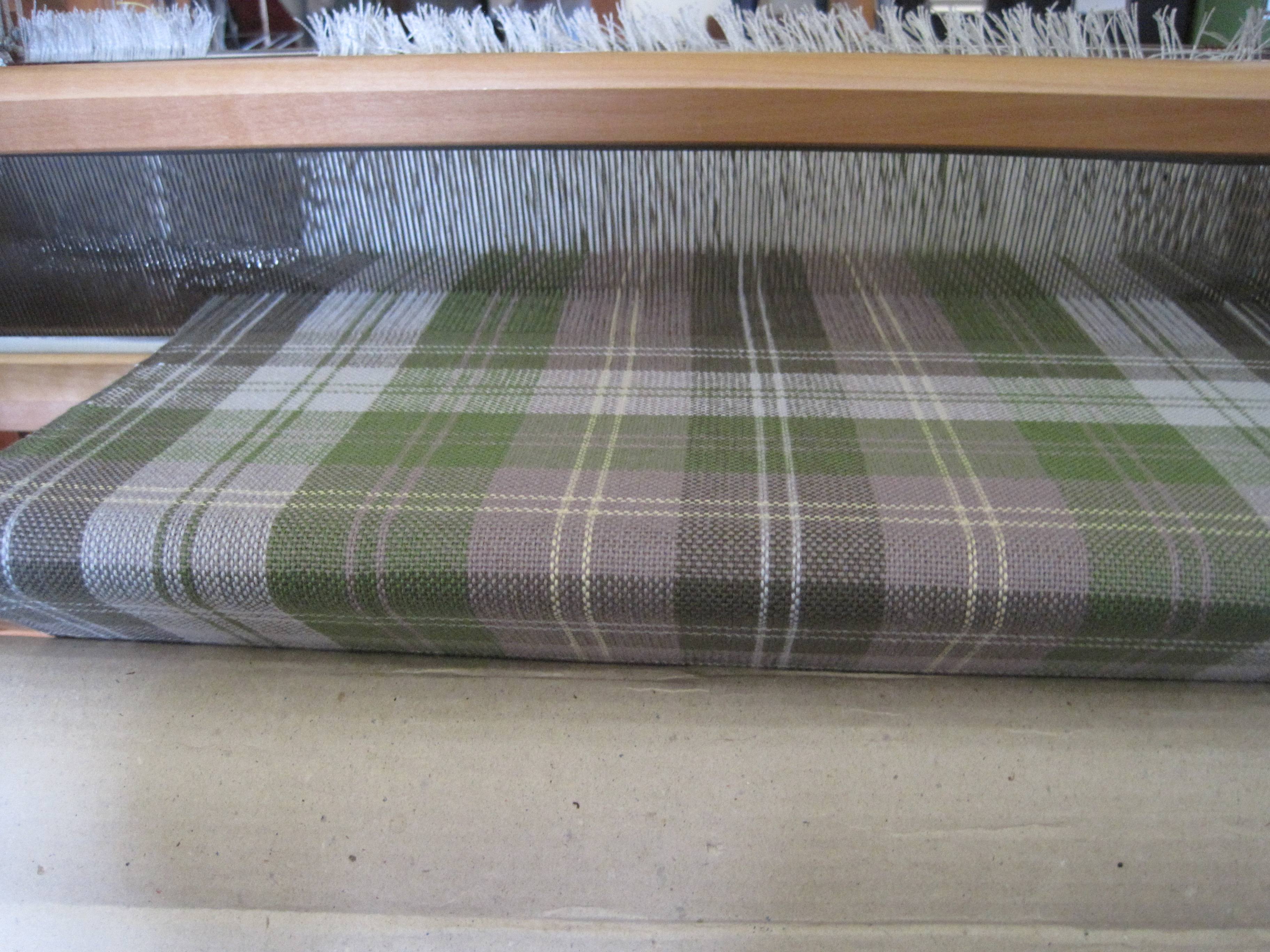 She planned a masculine window-pane plaid to reflect the colours of the rocks and grasses on the beach.  She planned and measured her warp.  “I’ll make fat window panes intersected by thin mullion lines echoing the colour of the adjacent pane.” She planned.  “The napkins will be sturdy and strong in classic plain weave.”  She sleyed and threaded and wound her warp tightly.  She wove a sample, carefully measuring to ensure the same number of weft picks as warp threads, following the warp order.  The sample was washed and pressed and hemmed.  “Ah”, she thought, “the take-up for warp and weft is not the same, and the sample is longer in the length than width.  She adjusted, reducing the number of picks in the fat panes by two to square the plaid.  Now it was perfect and she finished the napkins just in time.