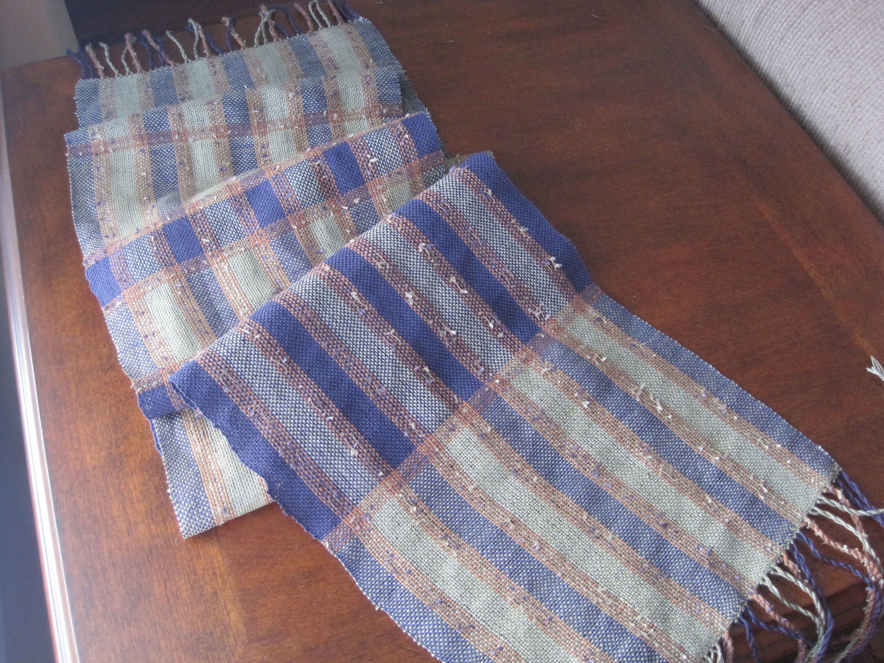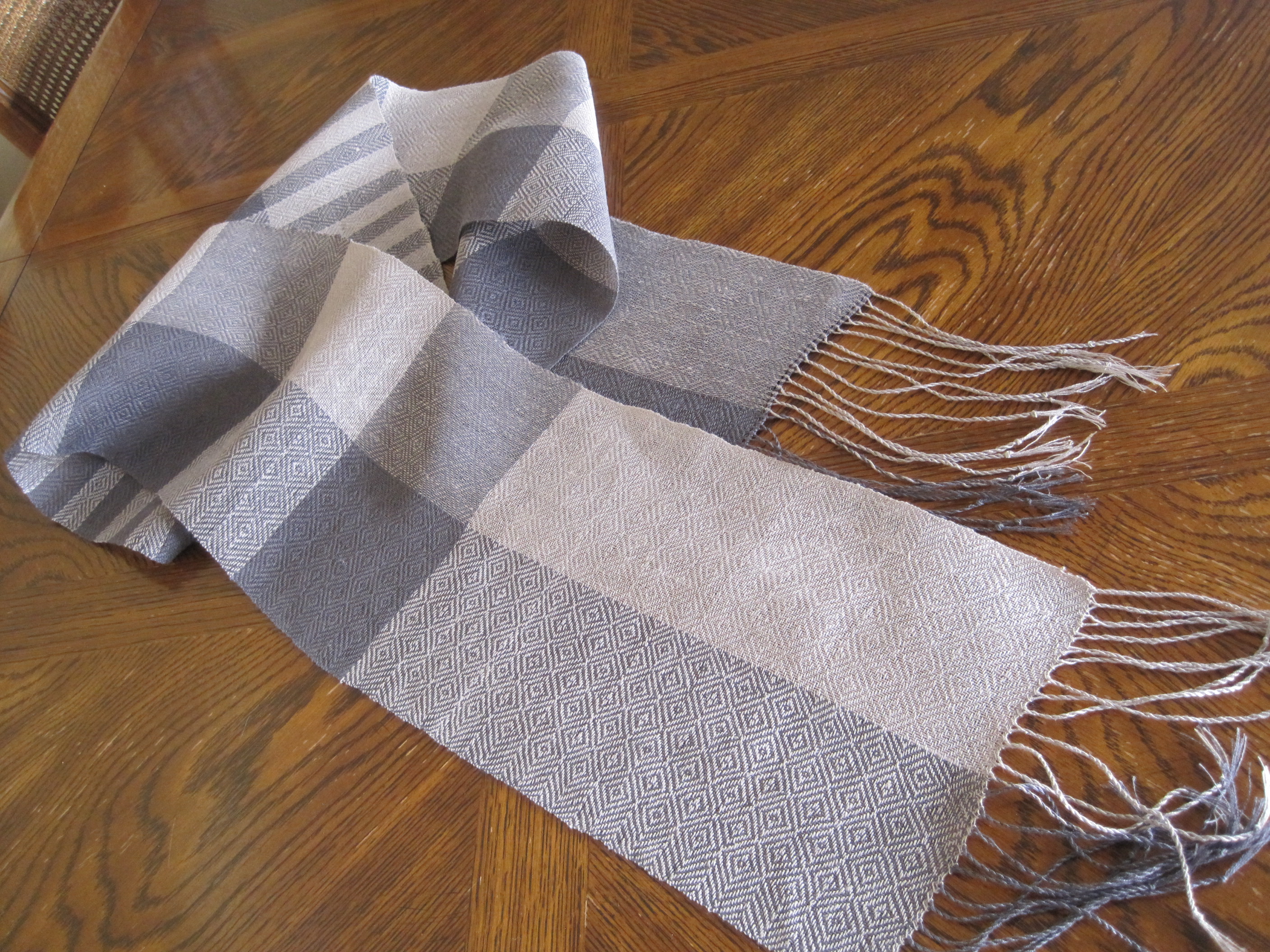 Another scarf off the loom really is linen. It is woven from a fine 40/2 linen, from Silk City Linen, in a subtle bird’s eye twill threading. I really like the transparent quality of the weaving, and again, hope that it will soften up with repeated washing and wearing. It feels very elegant.