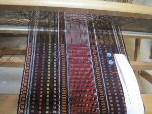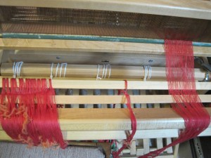 On Loomella, the 8 shaft Baby Wolf, I am in the process of sleying an Ikat warp hand-dyed in a beautiful shade of carmine red. In December I taught a beginner’s course on Ikat weaving, and this was one of the samples I used to demonstrate the wrapping and tying method. This is a 2/20 mercerized cotton (Thanks Irene). There are two distinct wrapped section, one more formal, and one more casual, so the two ends of the scarf will be unique. I know I didn’t dye enough matching red weft for a scarf, so I will weave it in a combination of red and white weft. I did dye a little bit of Weft Ikat, which will also play its part in the finished scarf. Excited to see where this will lead.