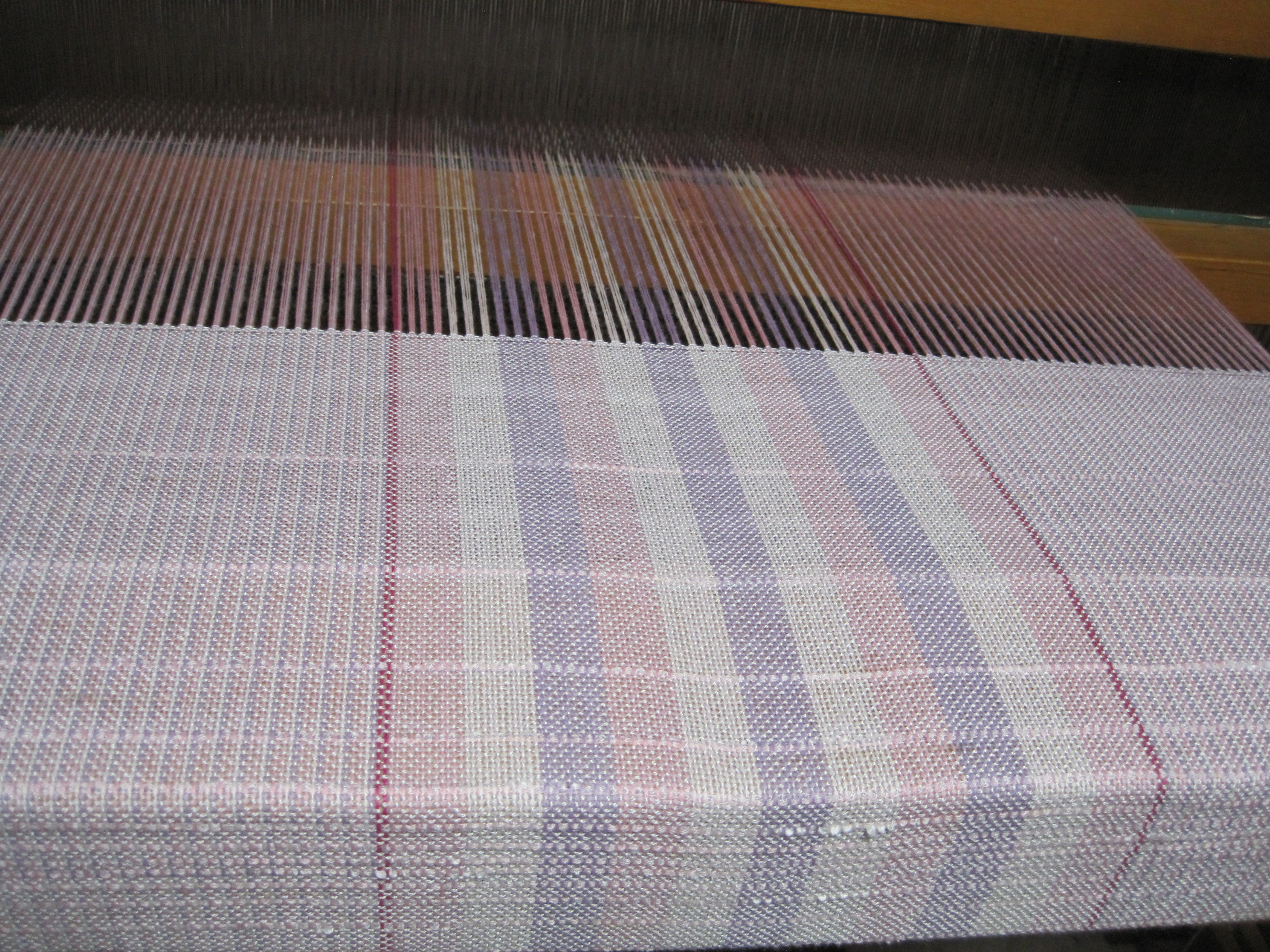On the big loom, the Queen of my studio, I have a pale pink warp for some subtle Spring shawls. The warp is 2/8 cotton in three shades of pink, with a fuchsia zinger. The first shawl is being woven in plain weave with 2/20 silk in a pale grey called “Rainy Day”, with occasional shots of a multi strand textured rayon in pinks and greys. Twenty-four inches wide in the reed, and it will be woven to 84 inches long. In the finishing, I will attempt to add tassels in the same multi-strand accent thread.