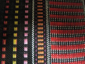 On Amy Ashford, my 32 inch, 8-shaft Ashford table loom, I am playing with Supplemental Weft. I found this draft on “gangewifre-dot-blogspot-dot-com”, under supplementary warps bit of research (posted July 8, 2016), which was inspired by the lovely scarves of Juanita Girardin. So, if you are interested in the draft, this is the blog to look at. My warp and weft is 2/8 tencel. The tencel is doubled for the pattern warp, and the background cloth is black and white stripes. It is a lot of fun, and I would be happy to do more. This piece had to go on a table loom because it requires 24 treadles. A workout for my arms flipping toggles, but worth it. All the work is in warping and dressing the loom, after that the weaving is smooth sailing with one shuttle of black tencel. It is a delight watching the supplementary threads dive over and under the ground cloth.