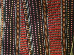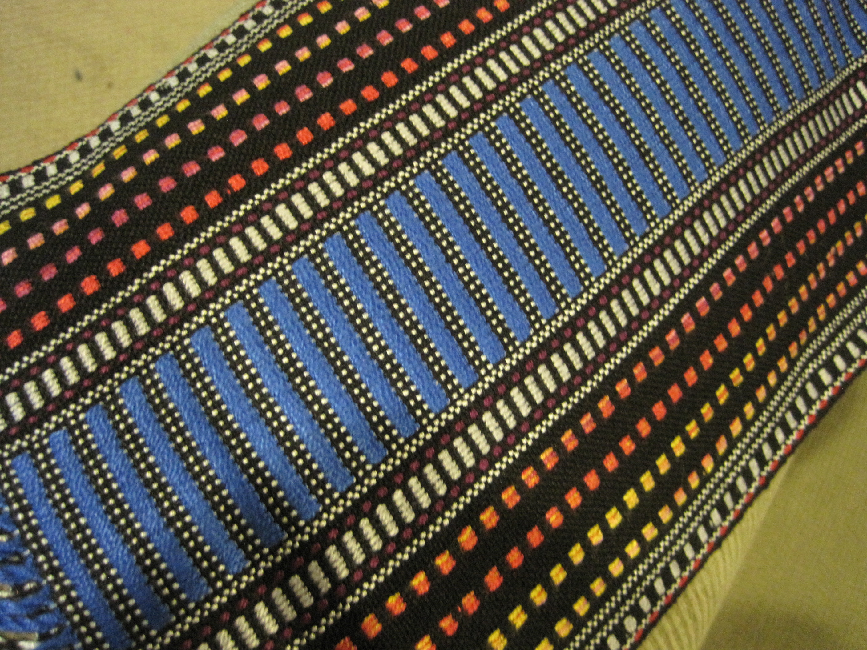 The idea for these came from seeing a similar piece on Pinterest, with a link back to the blog of “gangewifre-dot-blogspot-dot-com”, who, in turn, was inspired by the weaving of artist Juanita Giardin.  Circles within circles as ideas are passed on from one weaver to the next, and to the next in a craft that has endured for thousands of years.  Examples of supplementary warp fabrics can be found across many times, places and cultures, from as early as  5th century Southeast Asia, pre-Hispanic Peru and Ecuador, 18th century Europe and Scandinavia to modern times.  Contemporary weavers have an abundance of yarns and colours to choose from, keeping everything fresh and exciting.  Mine are woven in richly-coloured Tencel, with the supplementary colours on top of a black and white ground.