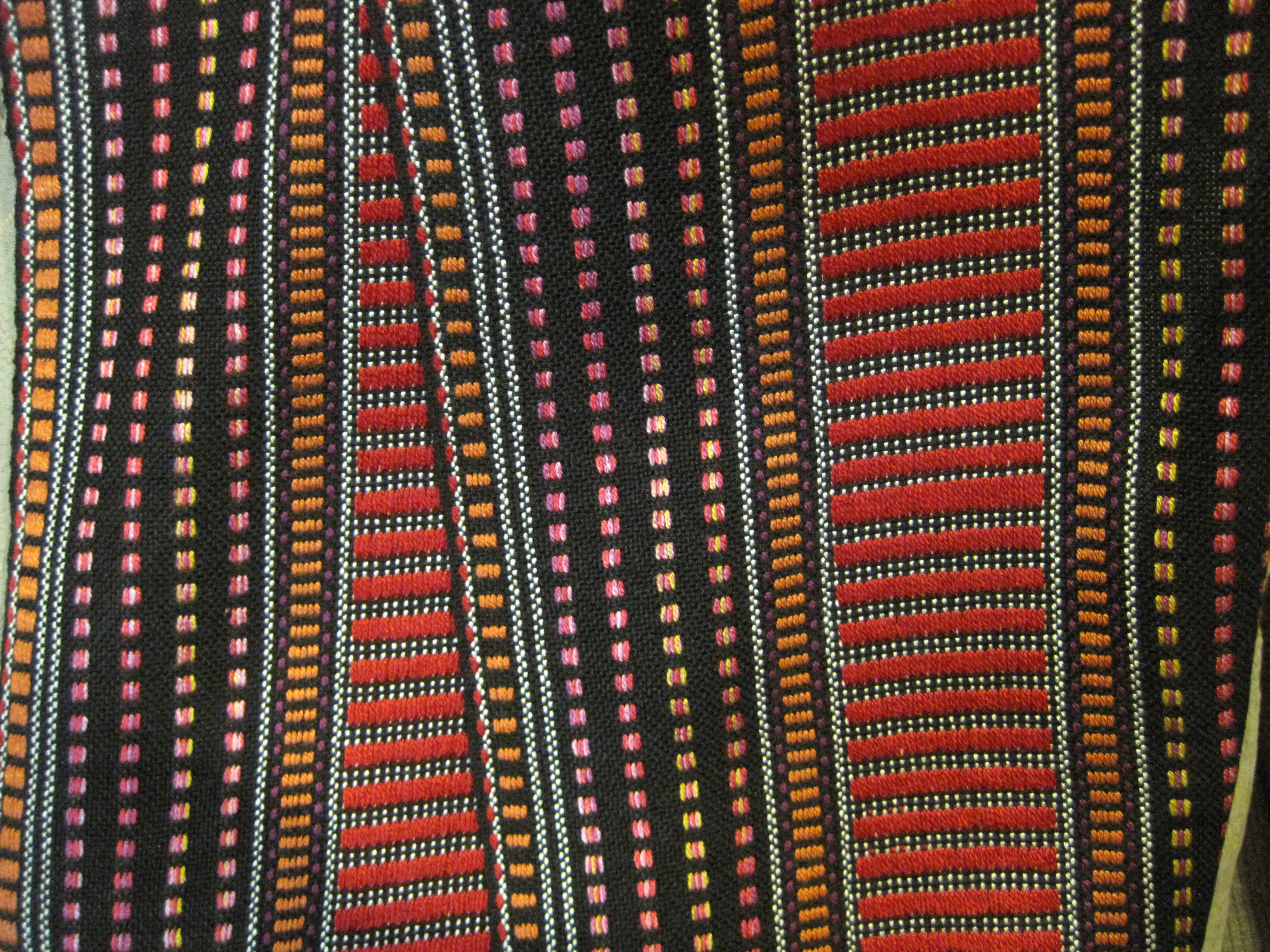 In supplementary warp technique, the extra pattern-making threads float over and under a ground warp, usually plain weave. What a wonderful way to add a decorative element to an otherwise unadorned piece.  The plain weave ground is threaded on shafts 1 and 2, and the extra pattern warps are independently threaded on the remaining shafts.  The extra shafts are lifted for a while, allowing the pattern threads to float over the ground, then, as the shafts are lowered, they interlace through the cloth and continue to float underneath.  The over and under, over and under rhythm continues, making beautiful dots and dashes of colour.  Different patterns can be made, depending on how many independent shafts are available.  For an eight-shaft loom, like I have, there are six independent shafts.  The scarves I wove have a 24-pick repeat, and so are more easily accomplished on a table loom.