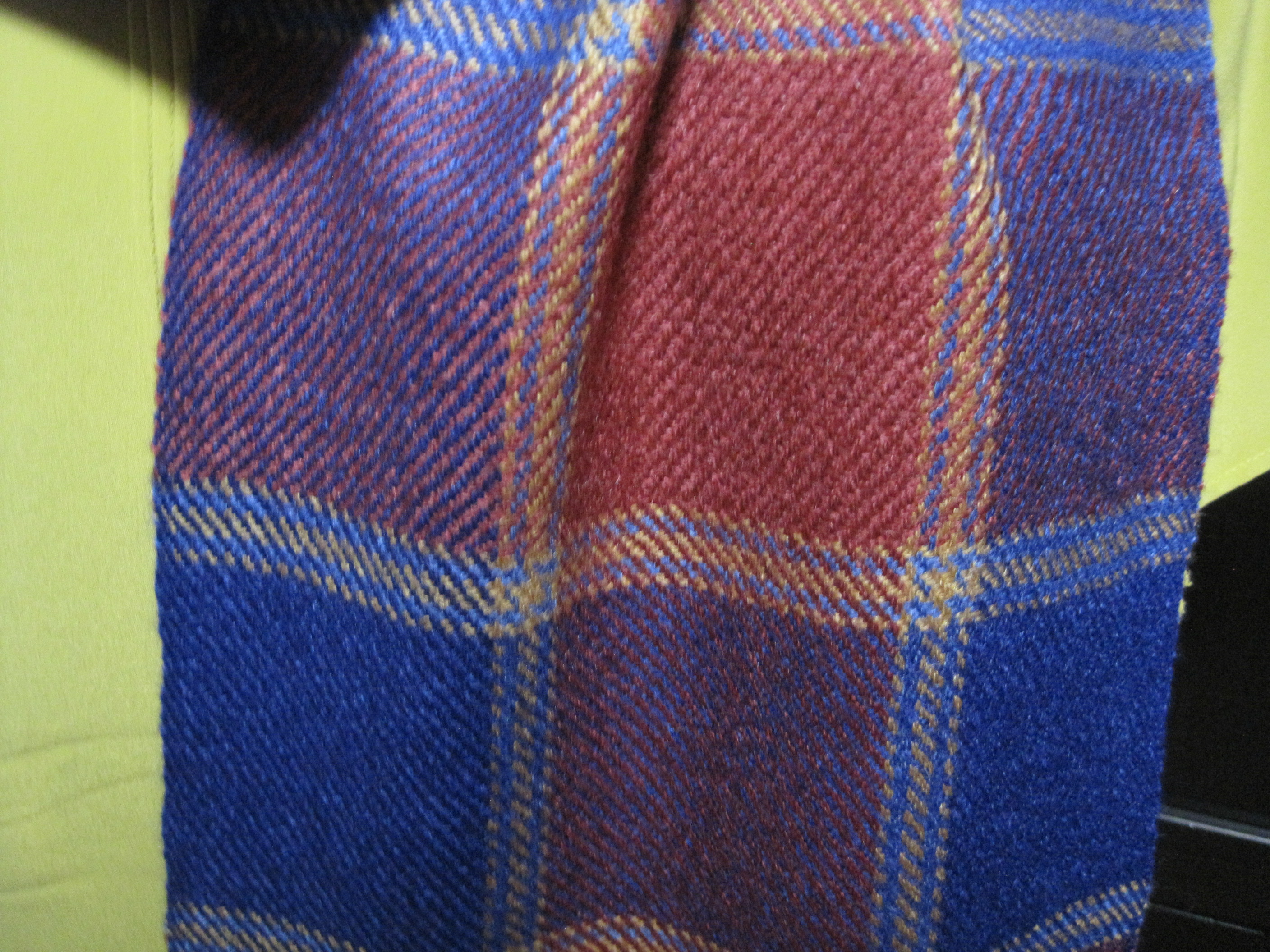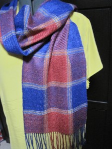 The second, a primary plaid, using the same colours that are in Fadia’s scarf.  This one is woven in straight twill for my son Mike.