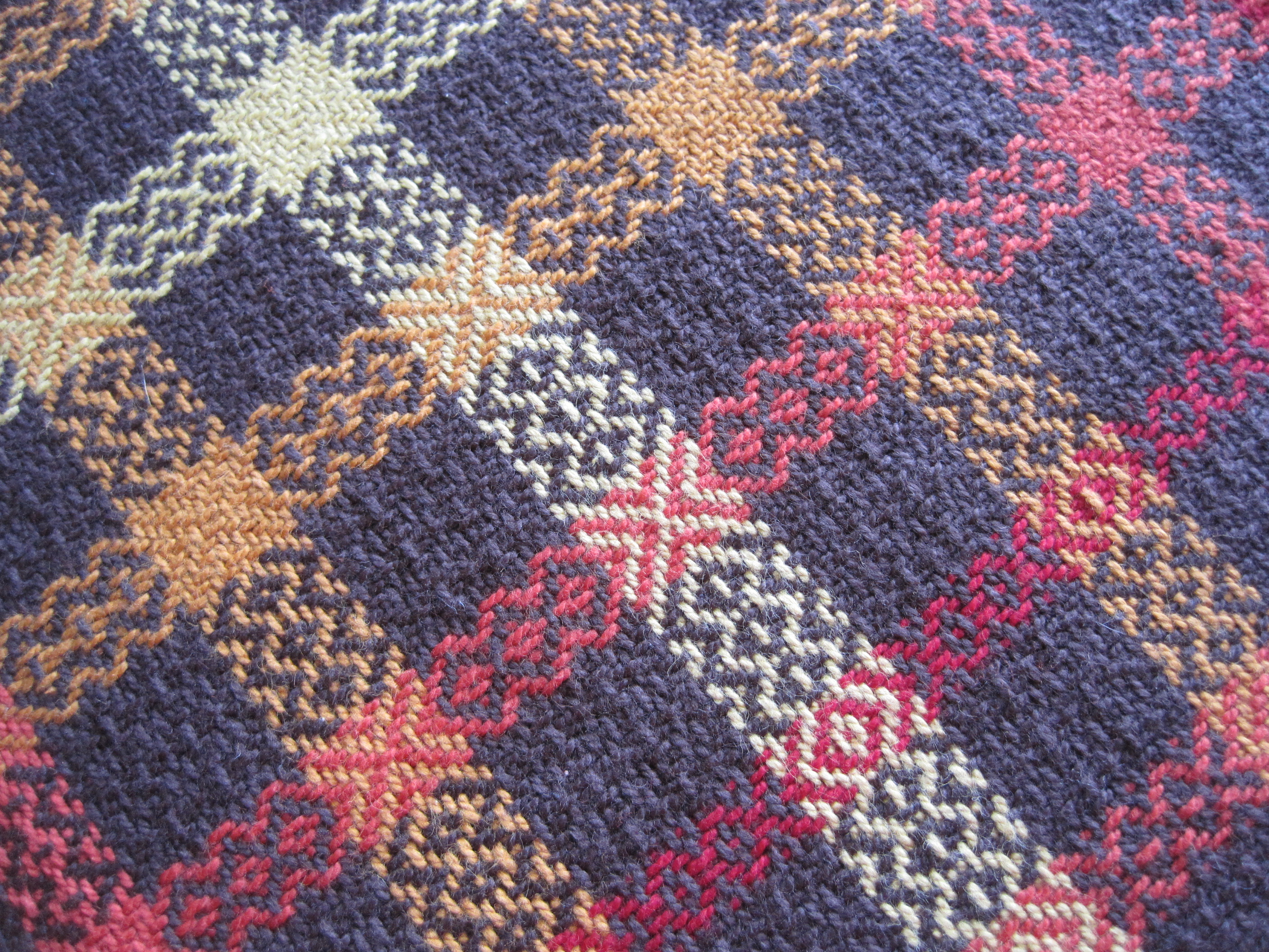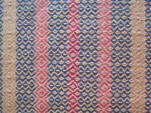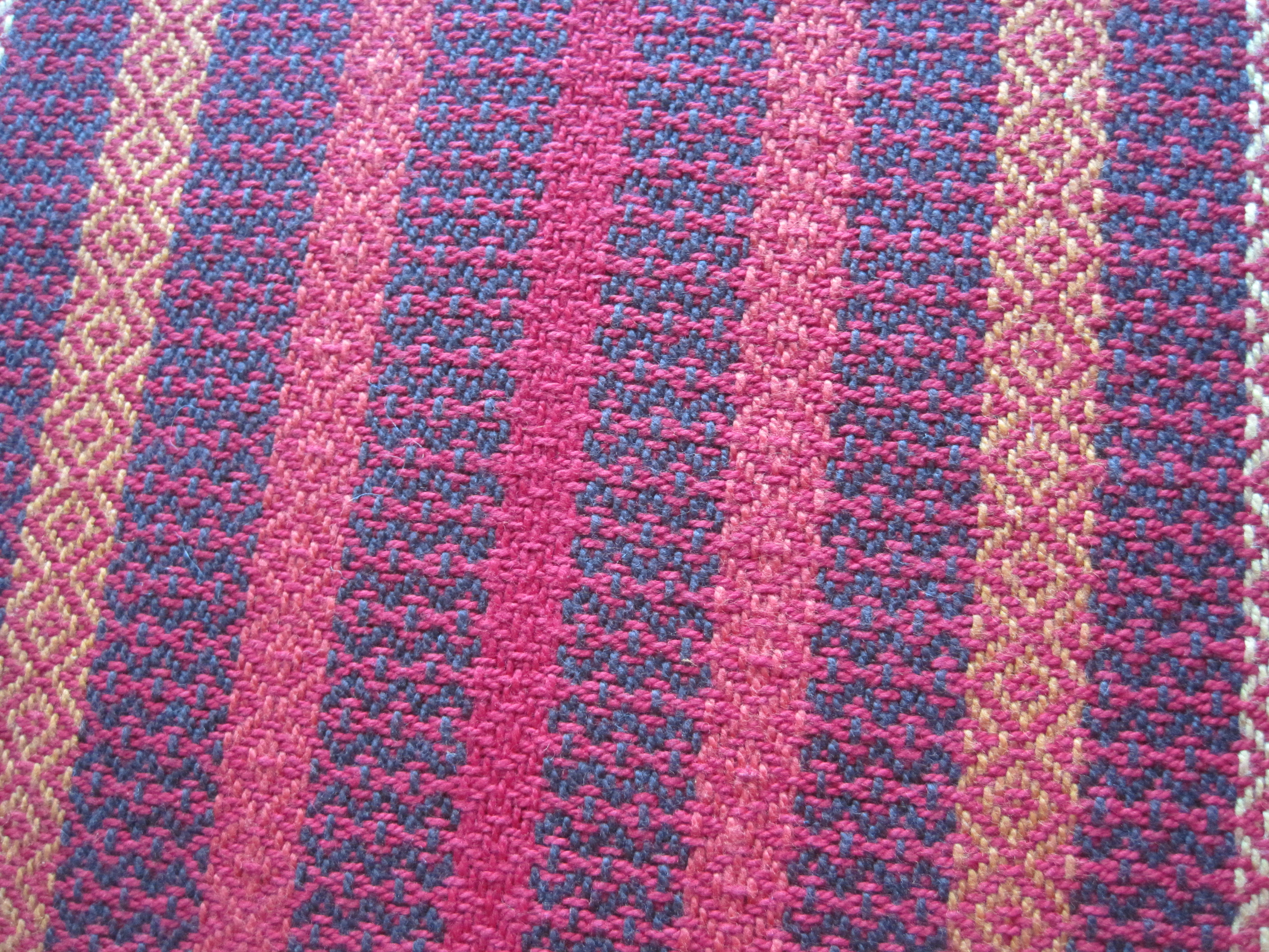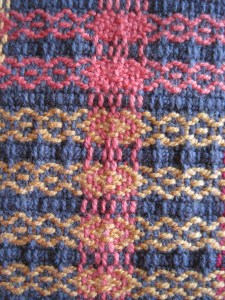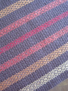 . And finally, a table runner that picks up all the colours, woven in a combination of 9 shots of Rosepath followed by three shots of plain weave. The middle plain weave shot has four threads held together to add weight and texture.