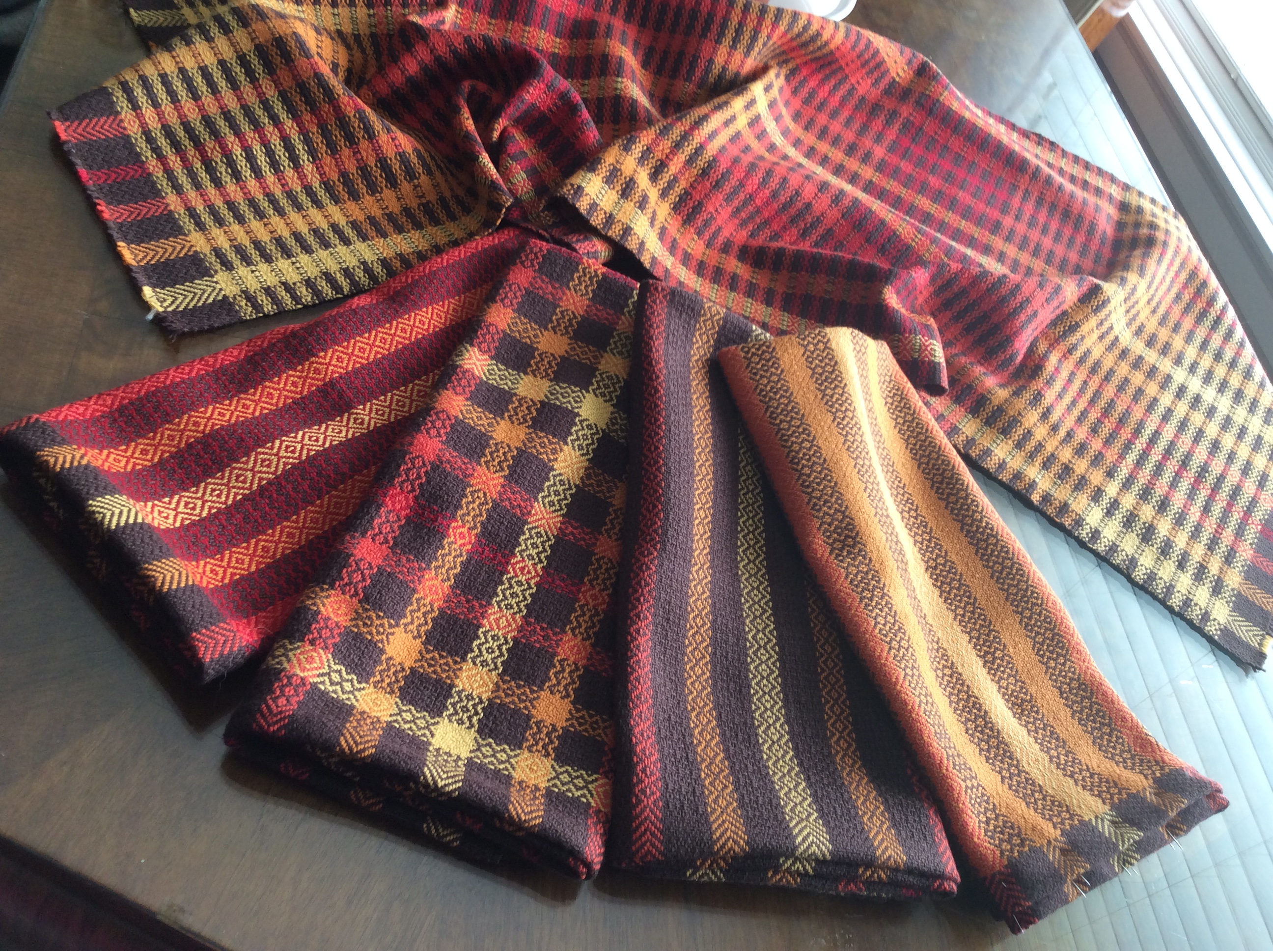 Four towels, freshly finished, in spice-coloured stripes on a simple, point twill, dark brown background. The stripes move up to a point and down again in increasing widths. One towel repeats the warp stripes to form a plaid. The other three towel feature one weft colour throughout, with dark brown hem emphasis. The colours are much brighter than the pictures shown. – gold, cherry red, tumeric and brown.