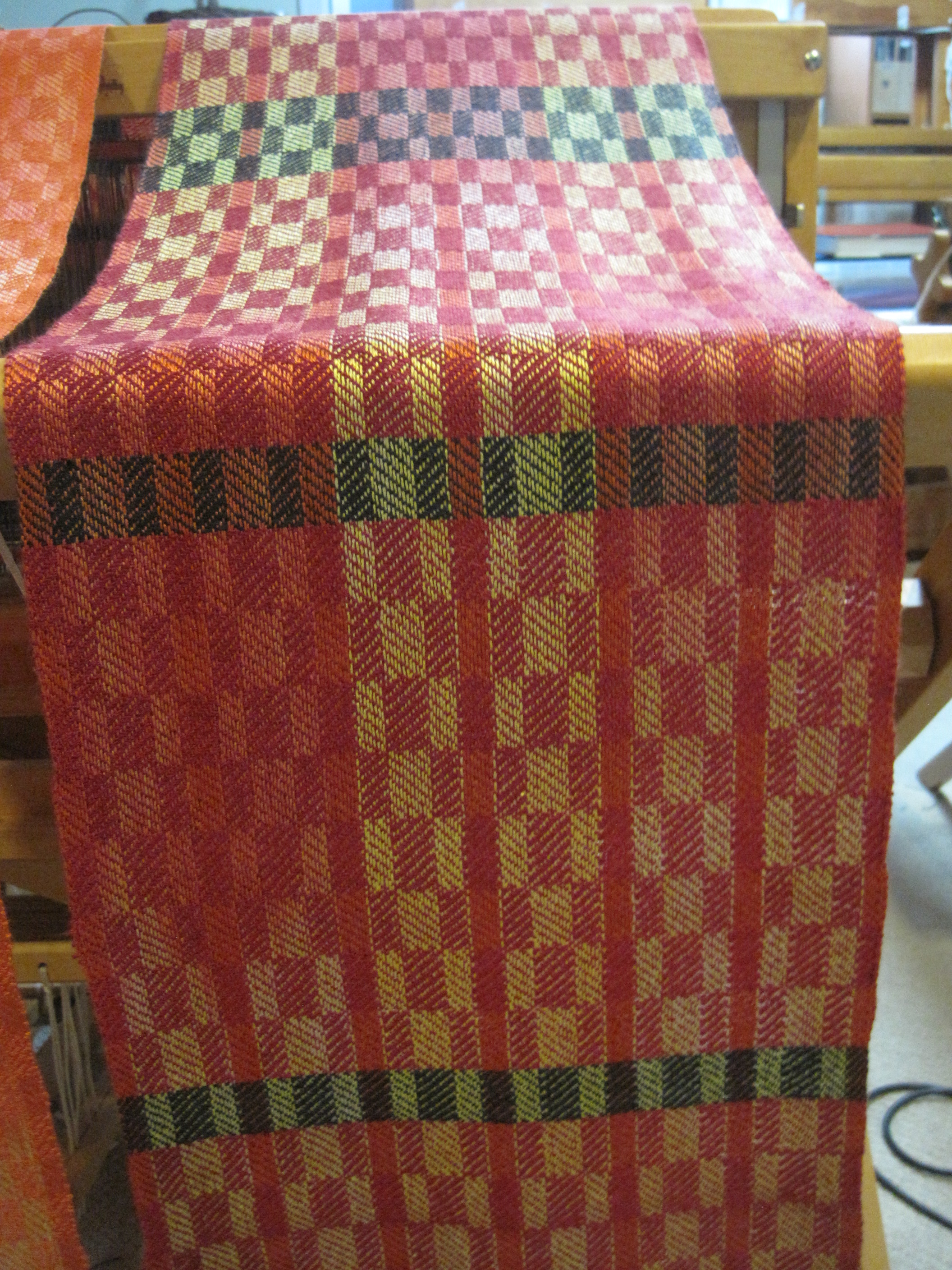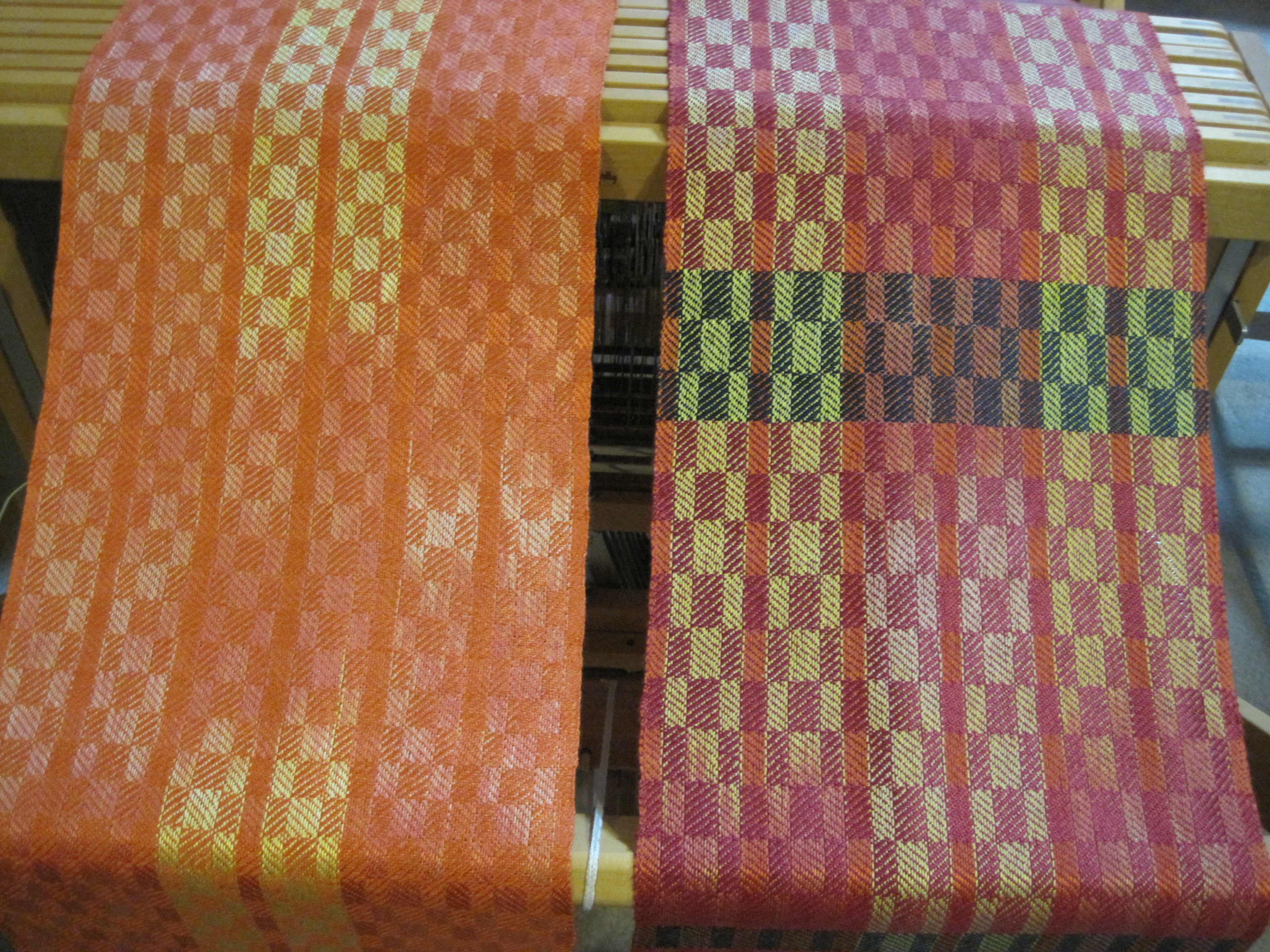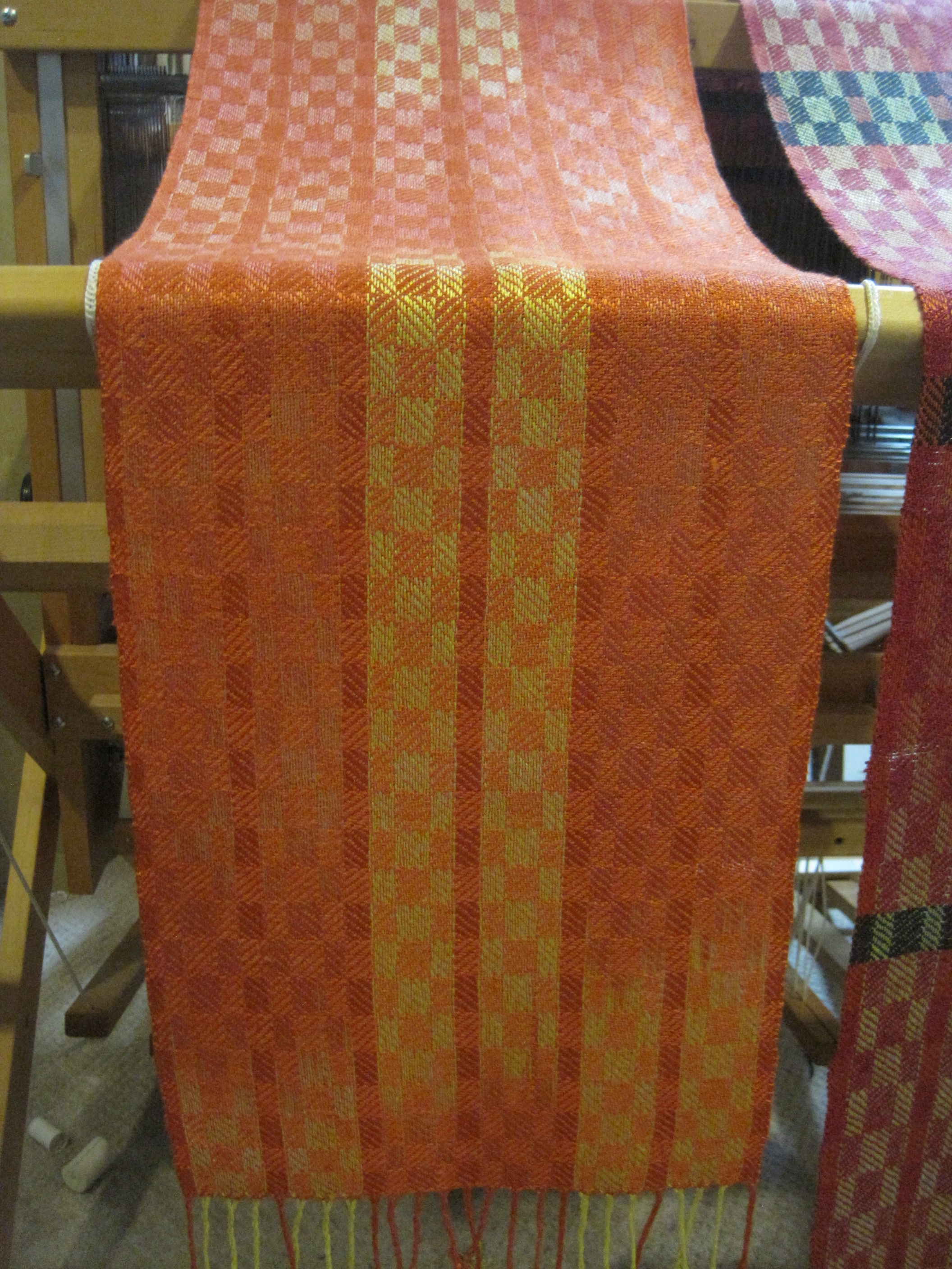Here is another project I finished this spring. Two scarves woven on a hand painted warp in orange and yellow. Where the two colours overlapped, a beautiful coral emerged. The warp was painted in a workshop with the lovely Liz Moncrief.