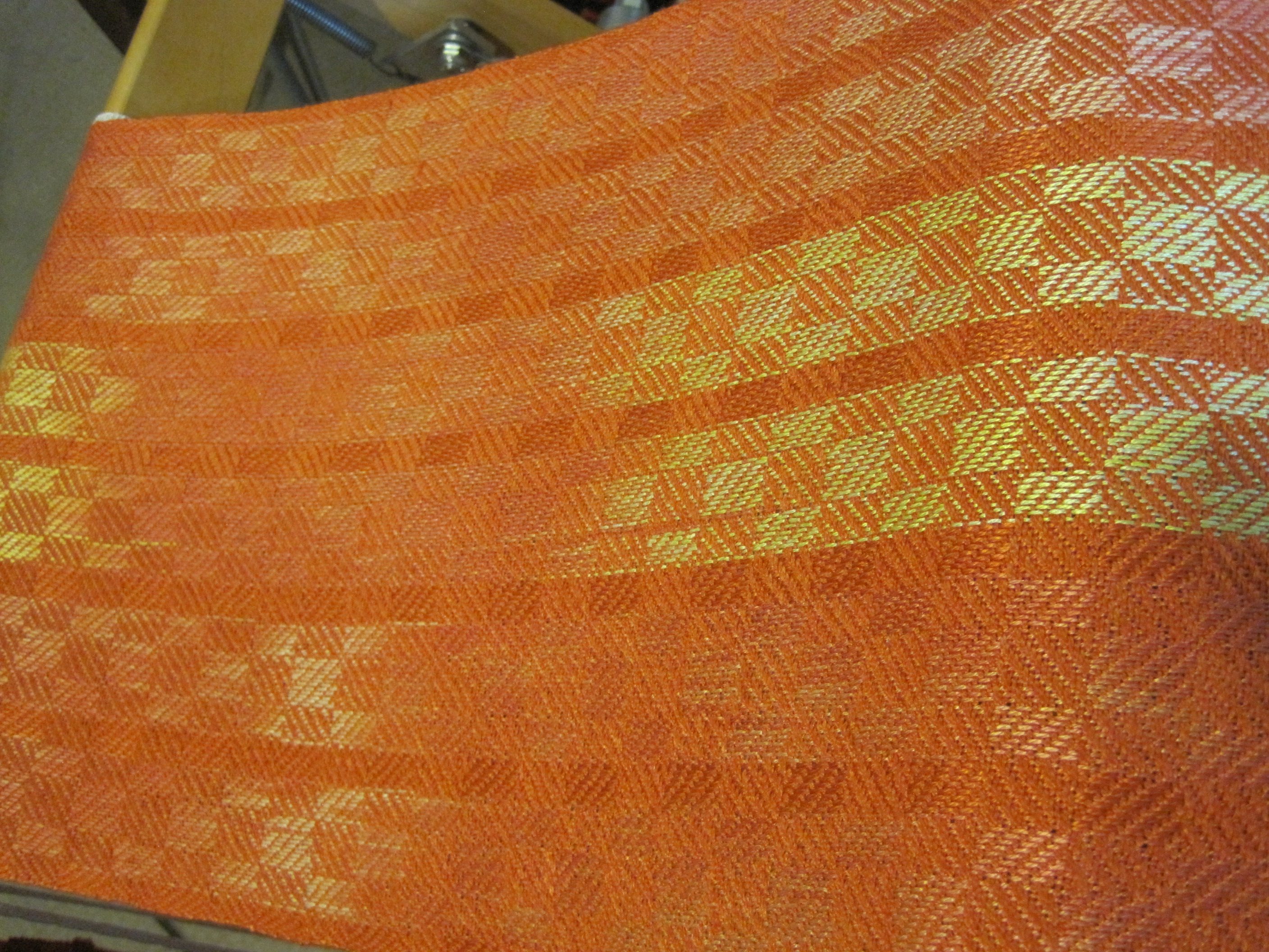 When I made the warp, I added some plain Coral Flame silk to the painted silk warp, and wove the first scarf with the same coral as weft. Woven in an eight-shaft turned twill. It shines like a summer day.