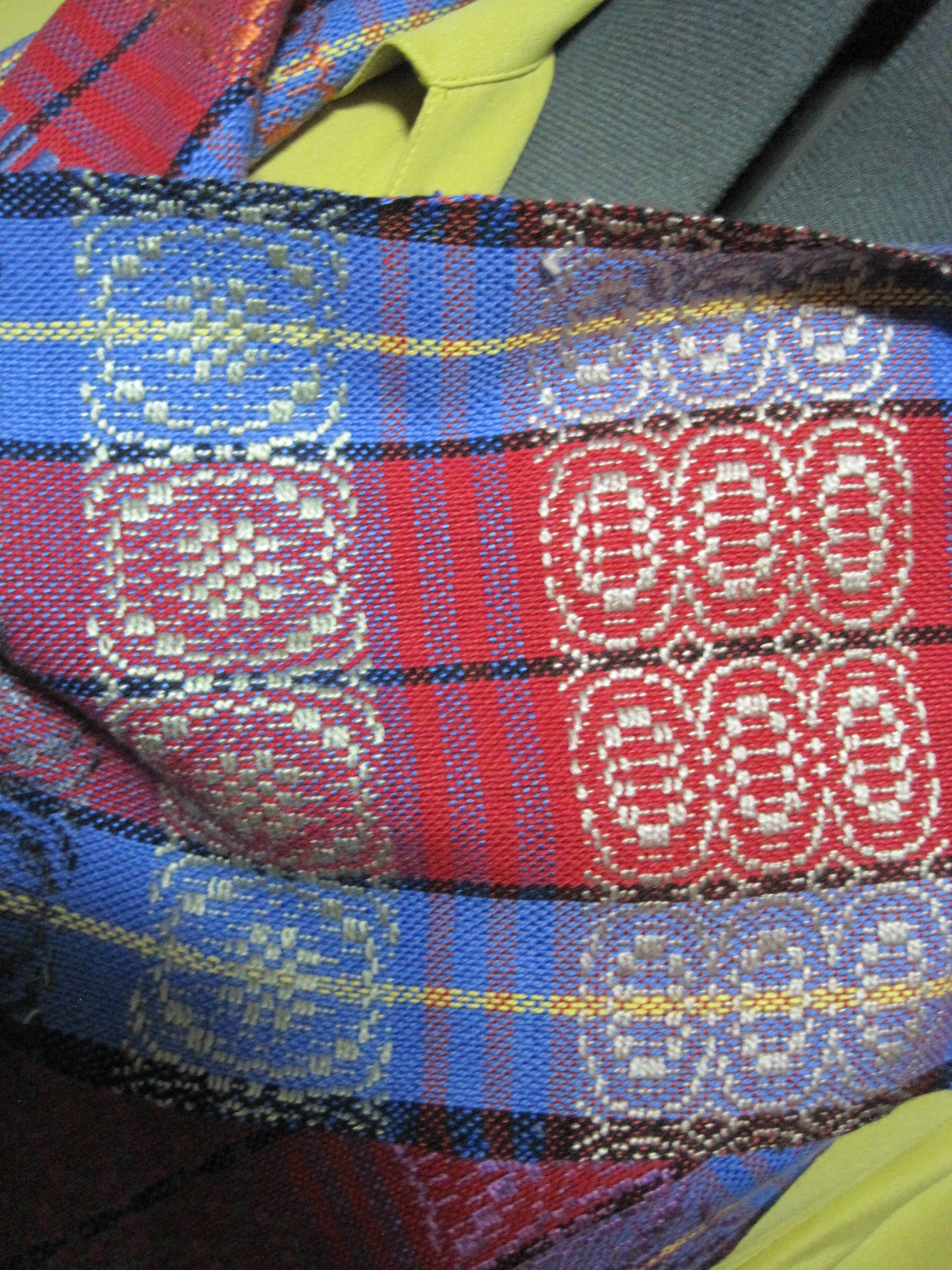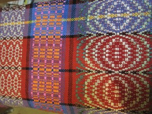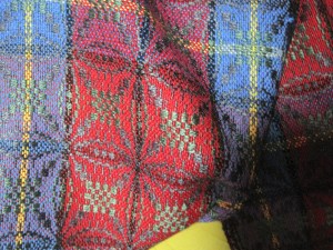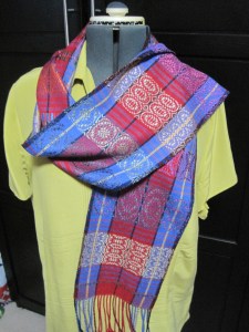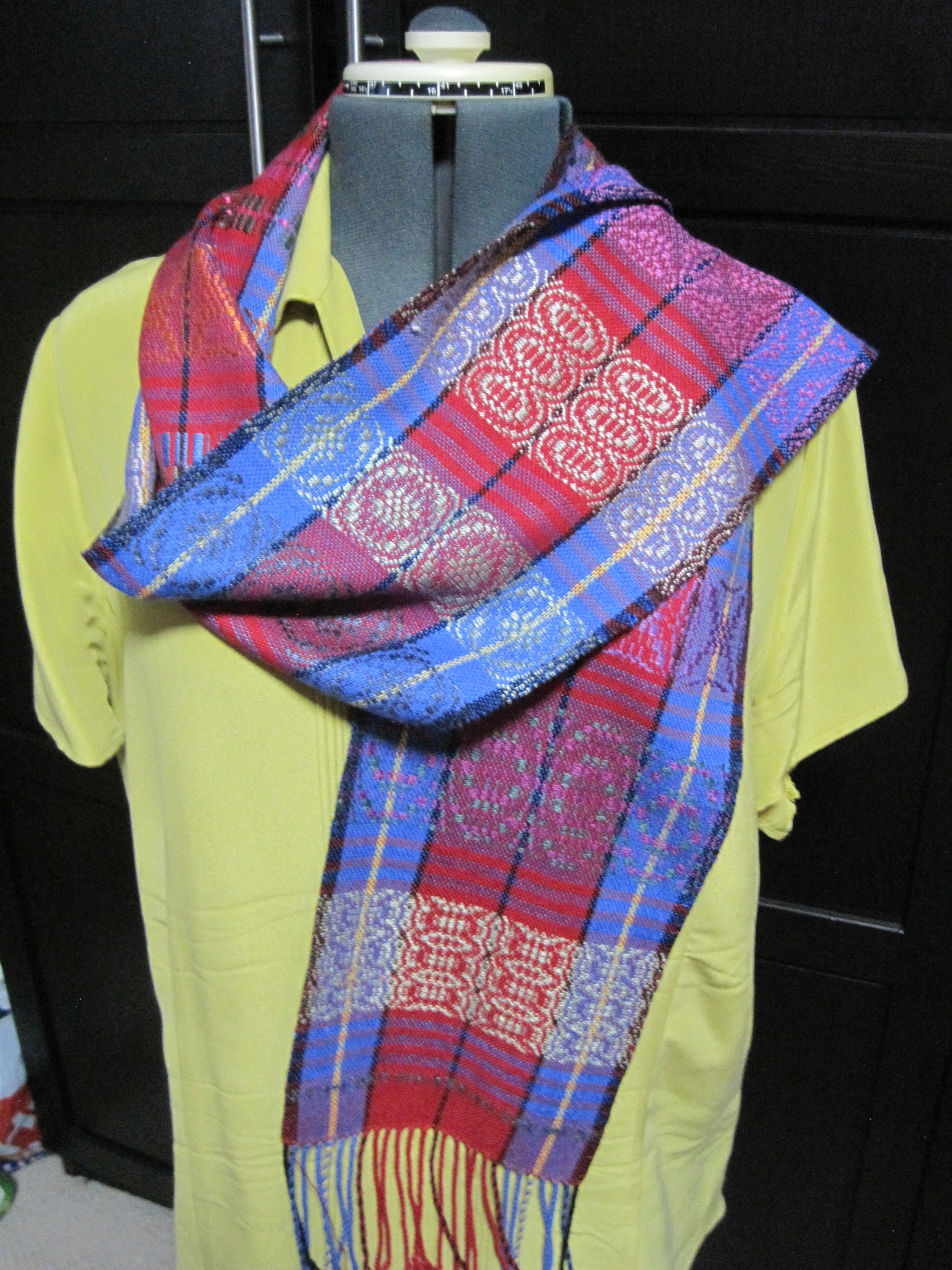 For the second scarf, Robyn Spady’s influence came out to play.  I wove the overshot pattern in a “what if, as if”, manner.  What if I switched colours as I went along?  What if I treadled the pattern as if it were summer and winter, or as if it were twill or monk’s belt, as if it were crackle, as if it had extensions, was treadled in rose fashion, or treadled in inverted order?   Skip the plaid squares, alternate sections of blue tabby and sections of red tabby.  Then add in some transitional stripes to separate the motifs.  Woven from bobbins of bright, colourful 2/20 silks leftover from other projects it became a joyful, jubilant song.