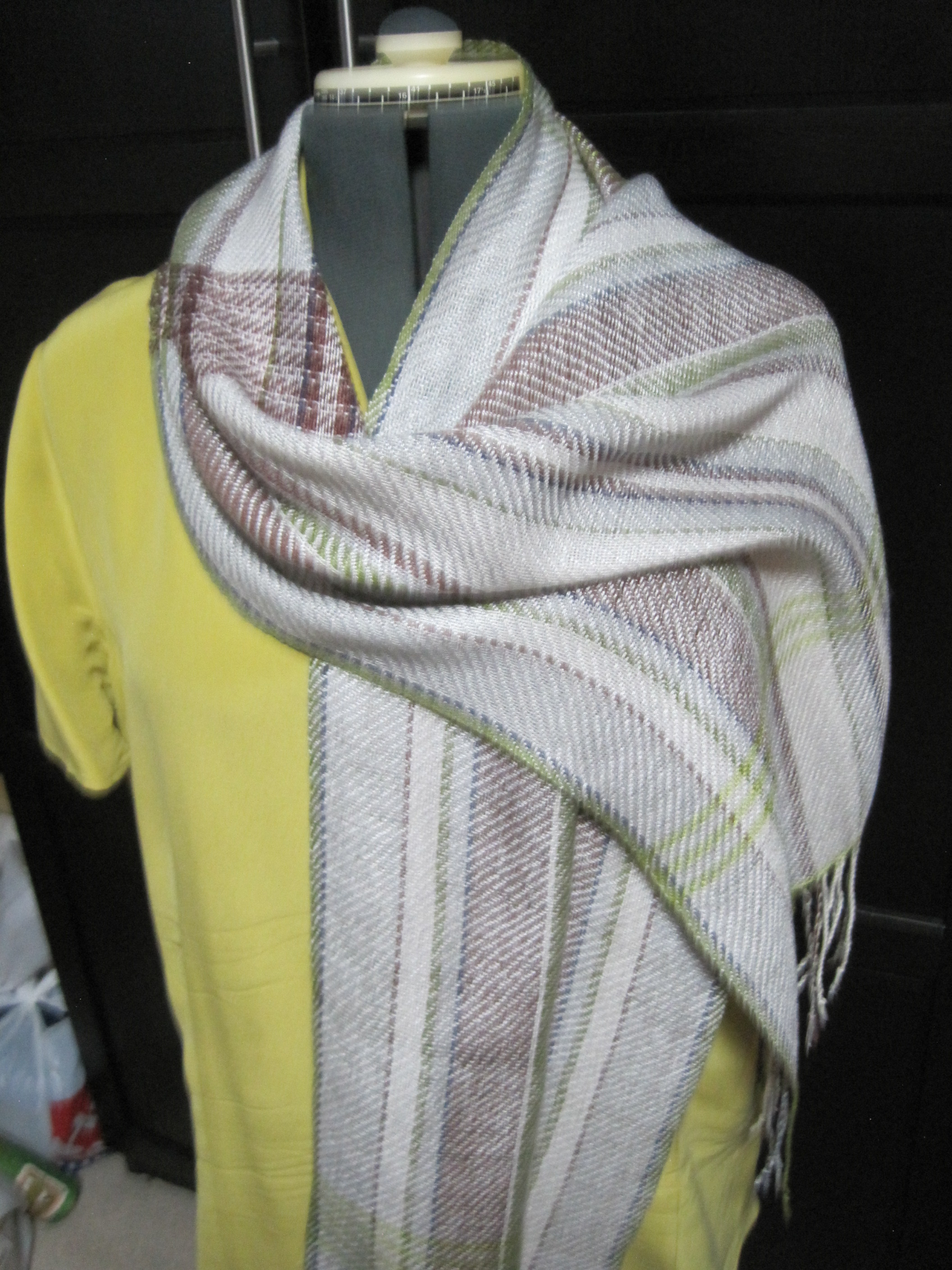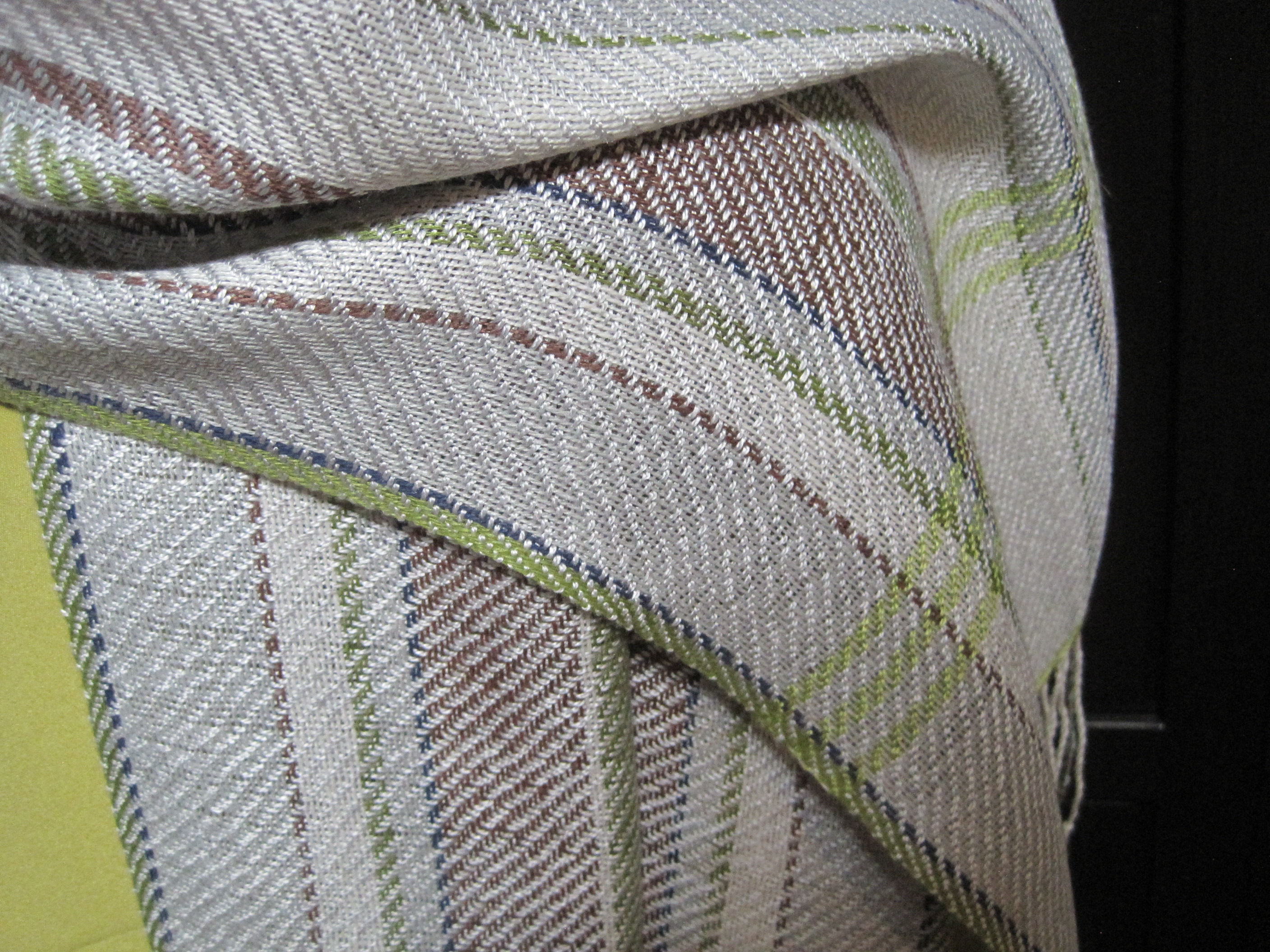 One scarf with silk weft. Straight draw 2/2 twill. A few random linen stripes along the way. It has the softness, luster, and drape of the silk, and a little of the crunchiness of the linen. Rustically beautiful.